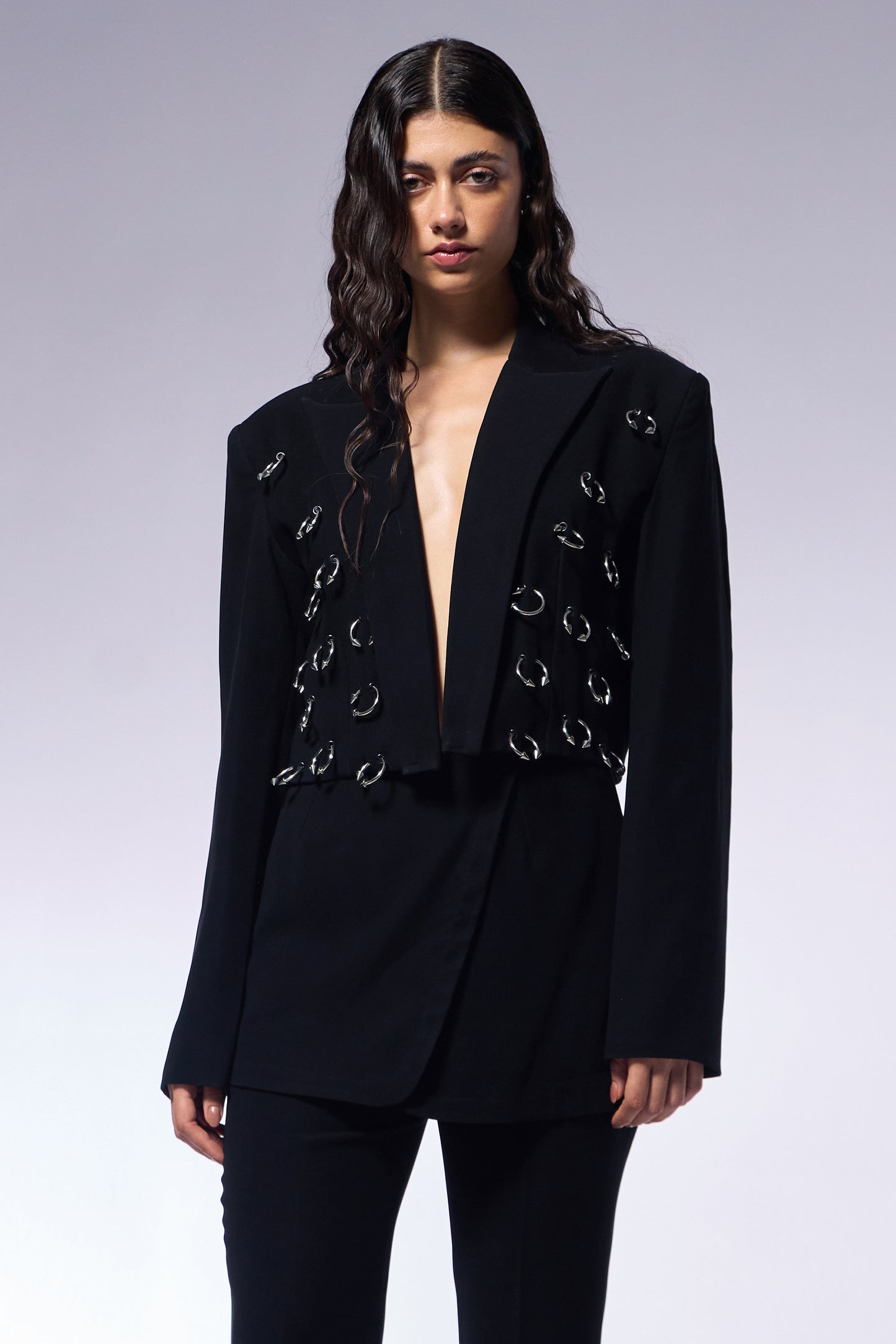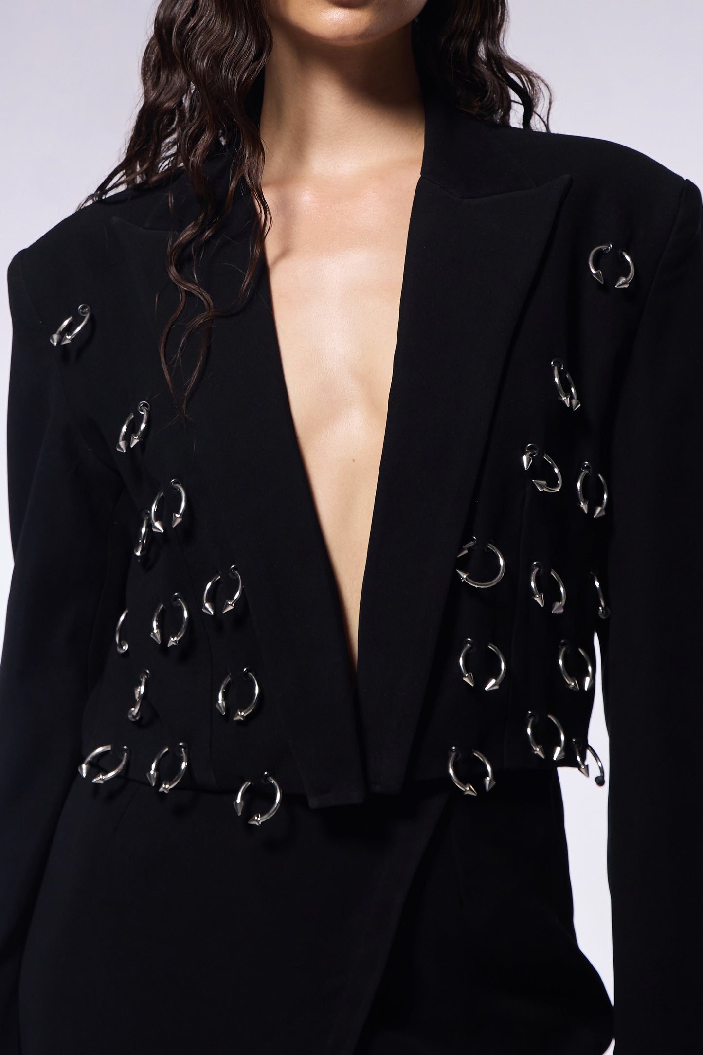 An avant-garde cropped blazer with hand-embellished metal septums, blending contemporary tailoring with bold statement.