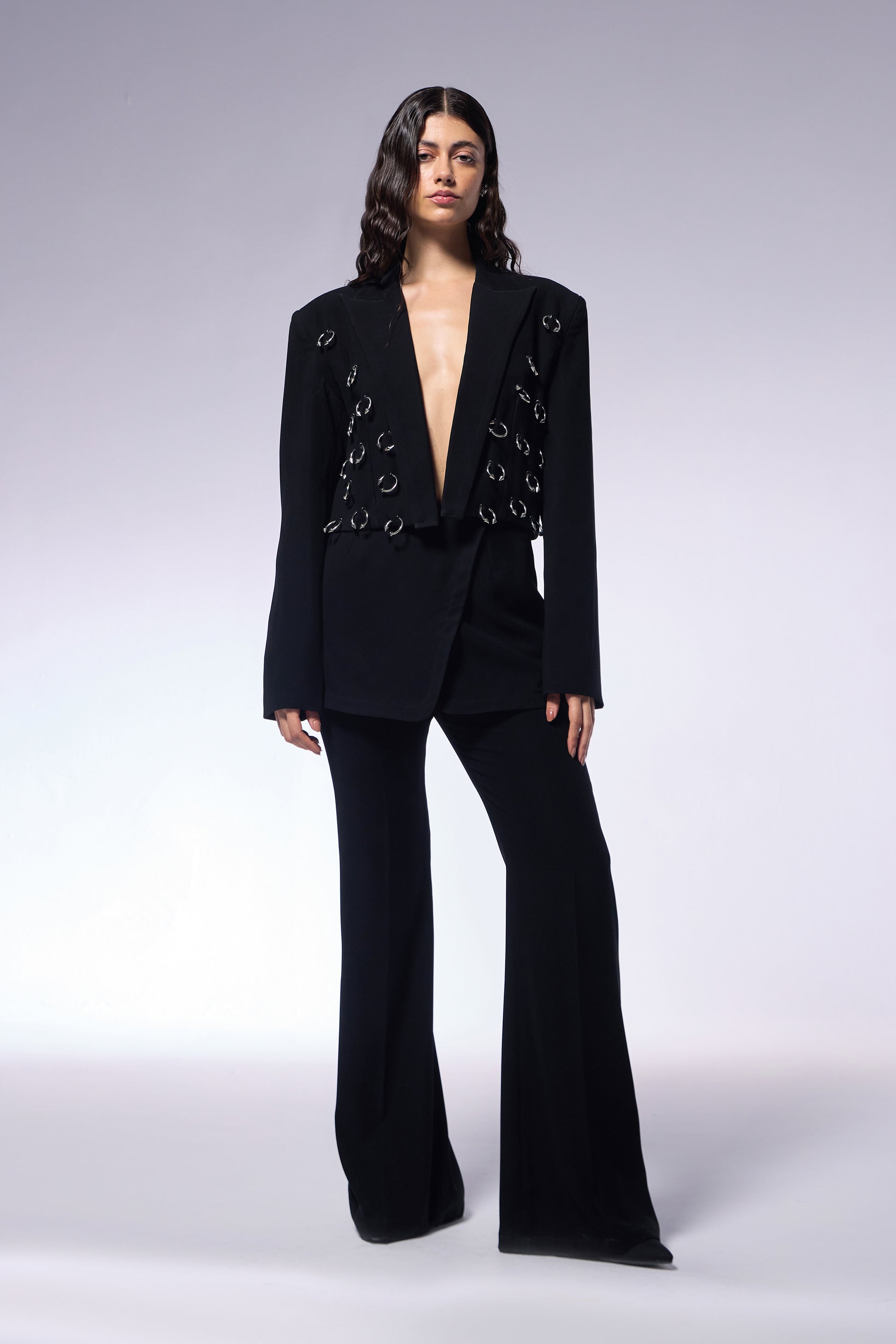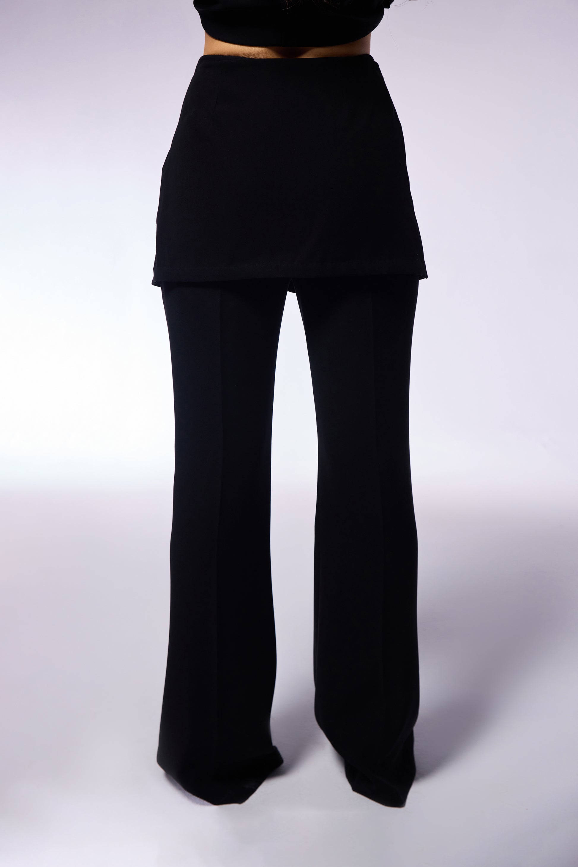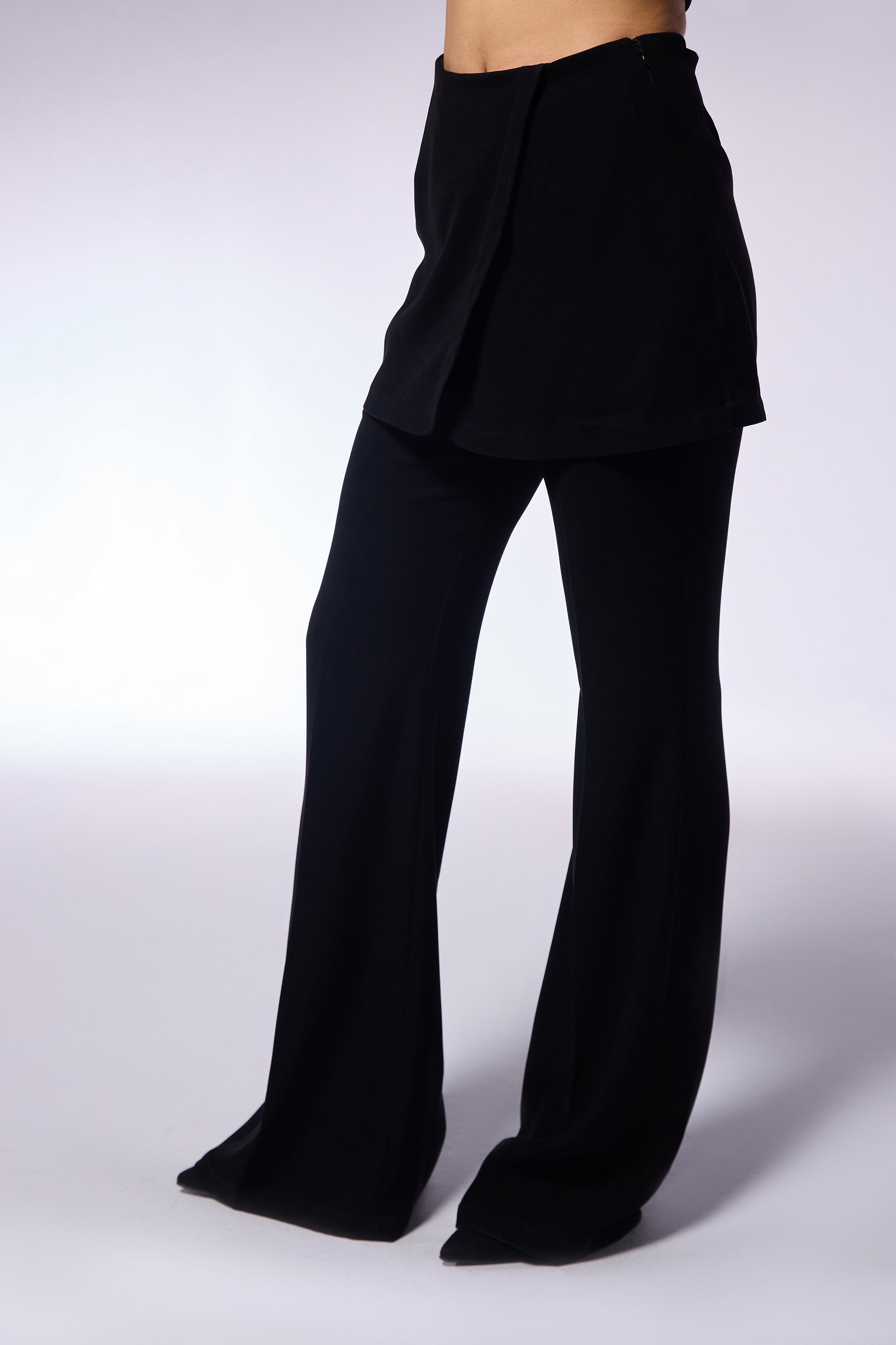 A pair of light grey skouser-style wide-legged pants, offering a sleek and contemporary silhouette.