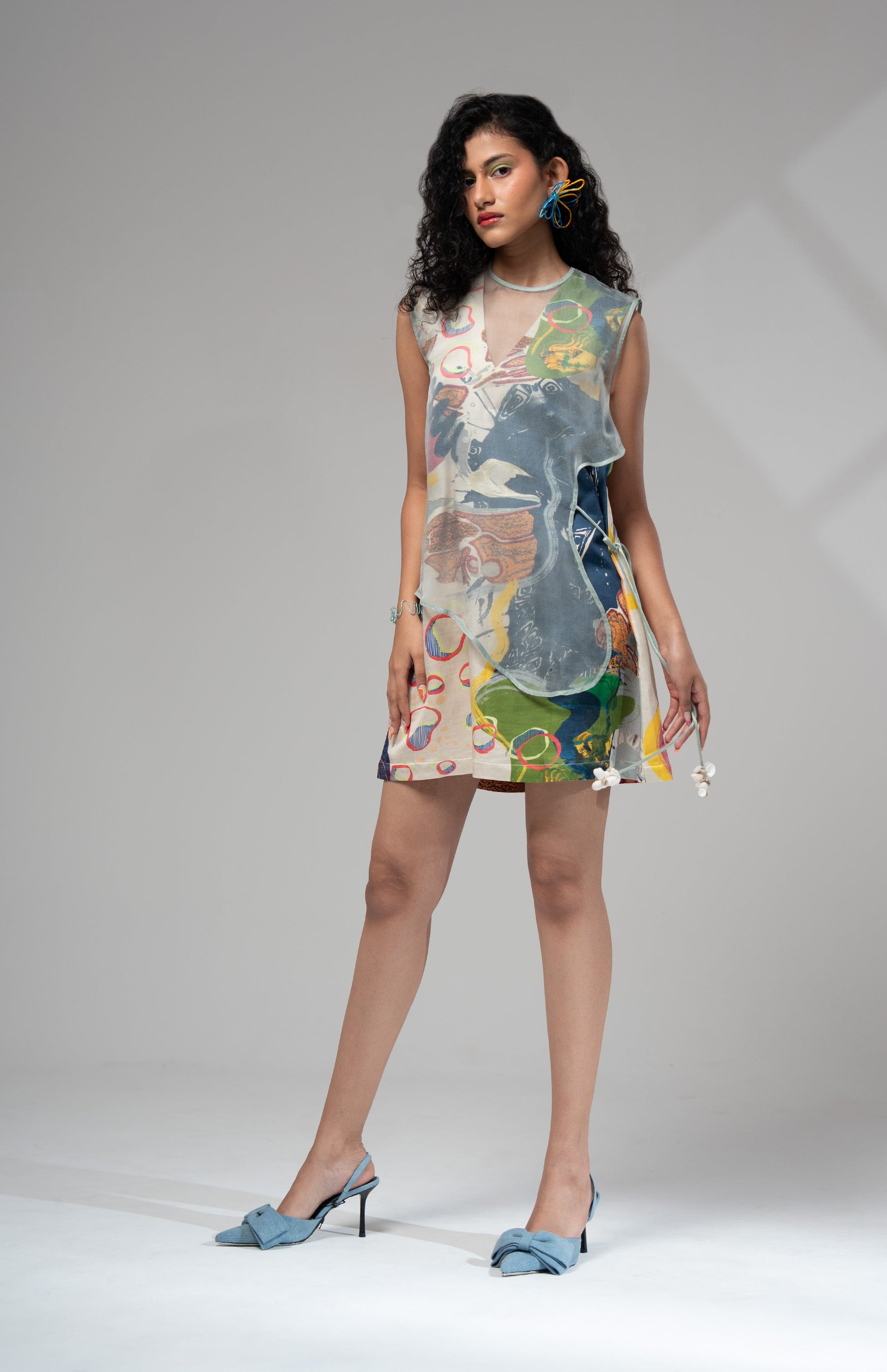 An A line V-neck short dress, perfect for summer days. Comes with an additional silk organza bib that can be overlayed with multiple pieces in your closet. Shell tassels added on the bib.