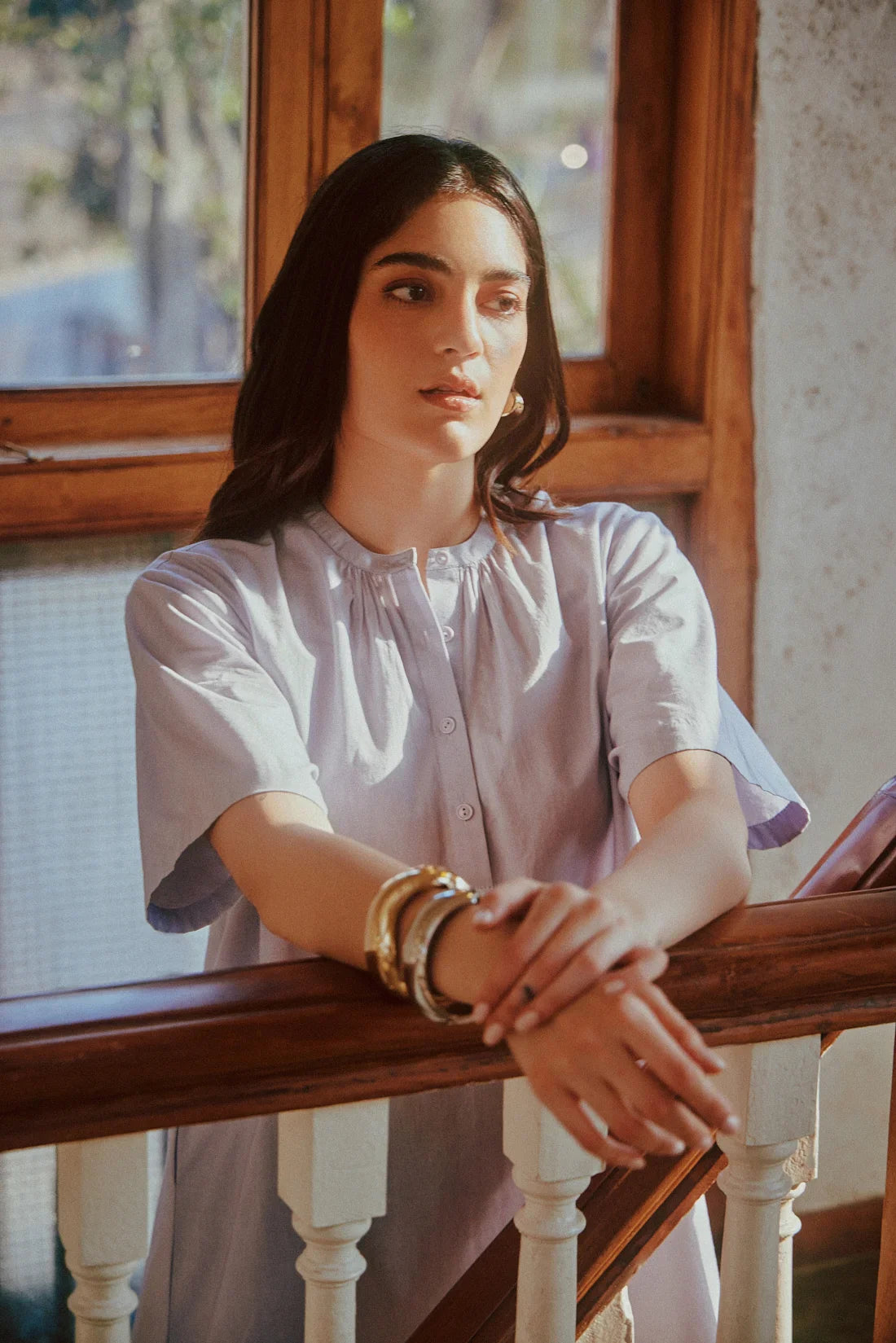 sleek mandarin collar - gathered front & back - side pockets - above knee length - a-line