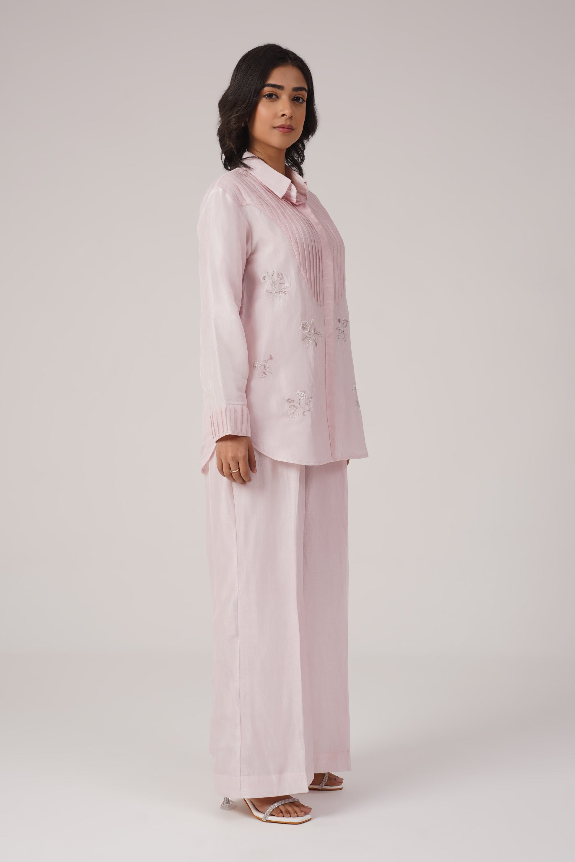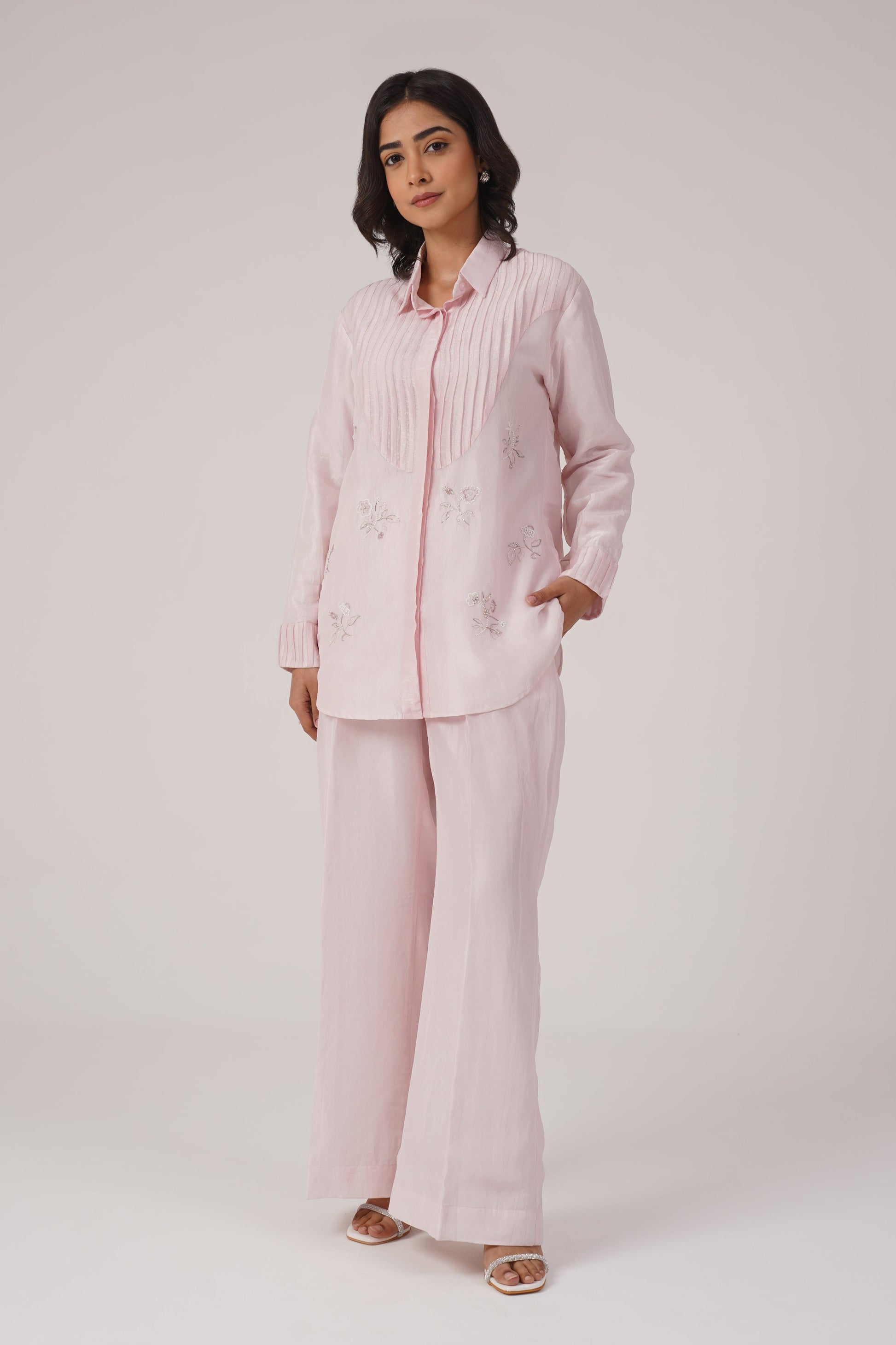 Miri pants have a wide-leg design, crafted from organza and lined with cotton. The belt is plain in the front and elasticated at the back.