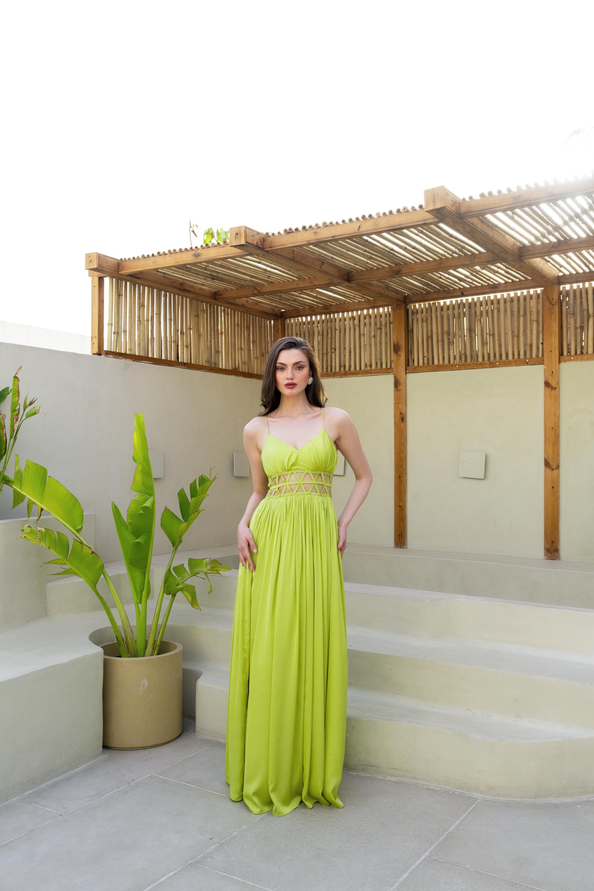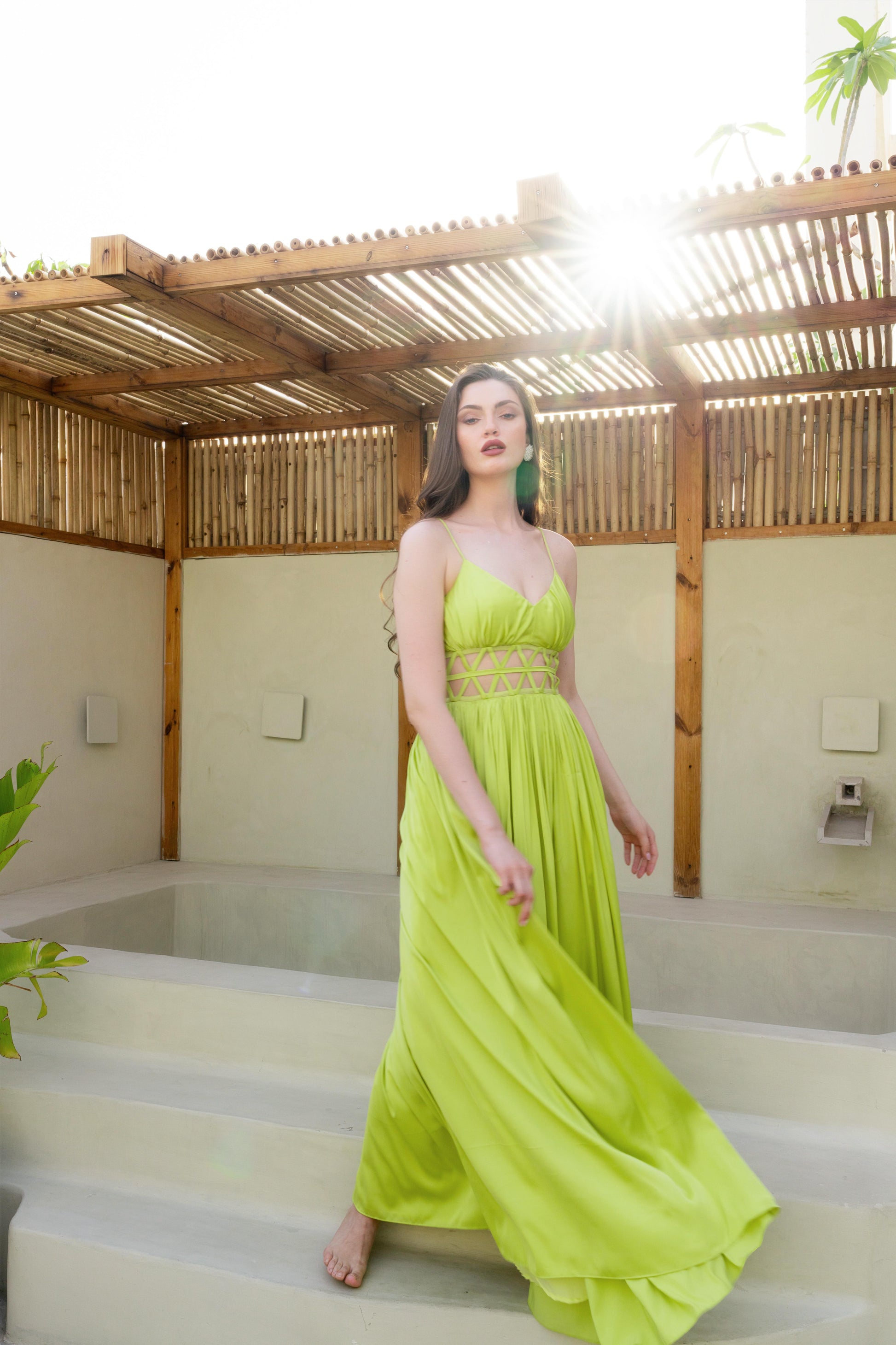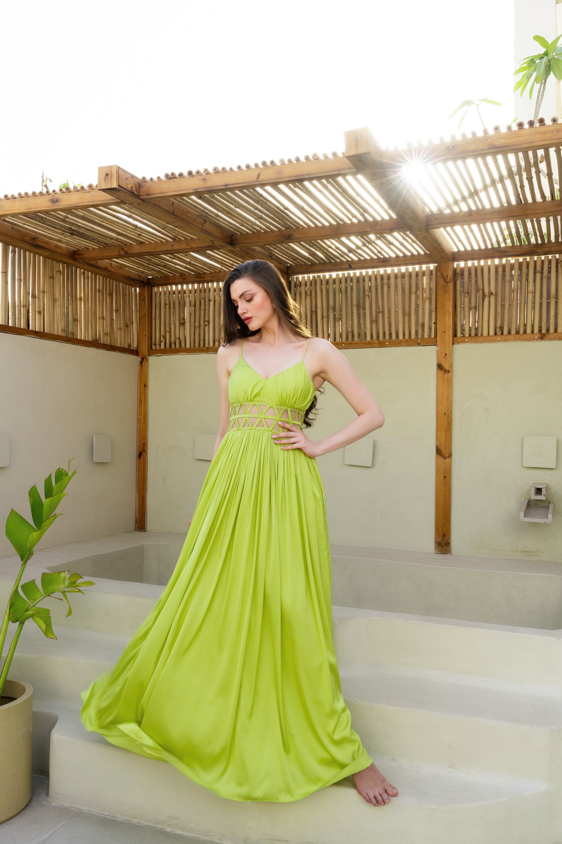 Floor-length breezy gown dress. Mesh detailing on the waist. Invisible back zip fastening.