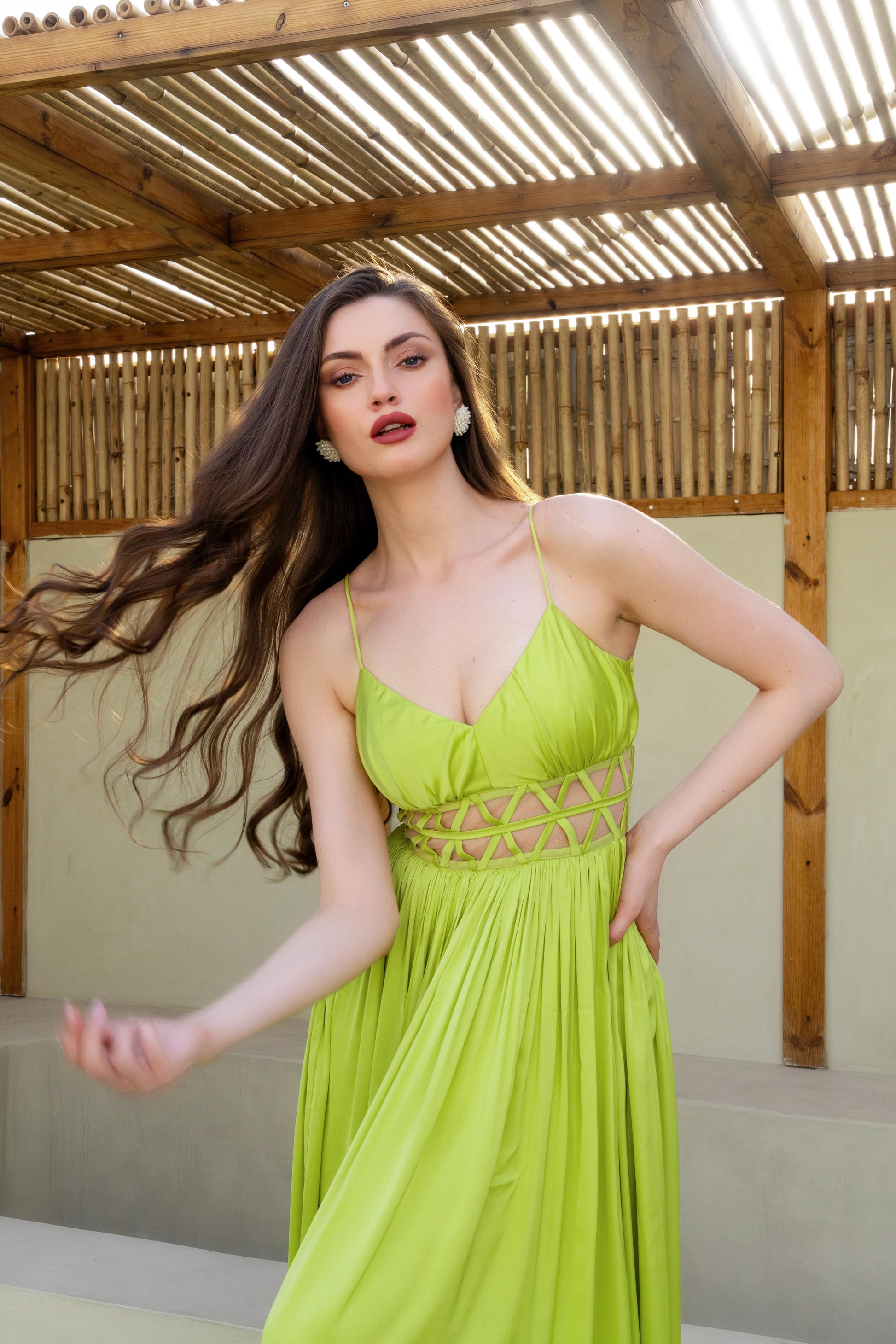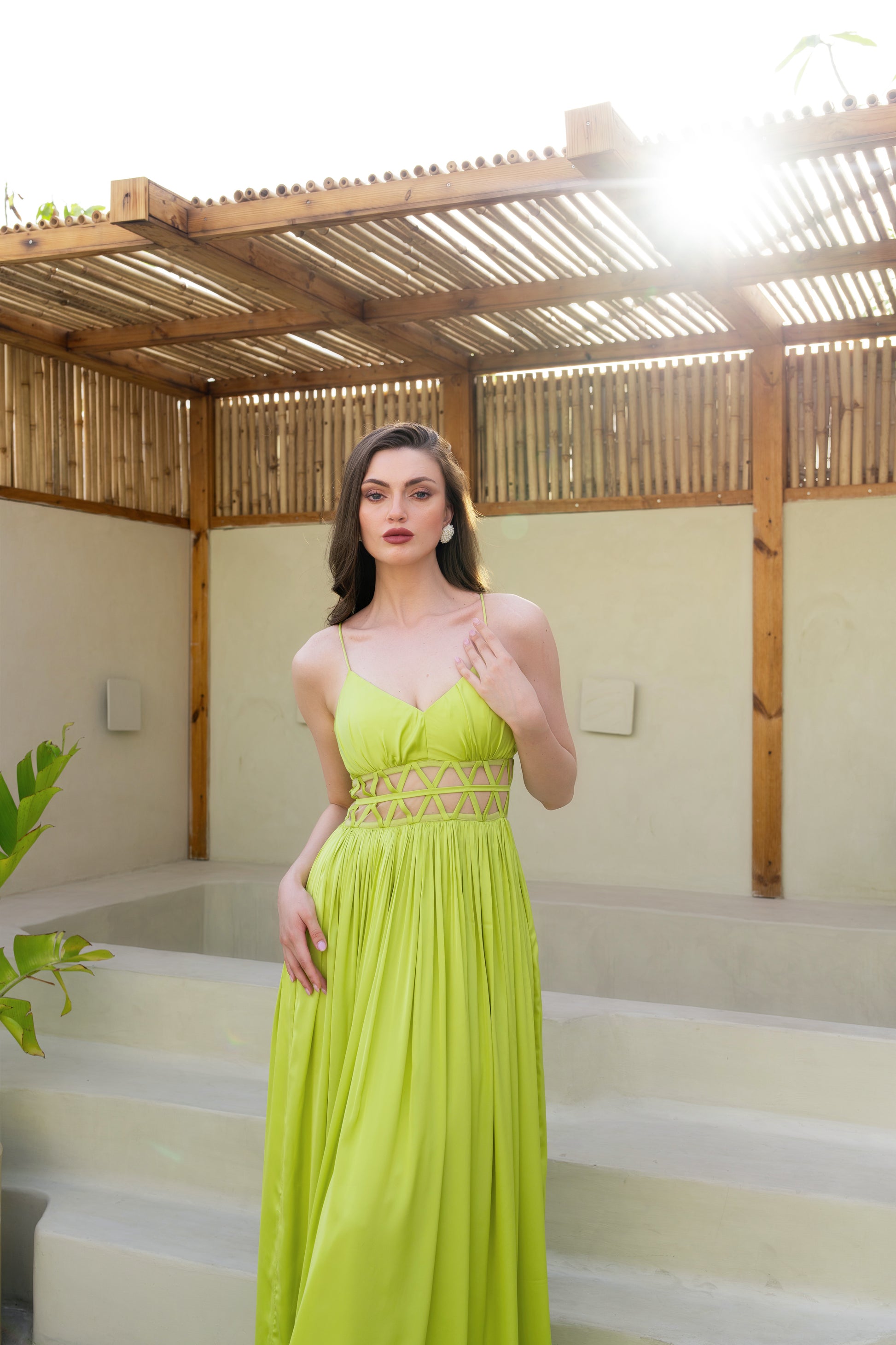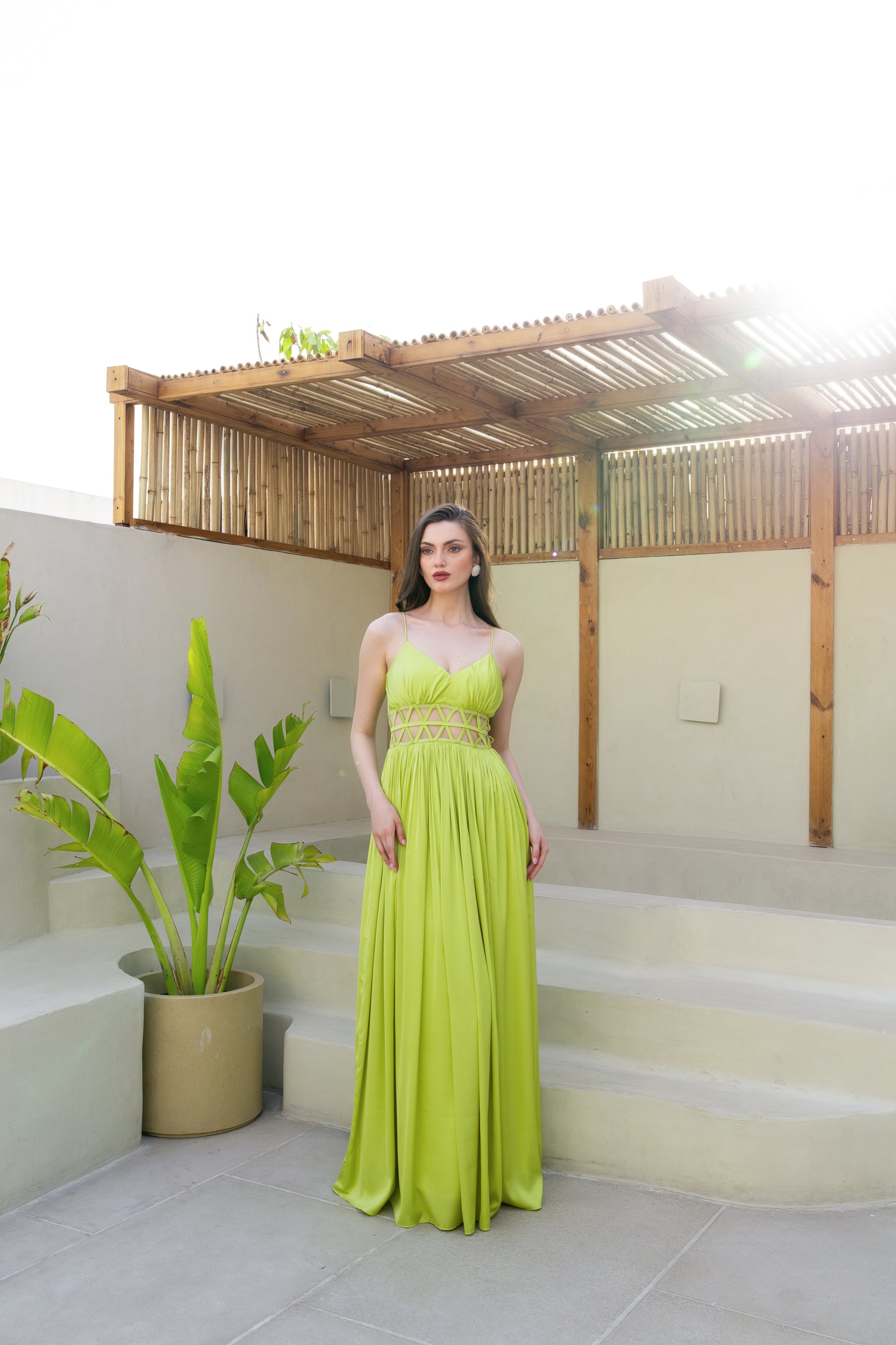 Floor-length breezy gown dress. Mesh detailing on the waist. Invisible back zip fastening.