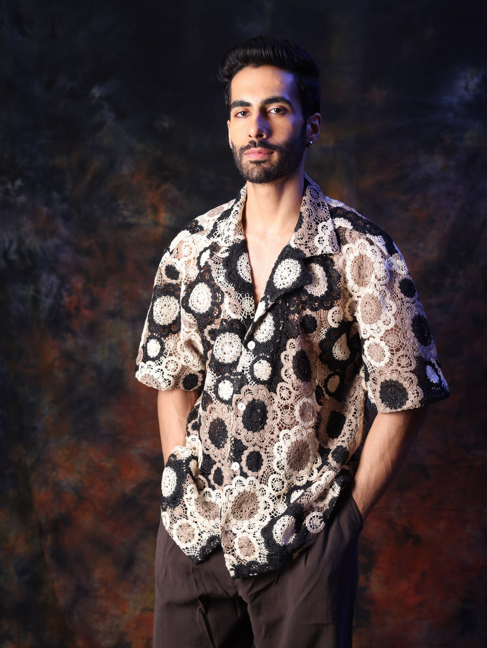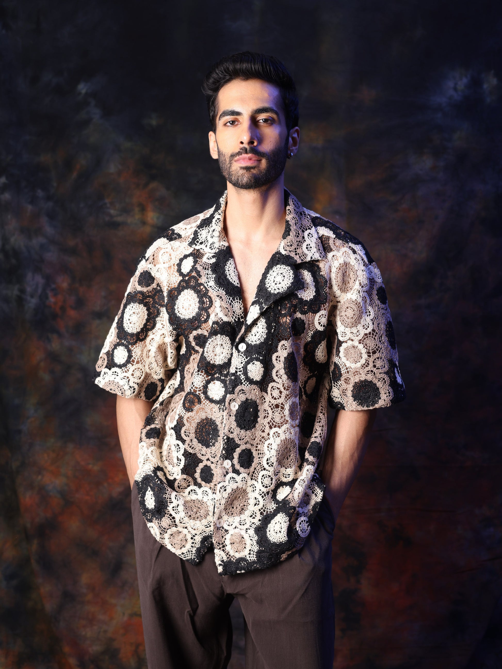 A bold blend of vintage artistry and modern style, the Monochrome Bloom Shirt showcases an intricate crochet lace pattern in a striking palette of black, beige, and ivory. The floral-inspired circular motifs give the shirt a textured, handcrafted appeal, while the relaxed fit, short sleeves, and classic collar keep the silhouette contemporary. Whether styled for an elevated casual look or paired with tailored pieces for evening wear, this shirt makes a confident statement — timeless yet refreshingly current.