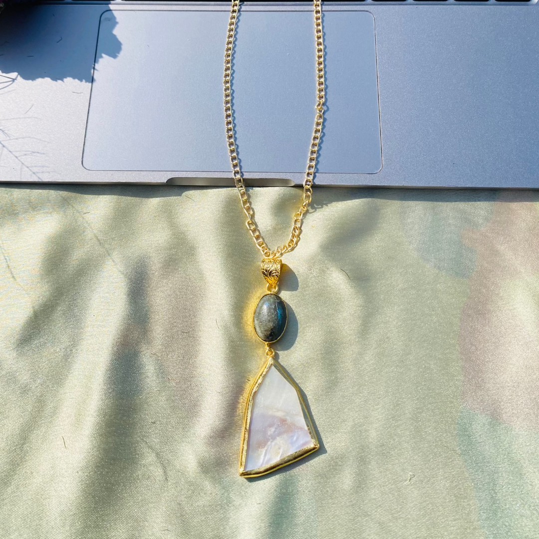 LABRADORITE AND MOP STONE IN BRASS METAL WITH 18KT GOLD PLATING