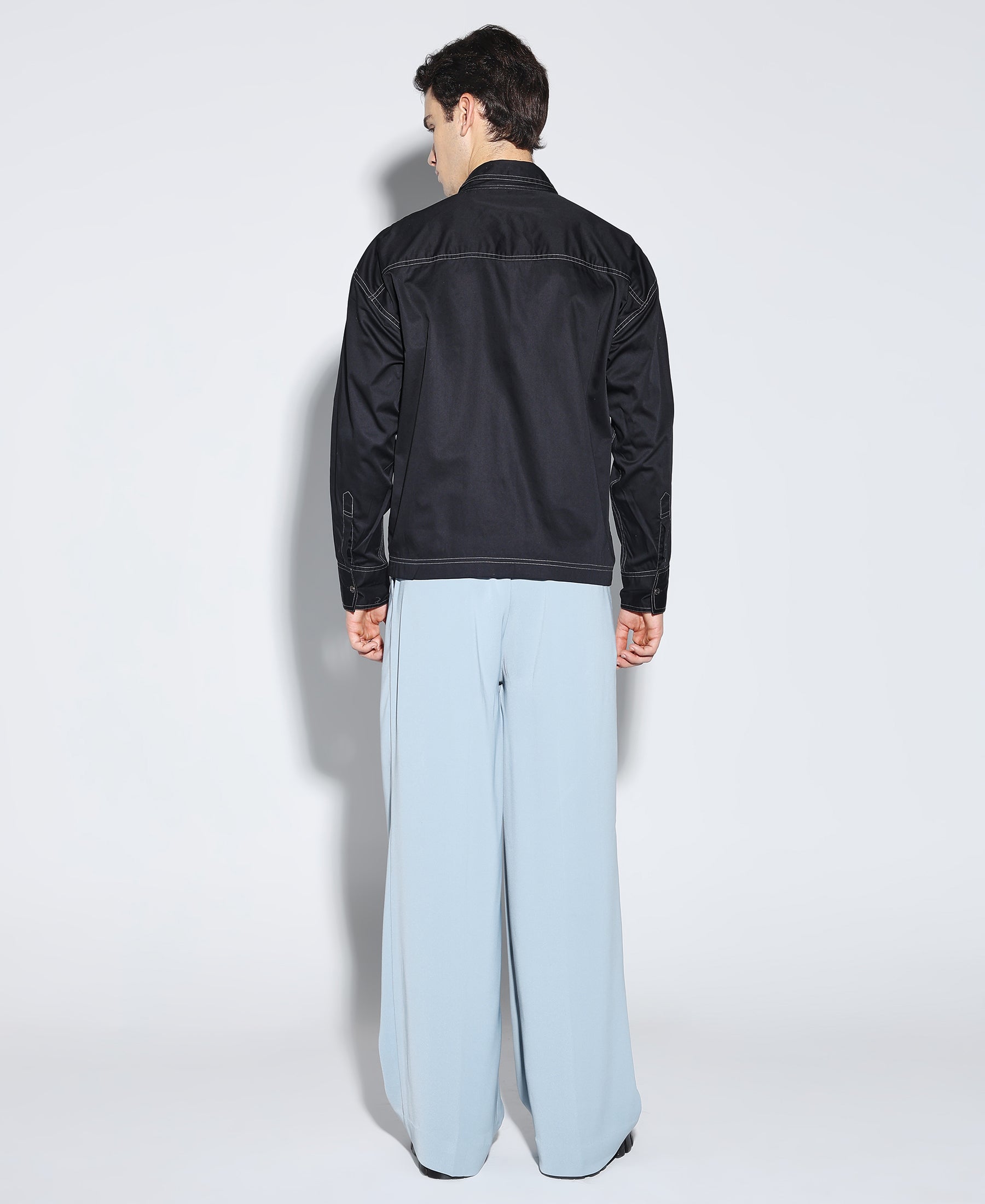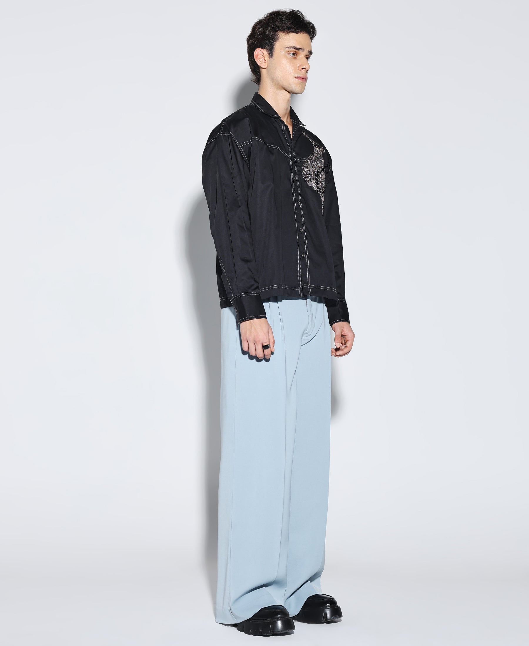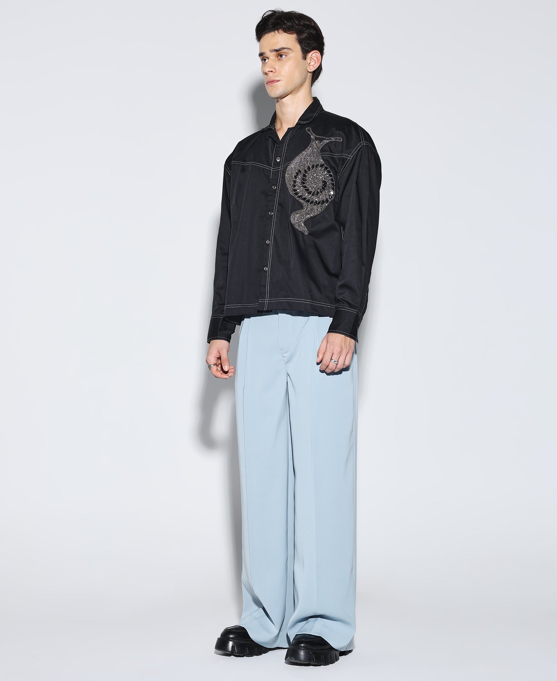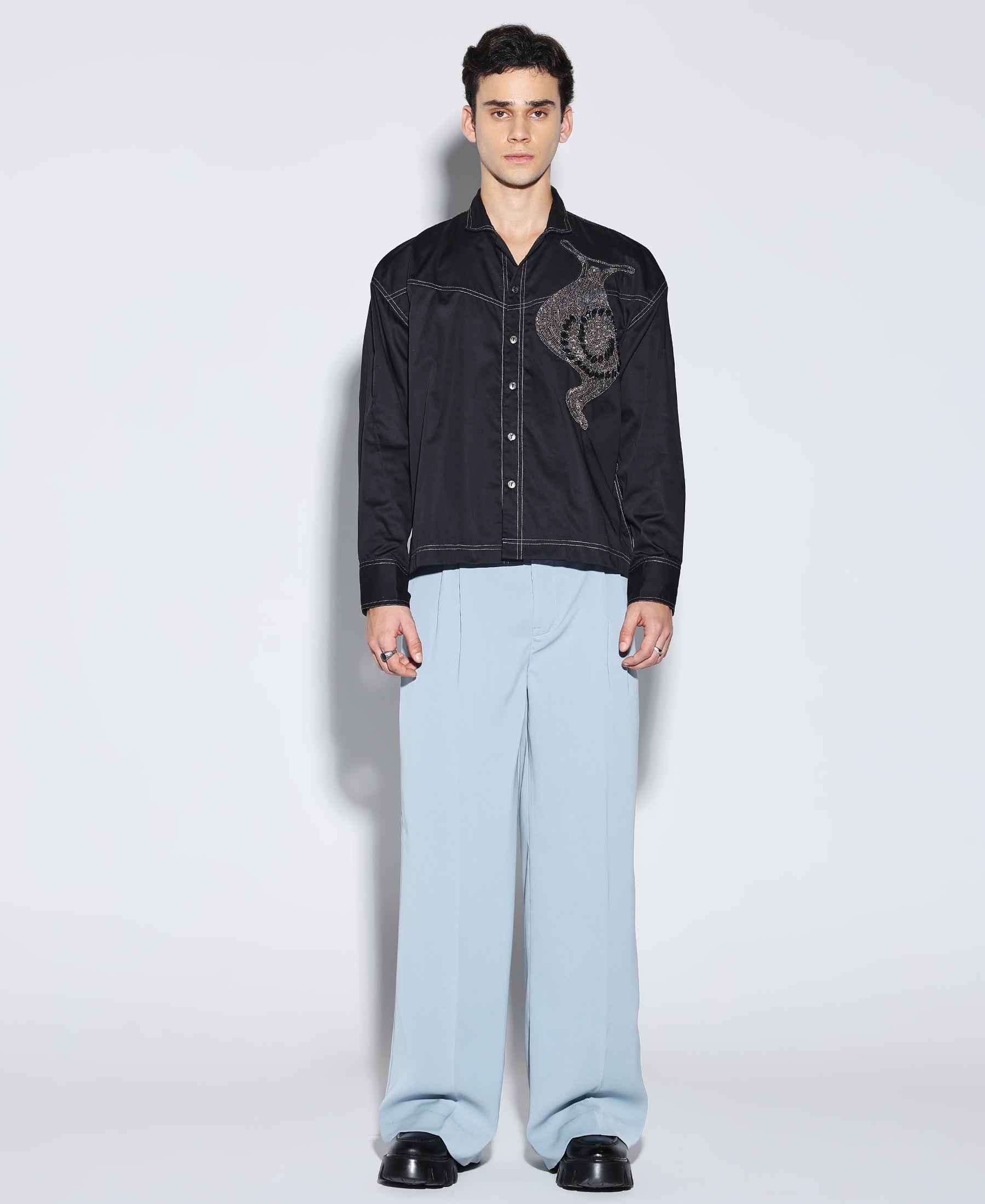 Embellished shirt with a silver beaded snail motif. The shirt has short length with grey contrasting stitching and slightly oversized fit.