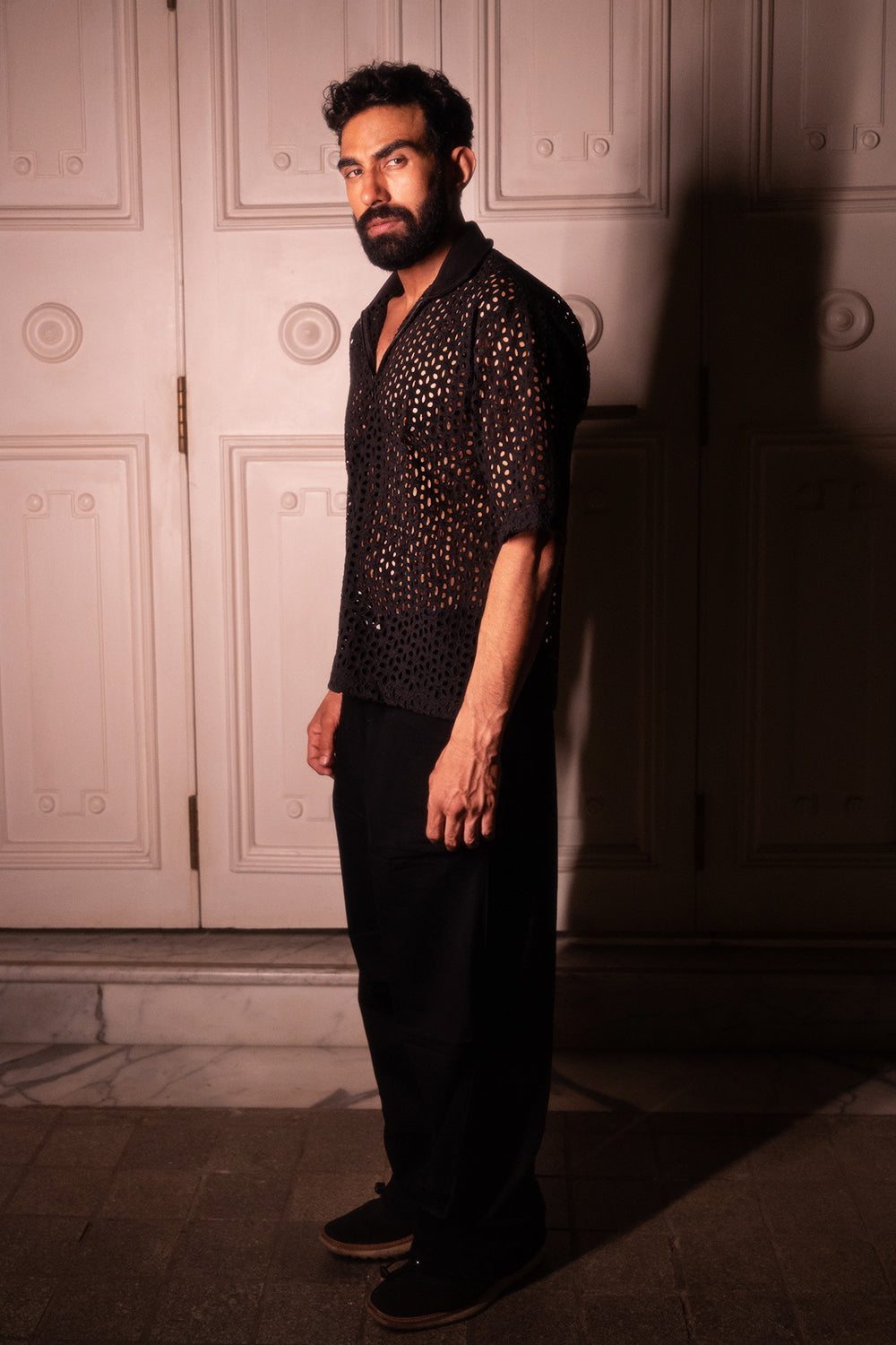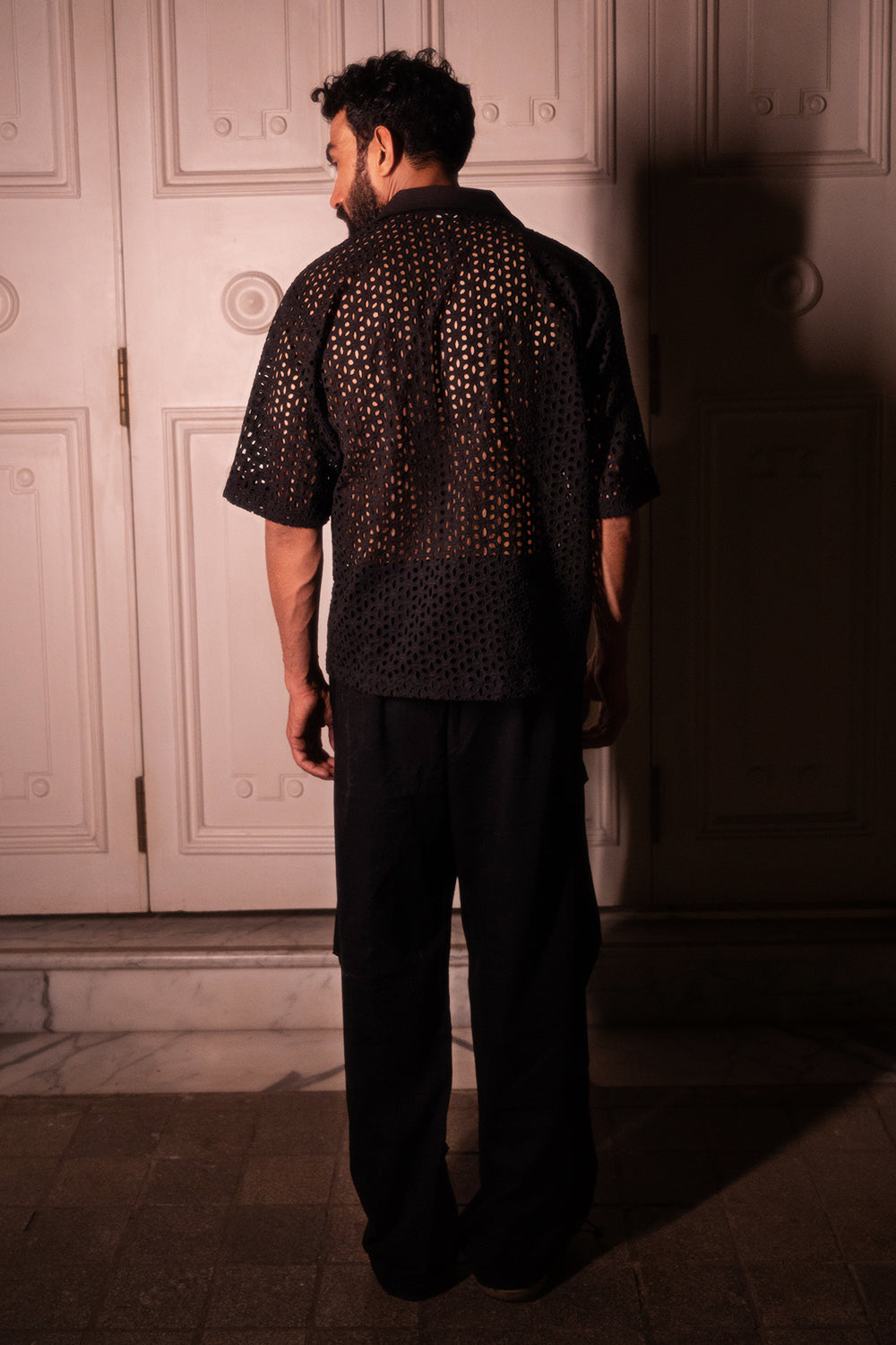 As the name suggests, this product is a pinnacle of understated sophistication. Meticulously designed with intricate cutwork detailing, this shirt exudes a refined elegance. Its timeless black hue ensures versatility, making it a staple piece for any discerning wardrobe.