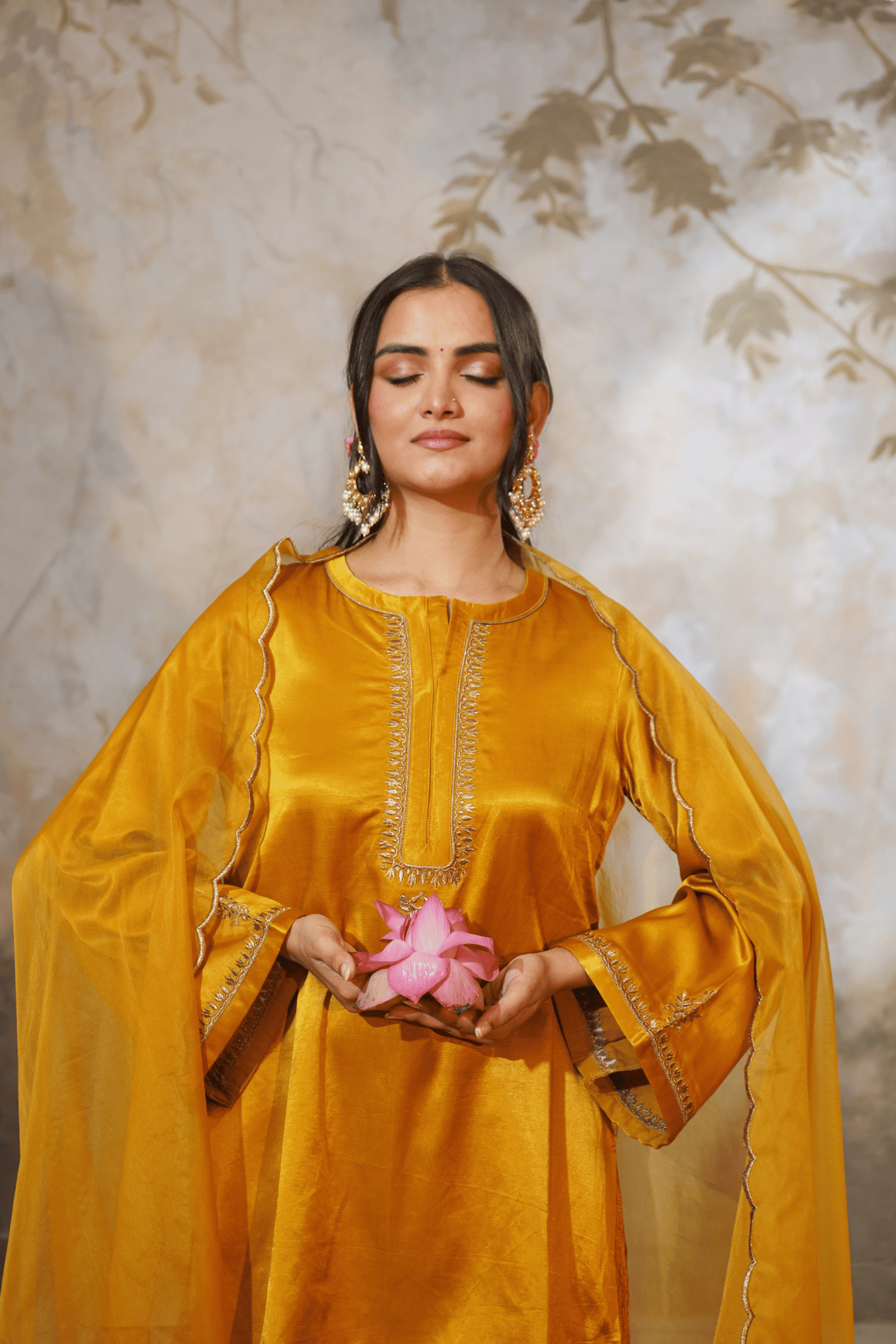 Brighten up your wardrobe with our gorgeous Mustered Yellow Gajji Silk Embroidered Sharara Set with Elasticated Waist Pant and Dupatta.