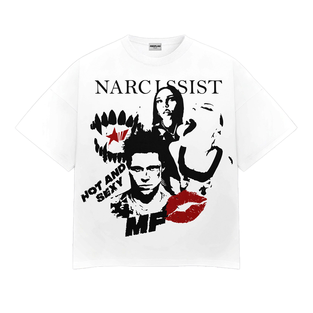 RedFlag Studio NARCISSIST T-shirt. Crafted from high-quality 240 GSM terry cotton, this tee features bold, screen-printed graphics that scream i am one . We Don't just notice REDFLAGS we turn them into FIERCE STATEMENT PEICES.