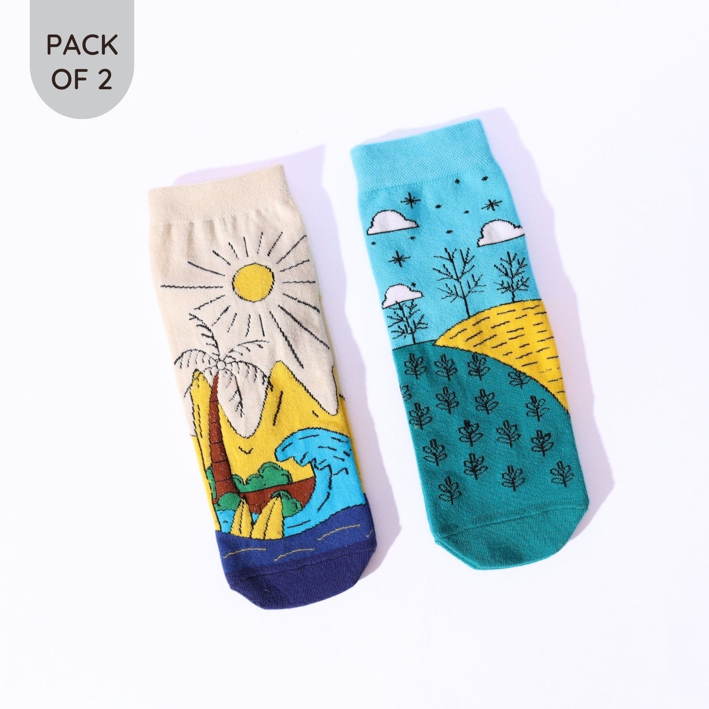 Unleash your adventurous spirit with Nature's Bloom socks! Featuring an ankle length and a pack of 2, these socks are designed with breathtaking landscapes in nature. Suitable for both men and women, these socks come in a free size for ultimate comfort. Take on any challenge with Nature's Bloom!