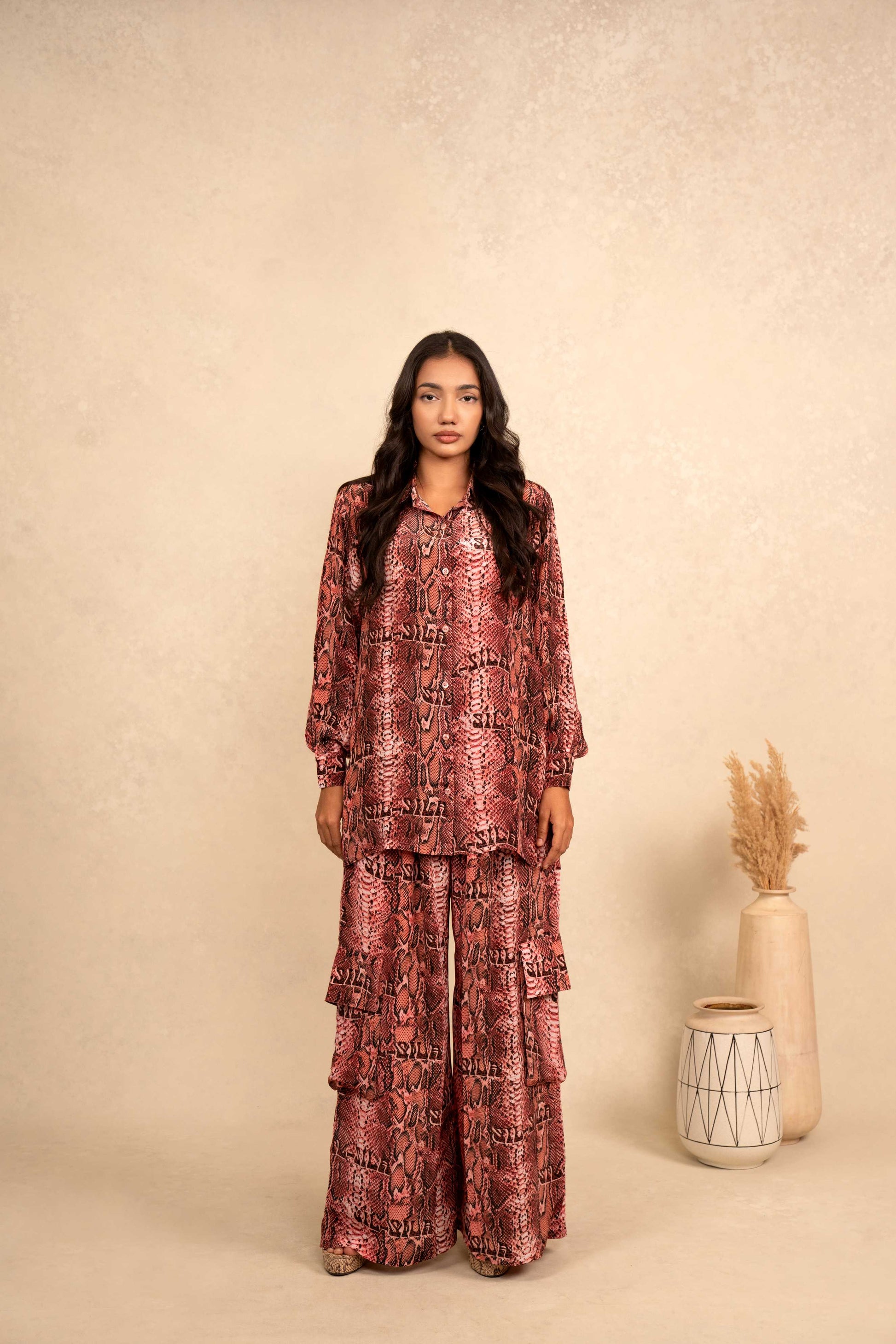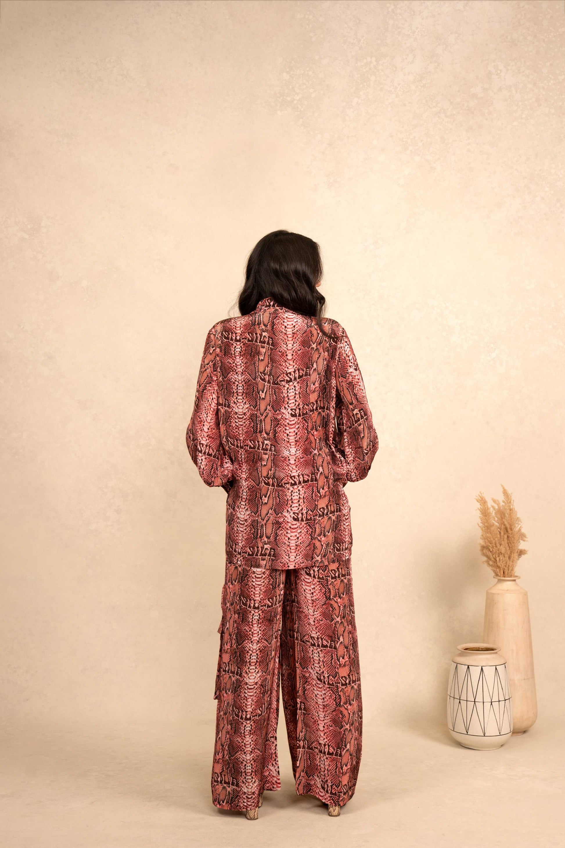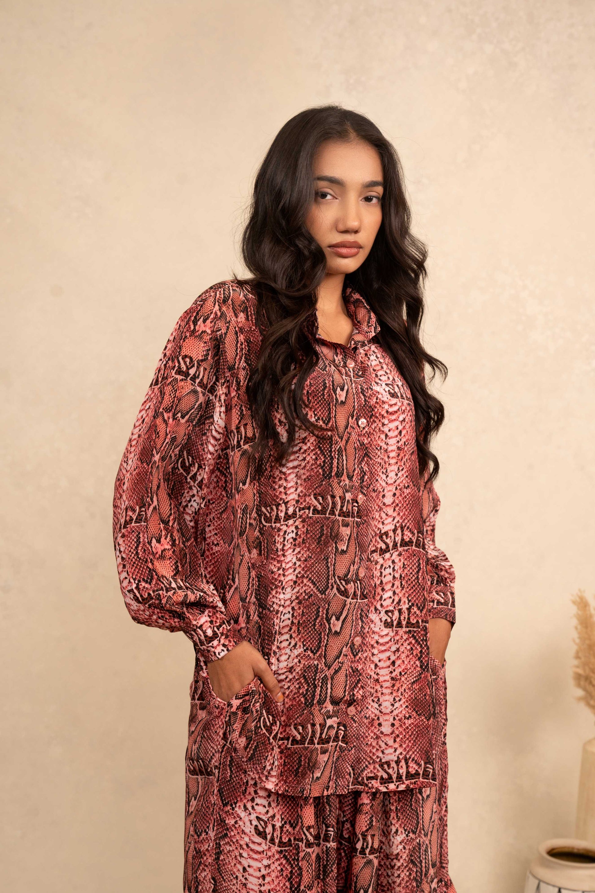 Turn heads with this statement Snake Print Co-ord Set featuring bold Sil Sila typography. Crafted from lightweight crepe fabric, it offers a flowy, breathable feel. The striking snake print adds an edgy touch, making it perfect for effortless styling—whether you’re dressing up or keeping it casual. Fabric: Crepe