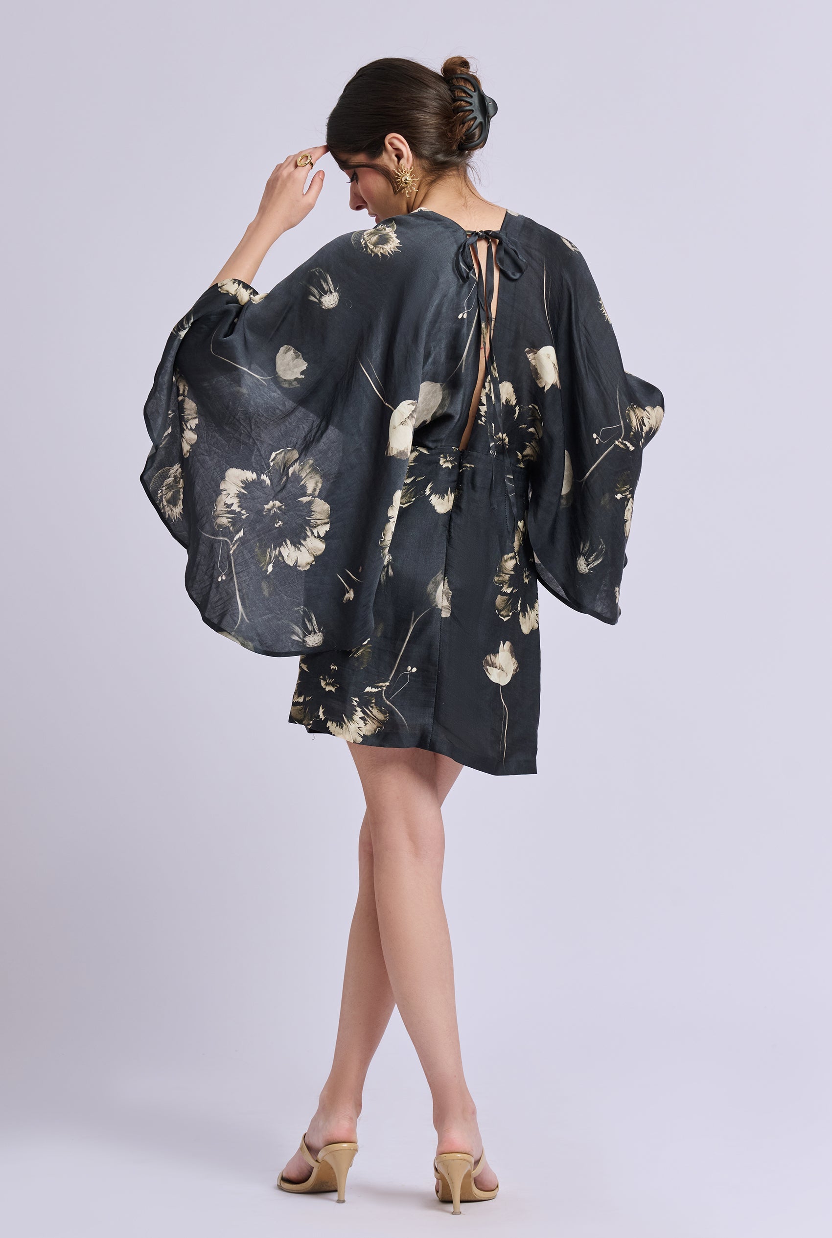 Nicola Black And Gold Flower Print Dress with Flowy Sleeves