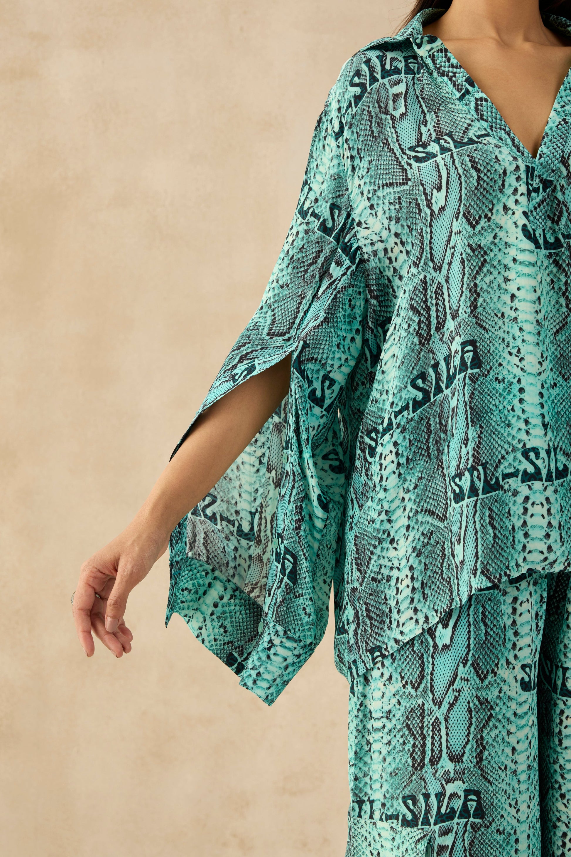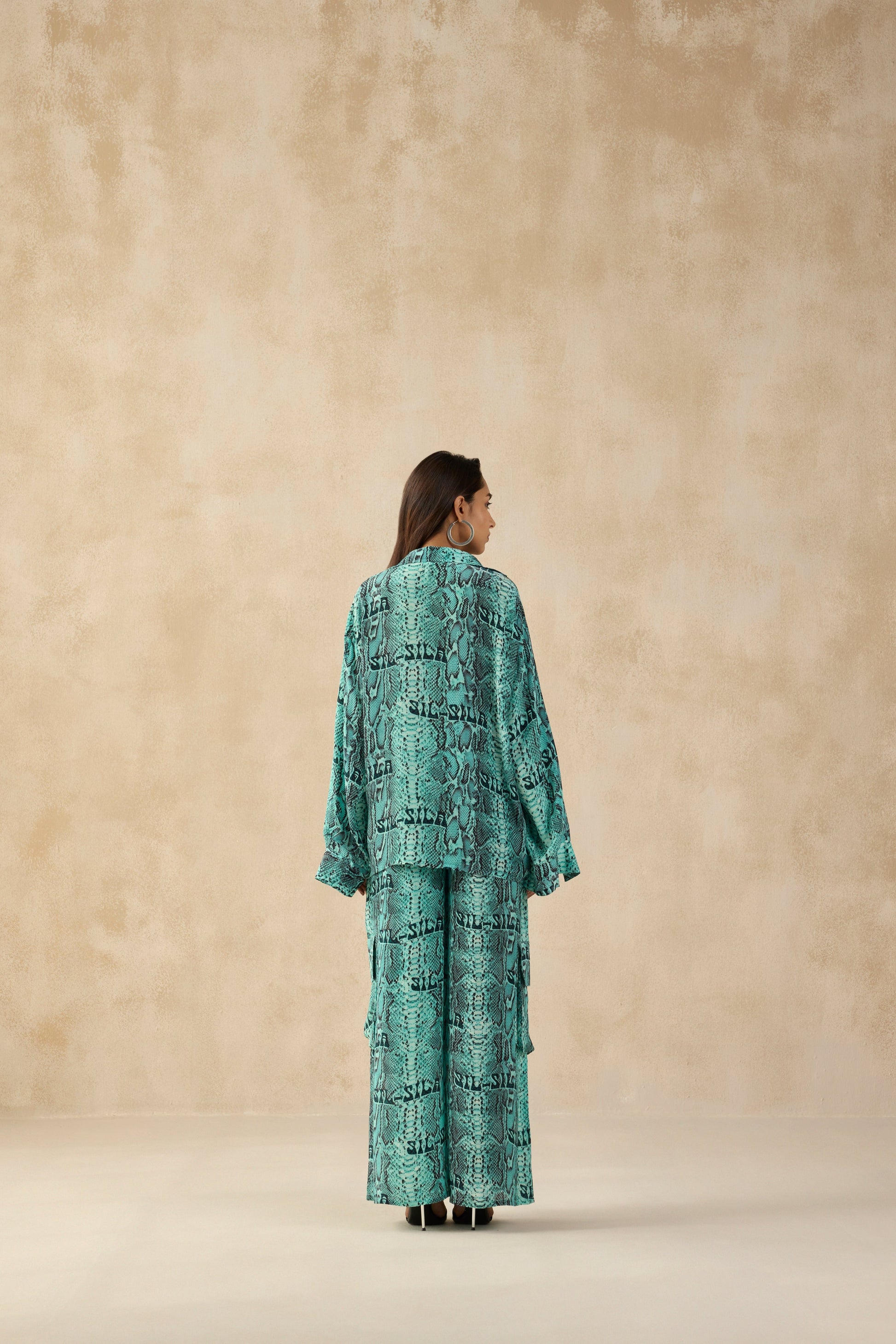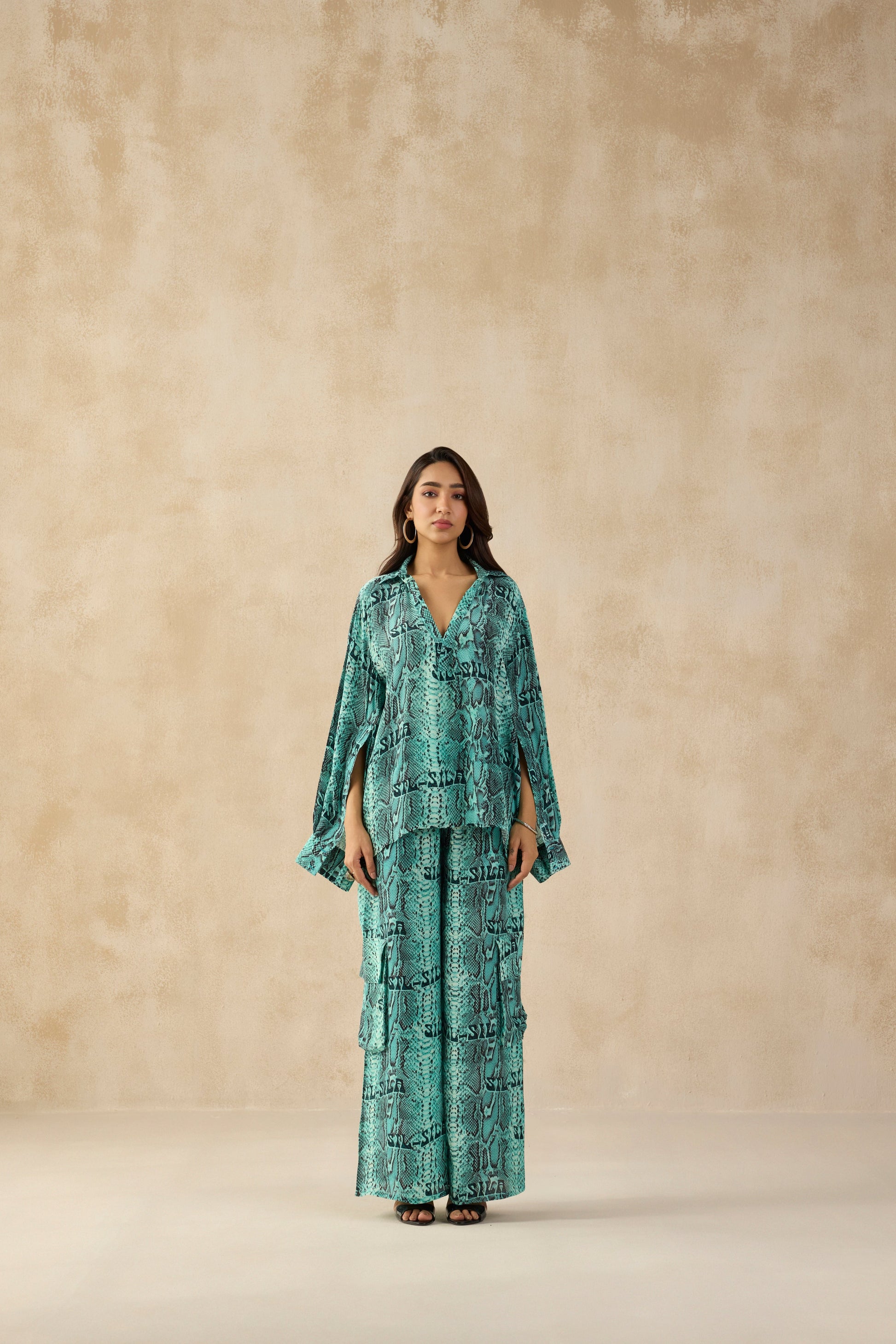A bold teal blue co-ord set with an all-over snake print. The oversized shirt features a V-neckline and flared sleeves, paired with wide-leg cargo pants for a relaxed yet statement look.Perfect for effortless styling, whether you're dressing up or keeping it casual.Bold, stylish, and ultra-comfortable – this co-ord set is a must-have!