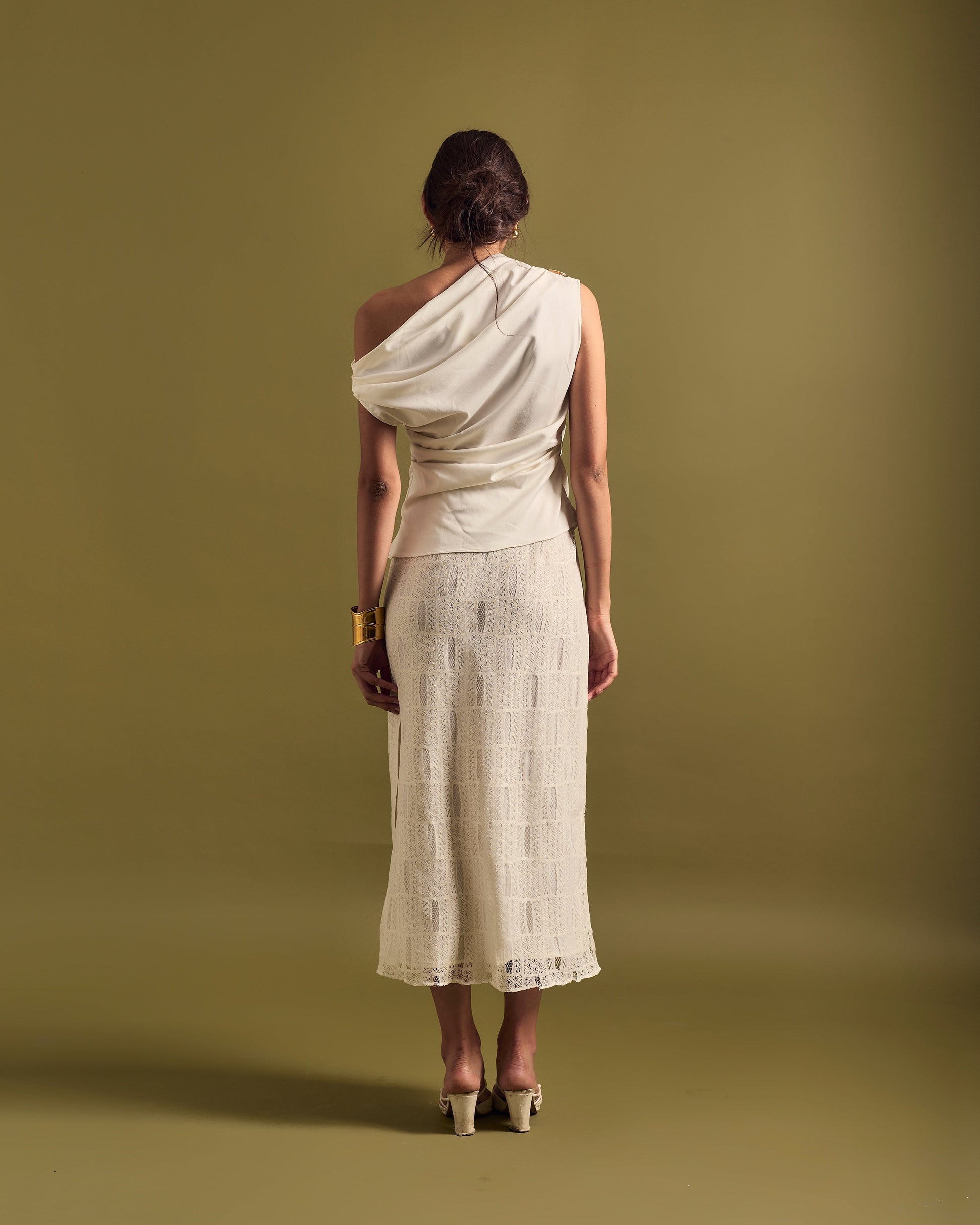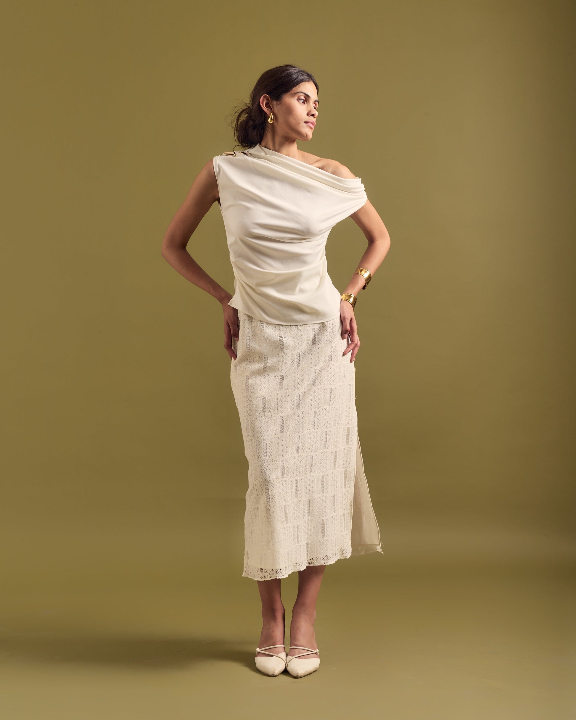 The Nira Skirt is a straight-fit design crafted in airy lace with a side slit and soft lining. Understated yet bold, it adds effortless grace to any ensemble—balancing structure and sensuality in quiet harmony.