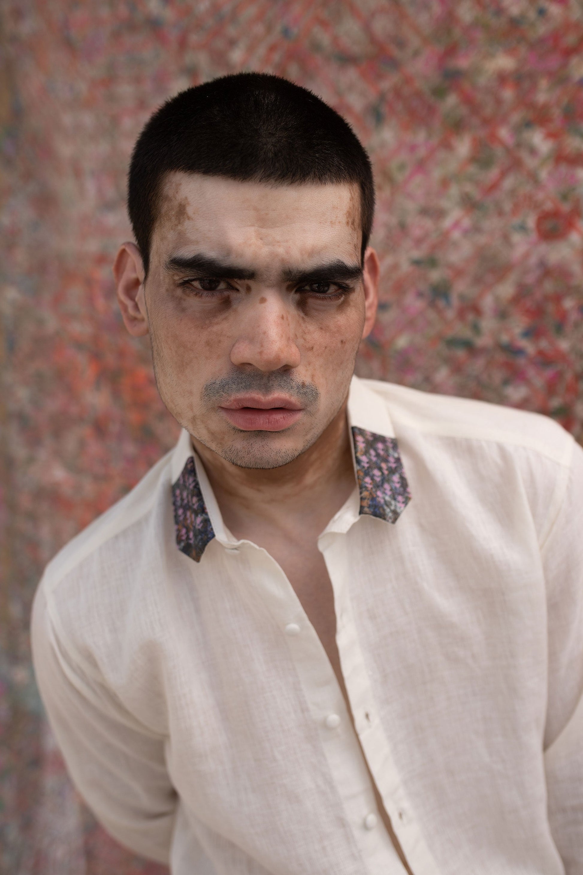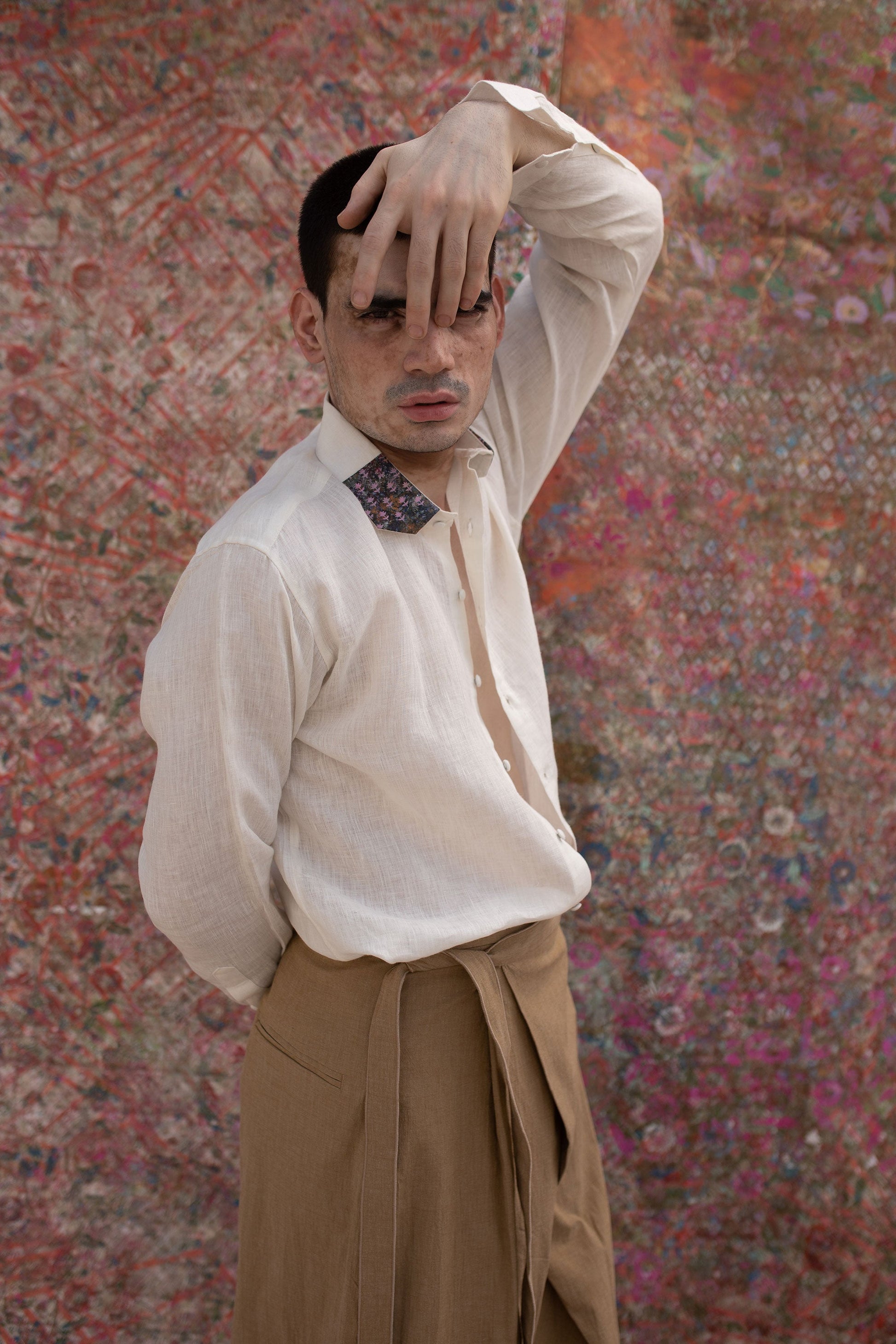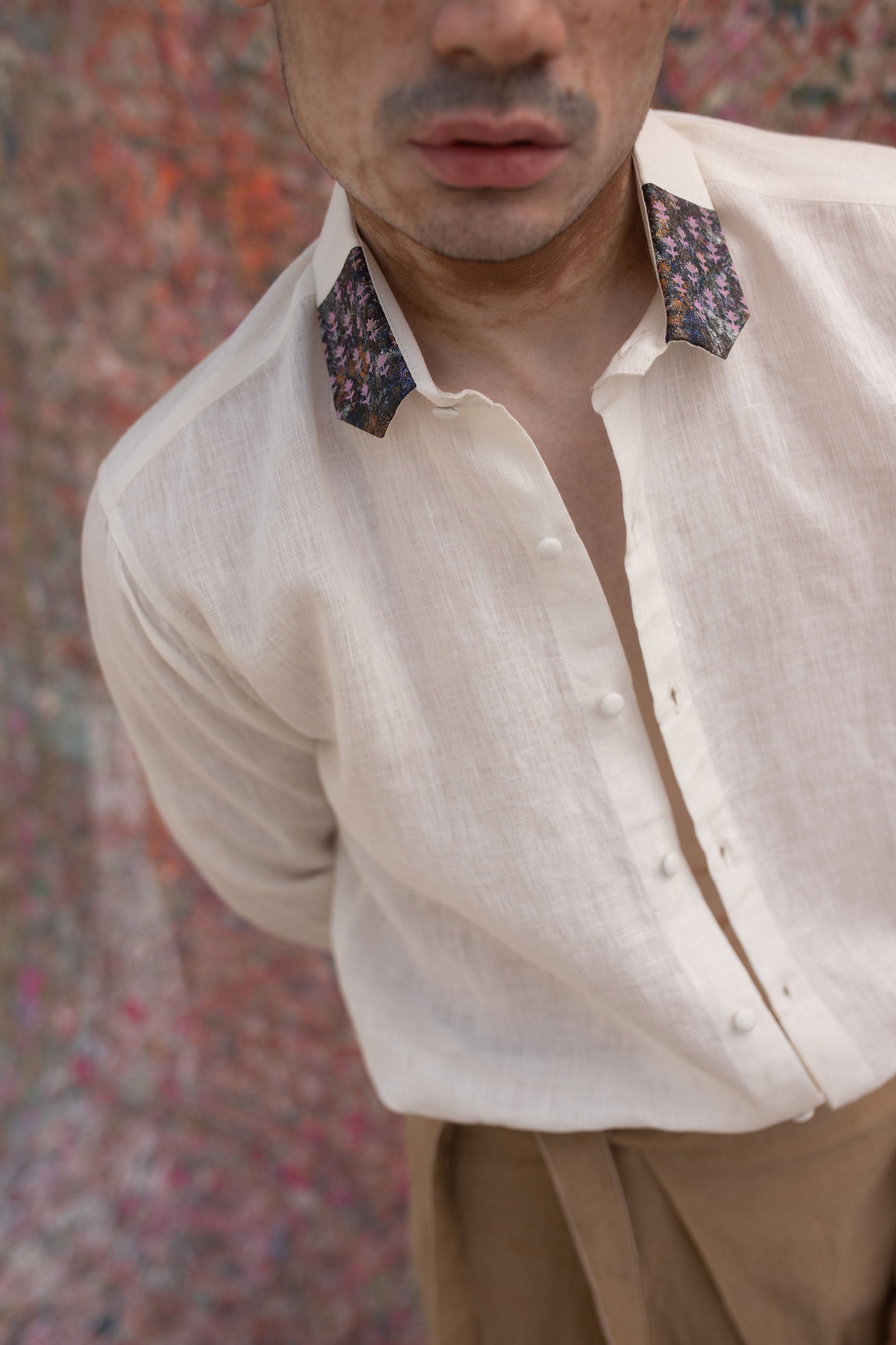 This shirt has a Patina block printed one-of-a-kind fabric collar design detail.