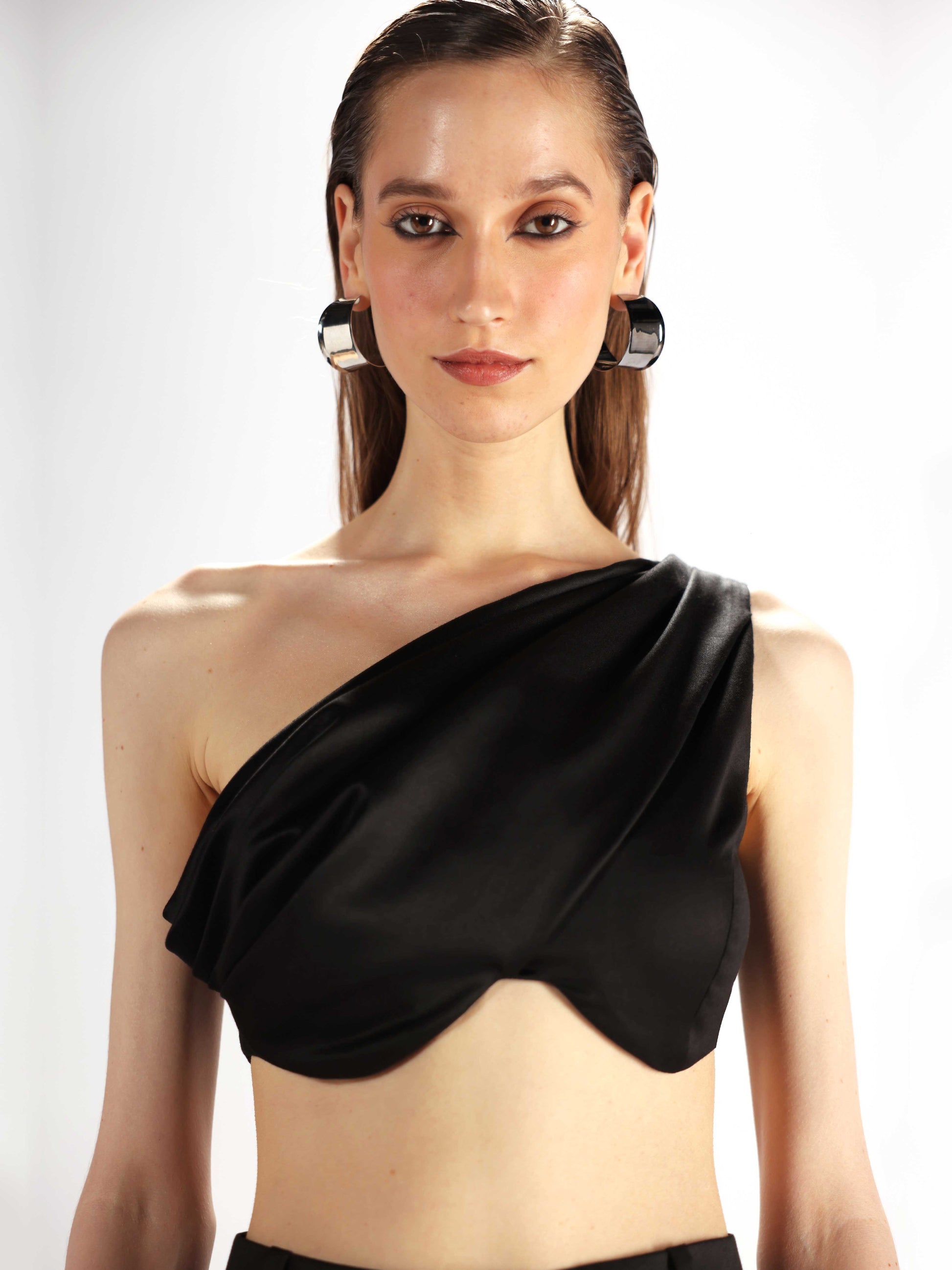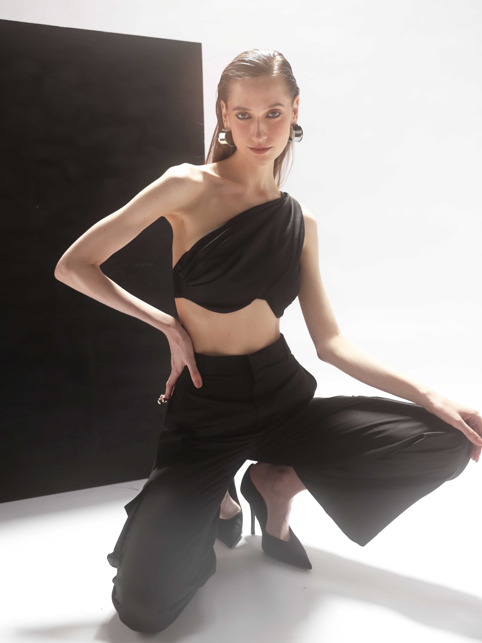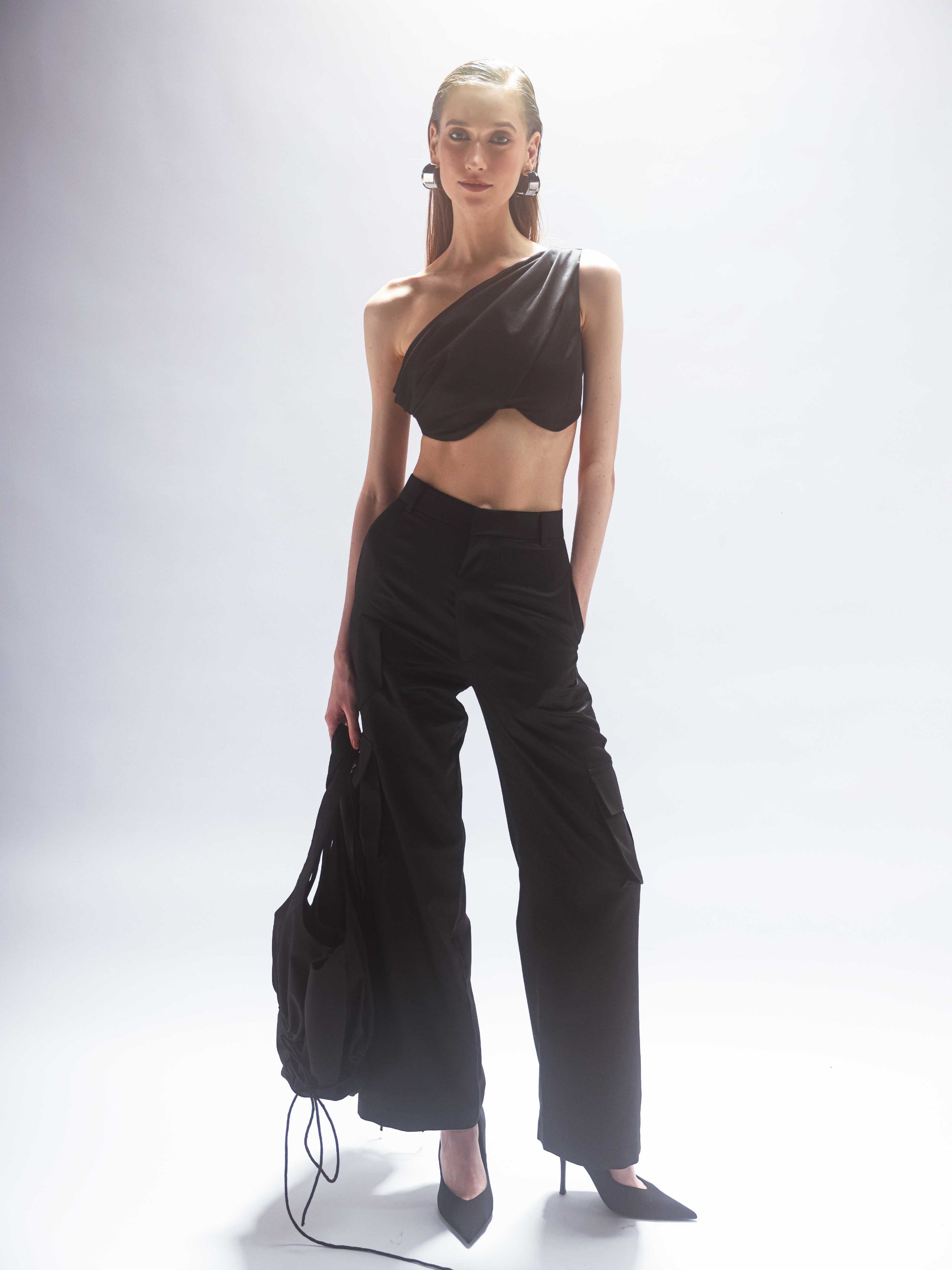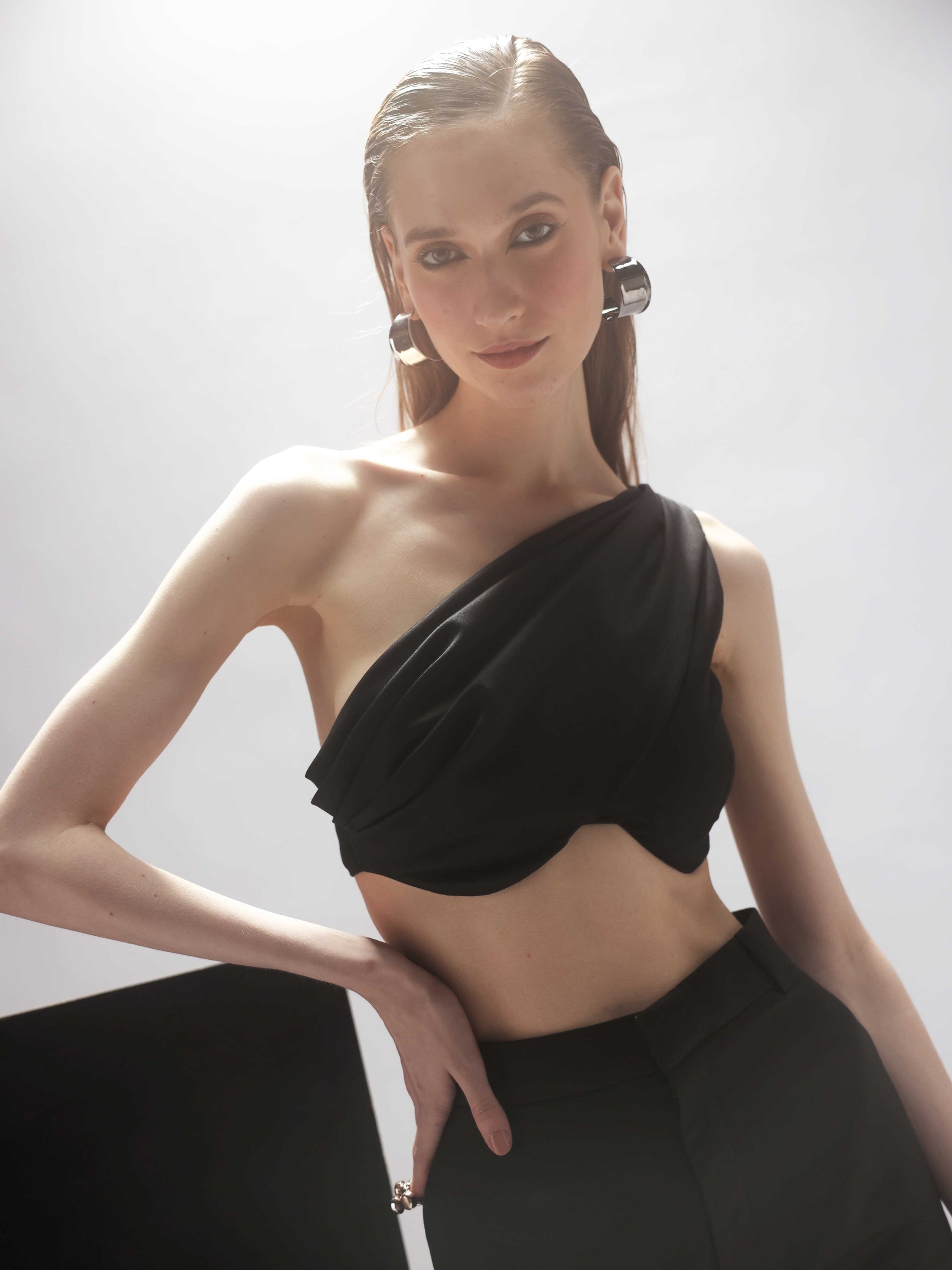 This corset emerged from an organic design process, where a push-up bra and jersey tank top were hand-draped together to see how the fabrics would flow and form. The result is an asymmetrical, structured top with an abstract back cut-out, naturally shaped by the creative draping process. Each piece is individually draped before sewing, featuring extra hook-and-eye closures for support.