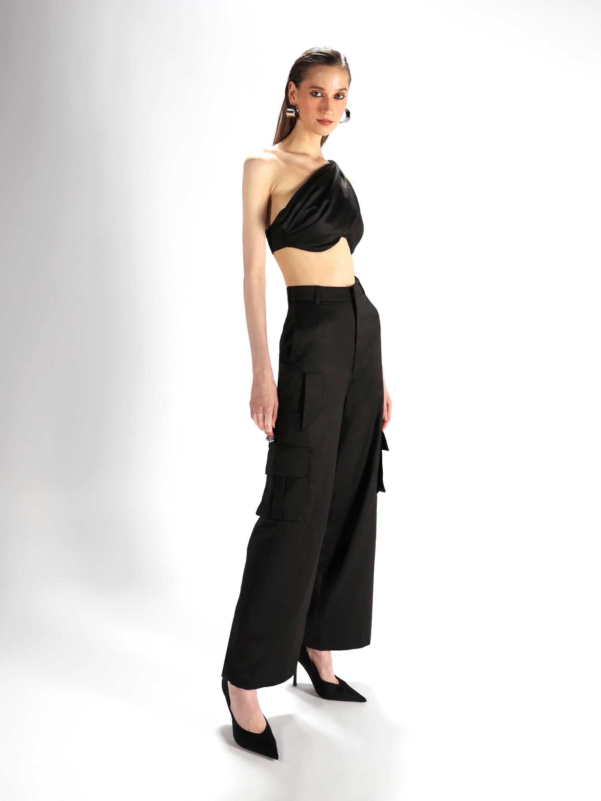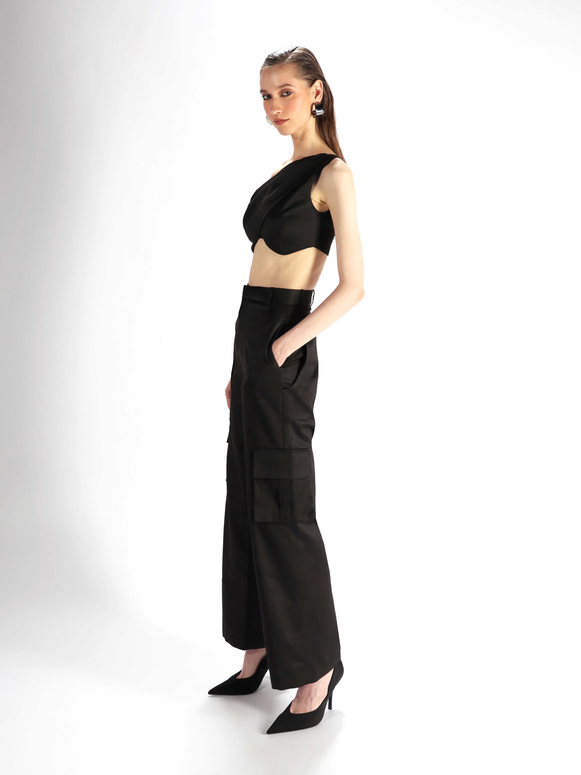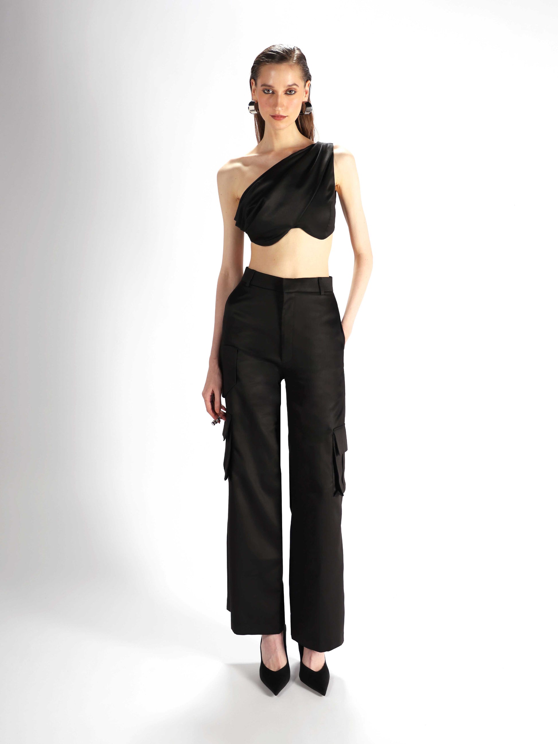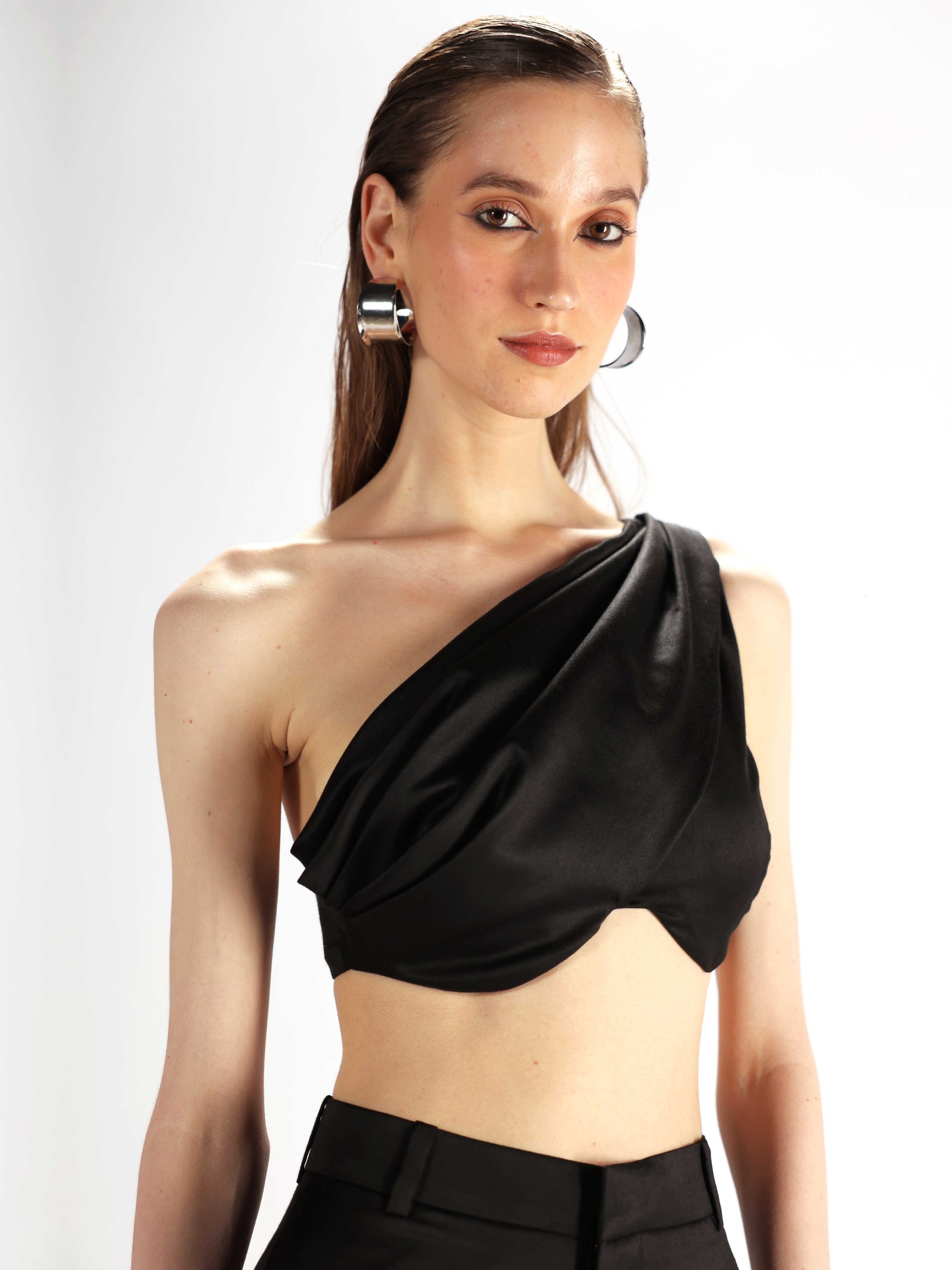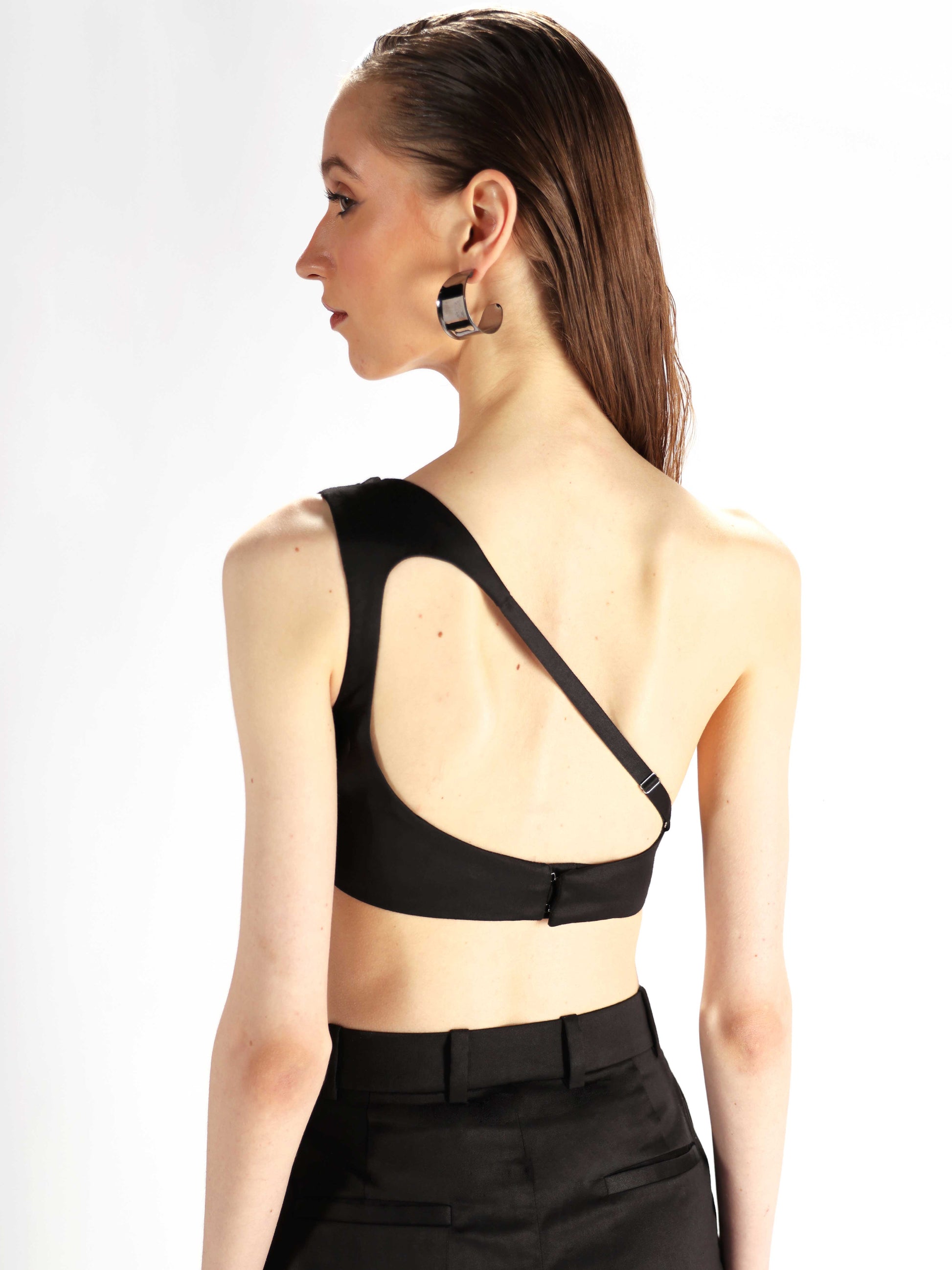 This corset emerged from an organic design process, where a push-up bra and jersey tank top were hand-draped together to see how the fabrics would flow and form. The result is an asymmetrical, structured top with an abstract back cut-out, naturally shaped by the creative draping process. Each piece is individually draped before sewing, featuring extra hook-and-eye closures for support.
