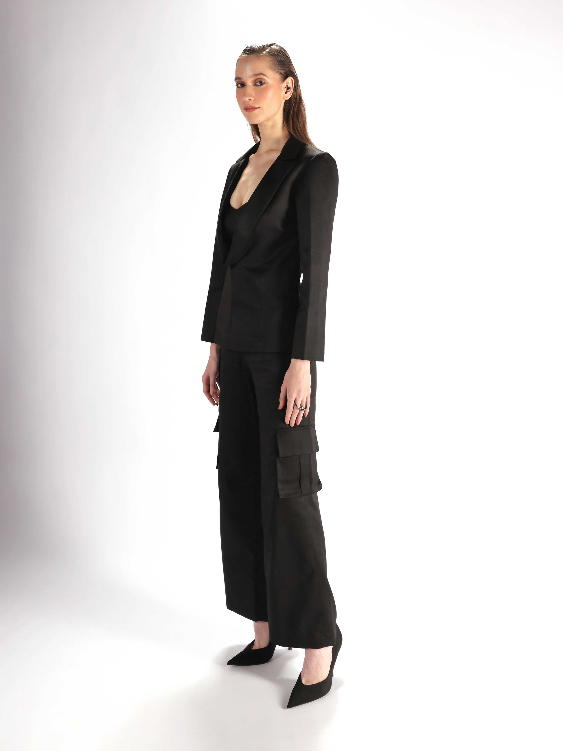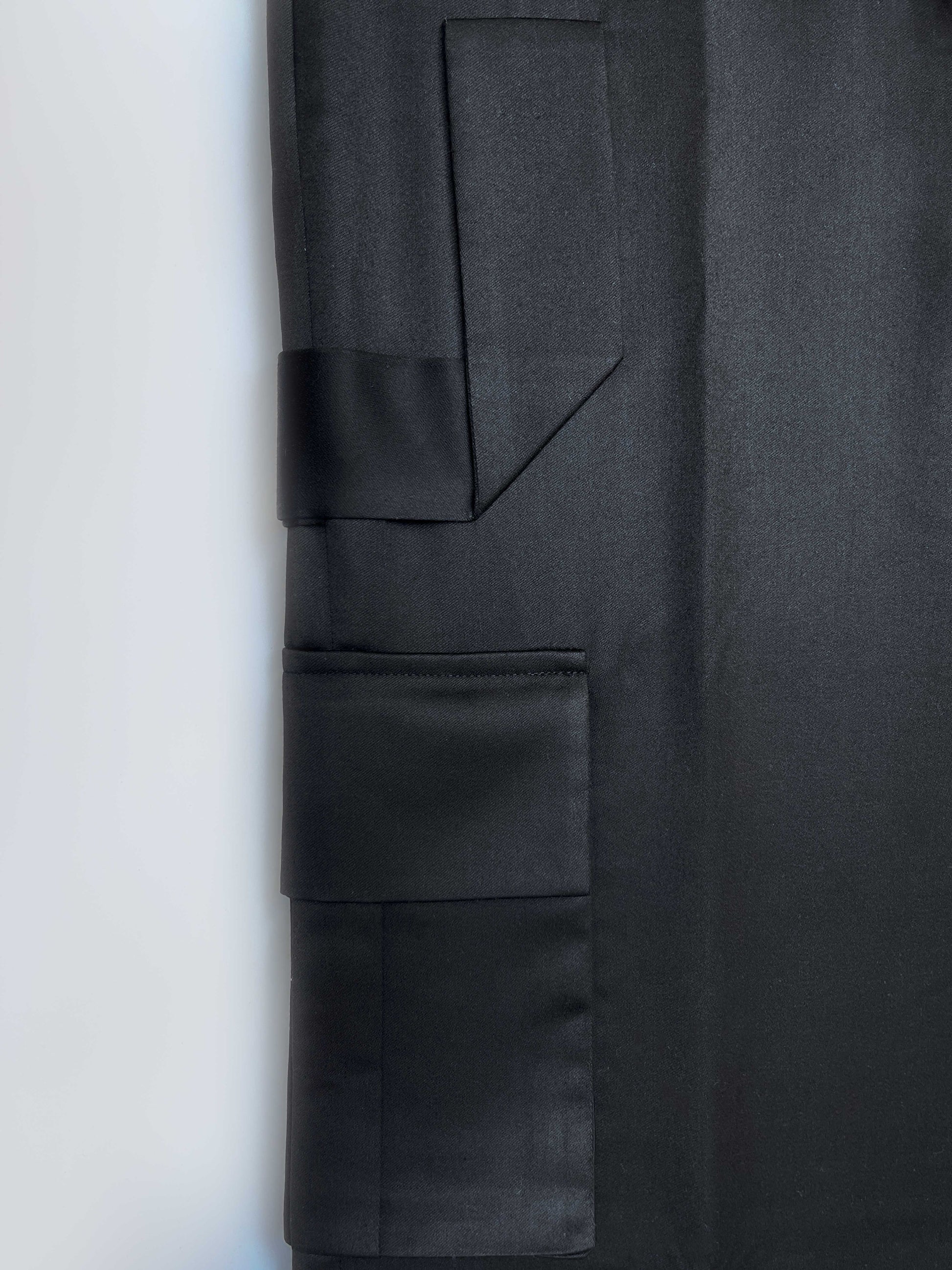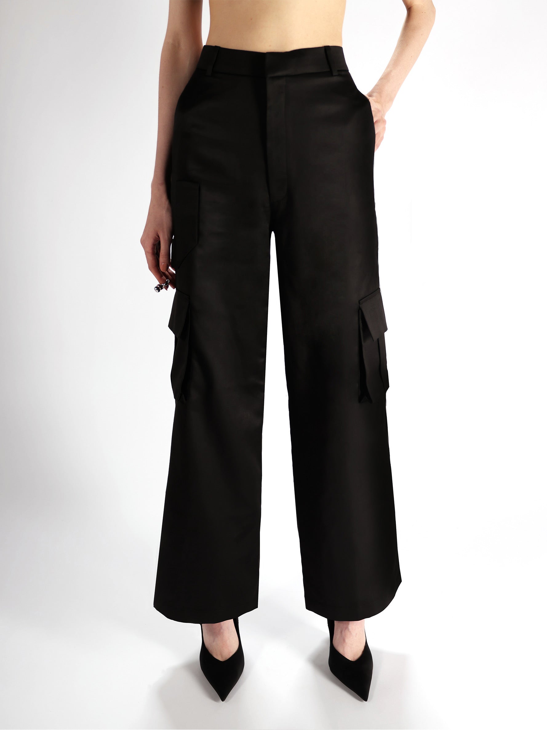 High-waisted, wide-leg cargo pants in luxurious suiting fabric. Featuring large patch pockets, a curved hidden pocket, and an oversized back pocket for a statement look. Finished with a concealed zip fly, pant hook closure, and belt loops for an effortless fit.