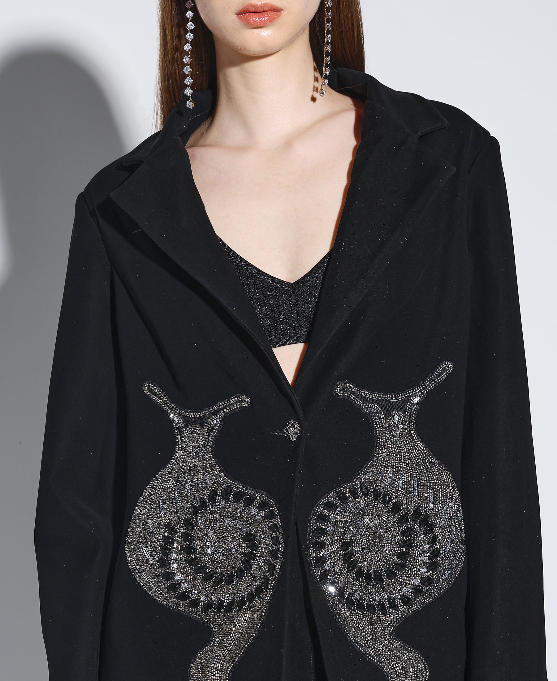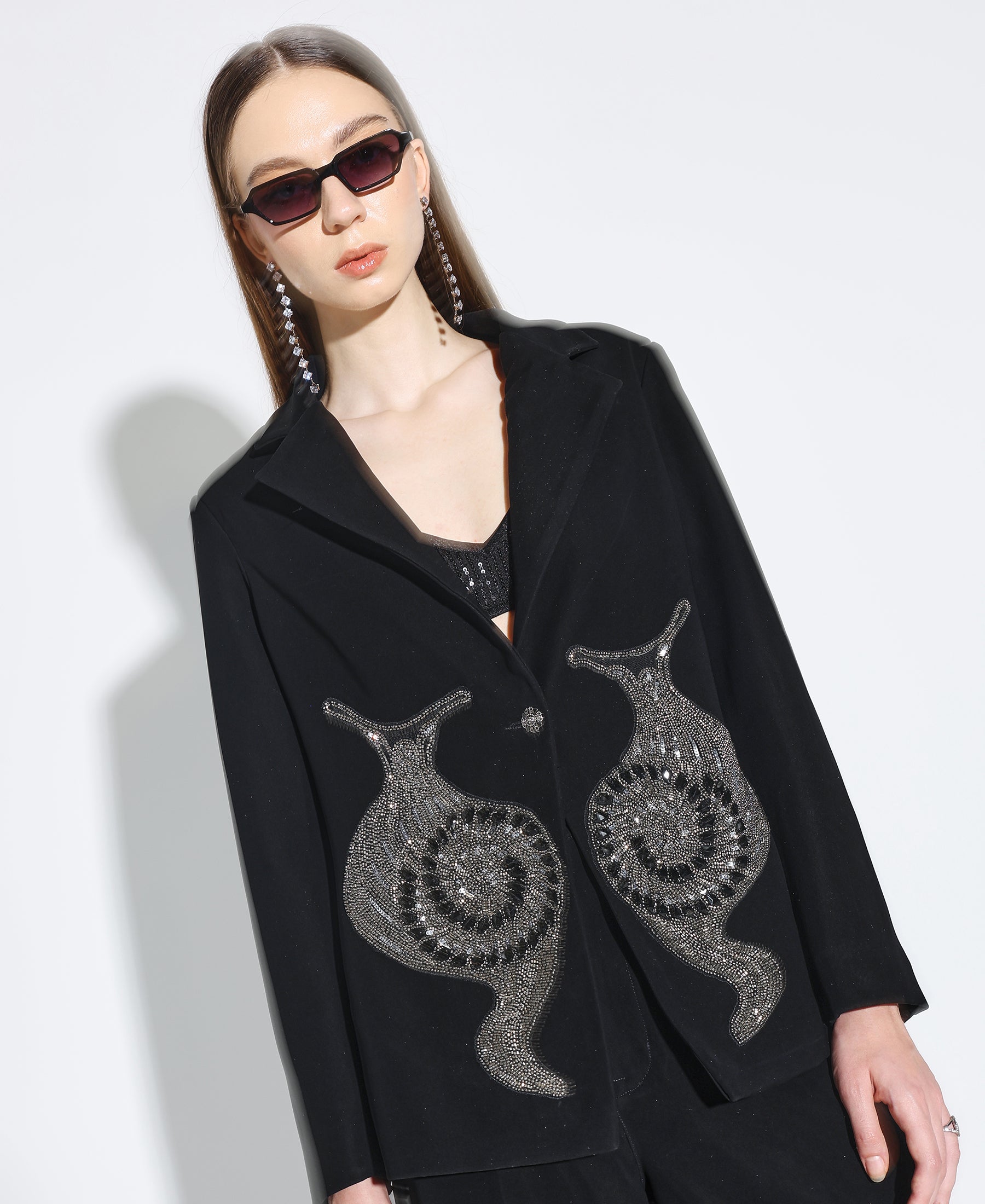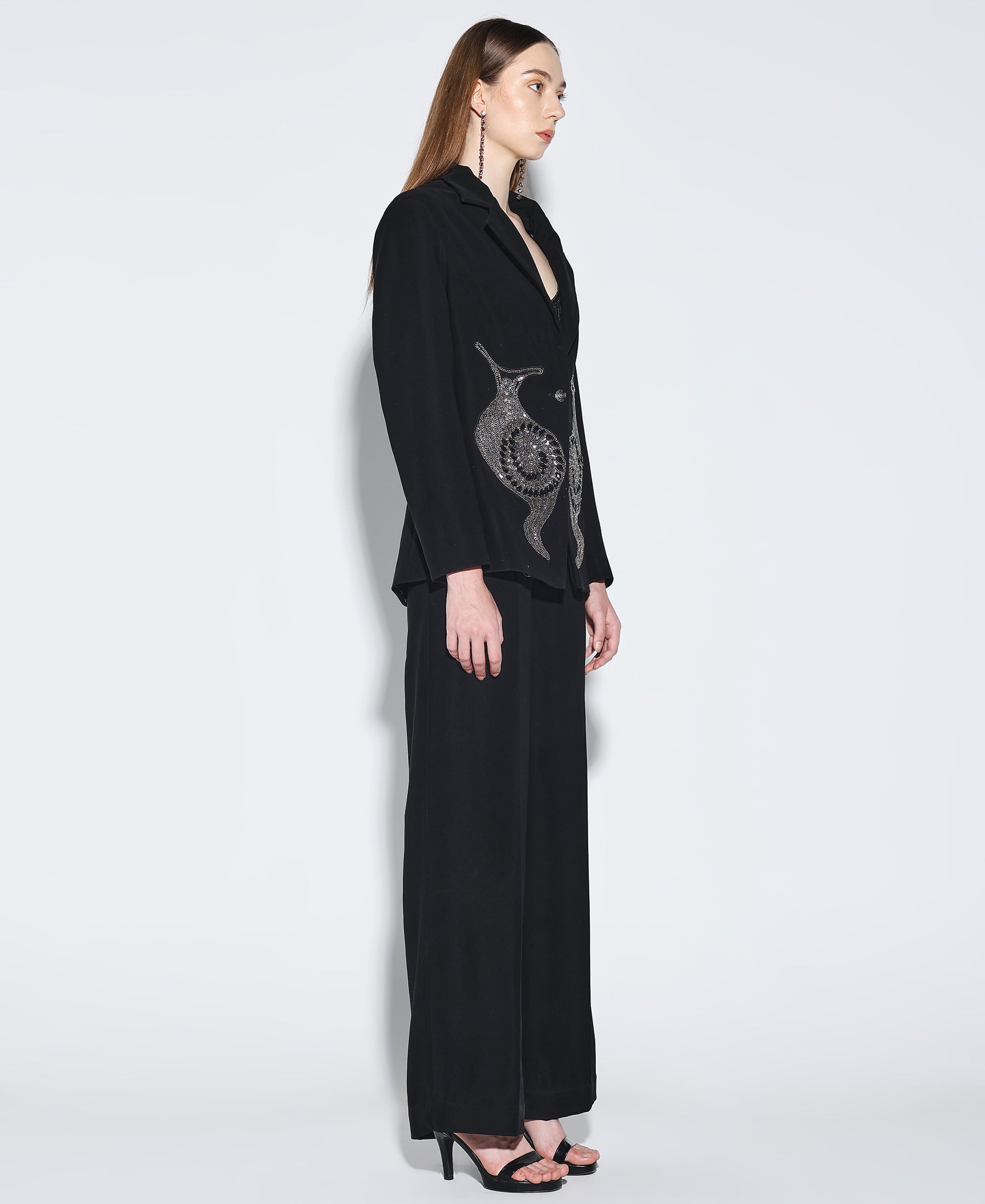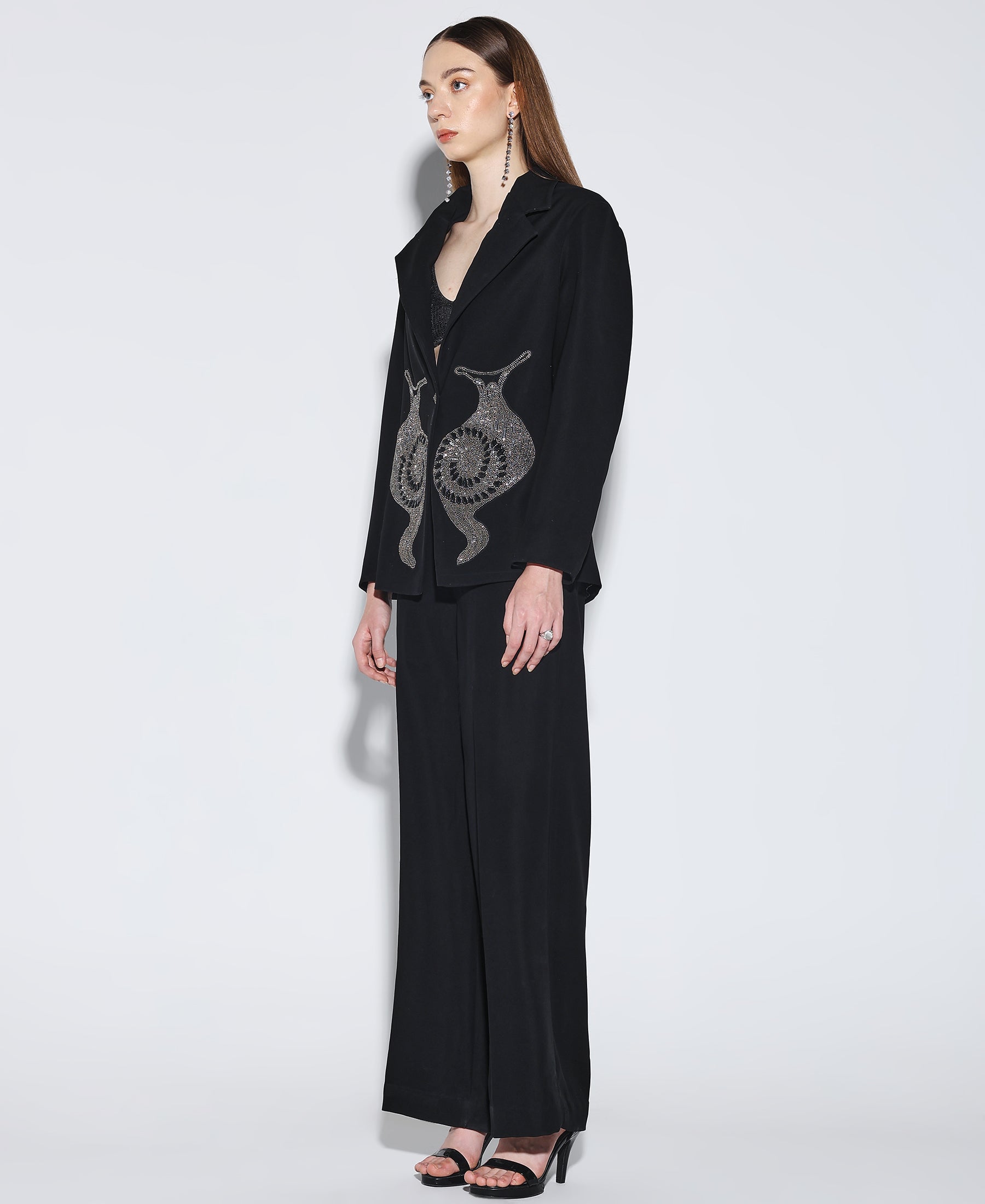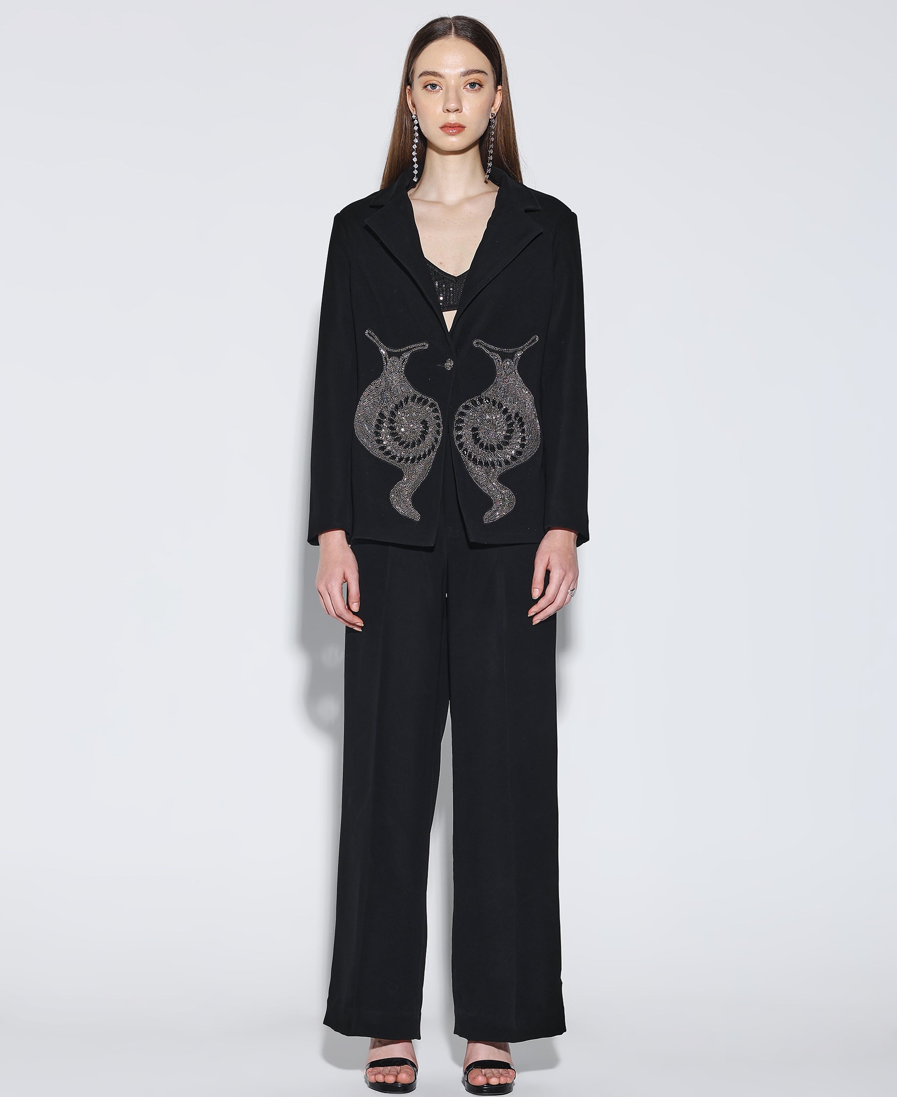 Embellished Noir Blazer crafted from Japanese suiting fabric with a snail embroidered motif on the front paired with matching pants. Fit is relaxed.