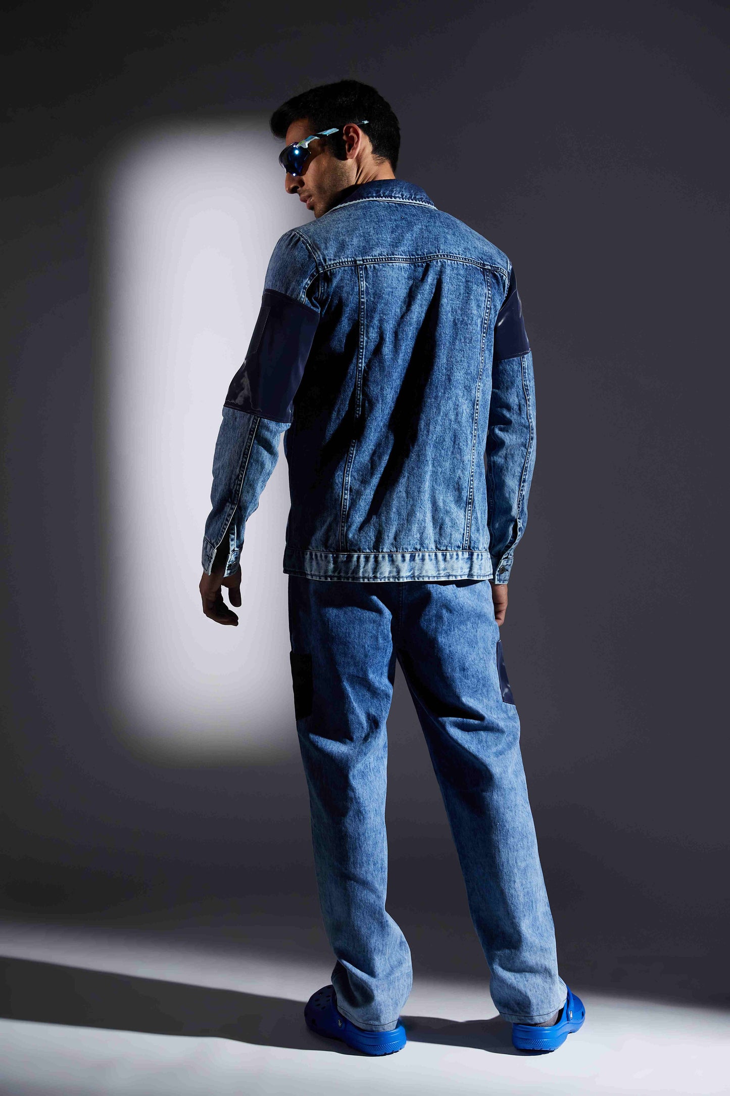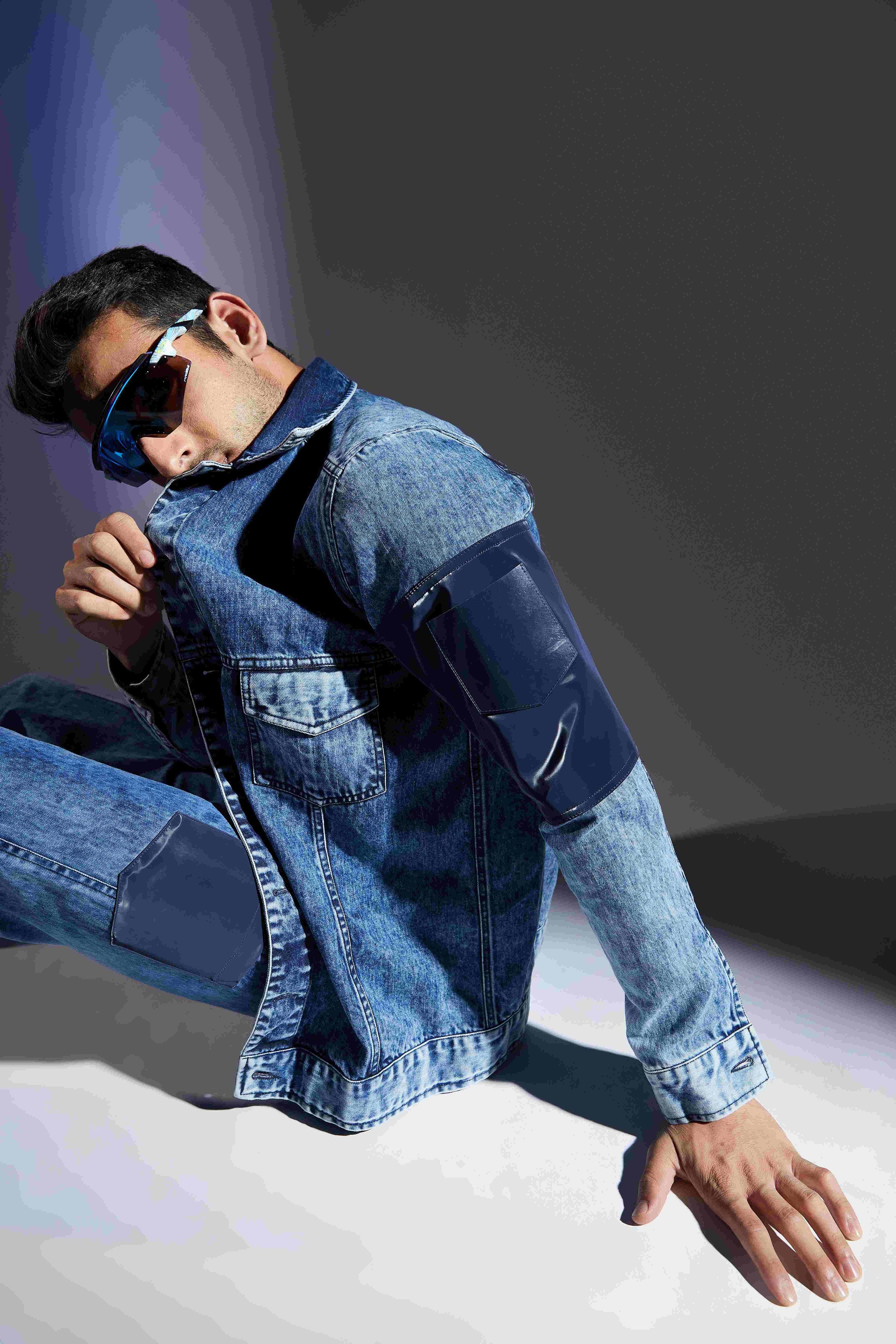 Ocean wash denim jacket juxtaposed with leatherite. Featuring Chest flap pockets. Finished with buttoned cuffs. This collection is in collaboration with Muskaan. An NGO for specially abled. 15% of our net profits will be donated for their welfare.