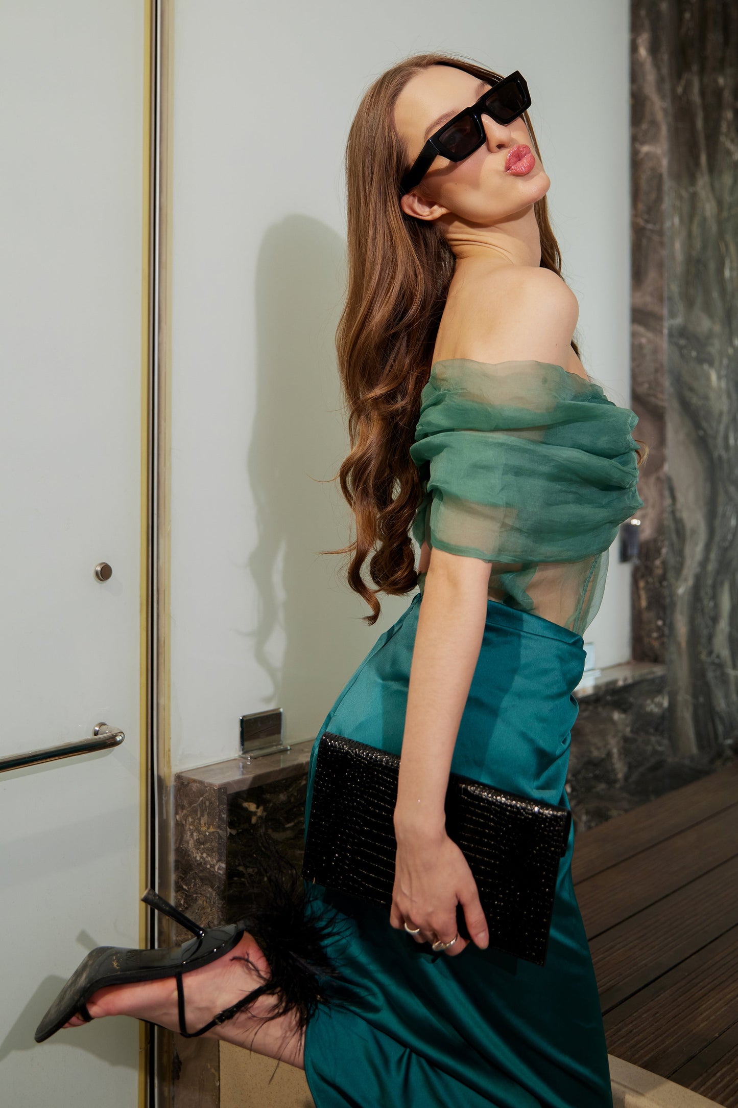 An off-shoulder top. Its a contrast of a structural look of a corset with a flowy upper section. The overall aesthetic of the top is ethereal and elegant, combining sheer organza and solid elements in a soft, muted green colour.
