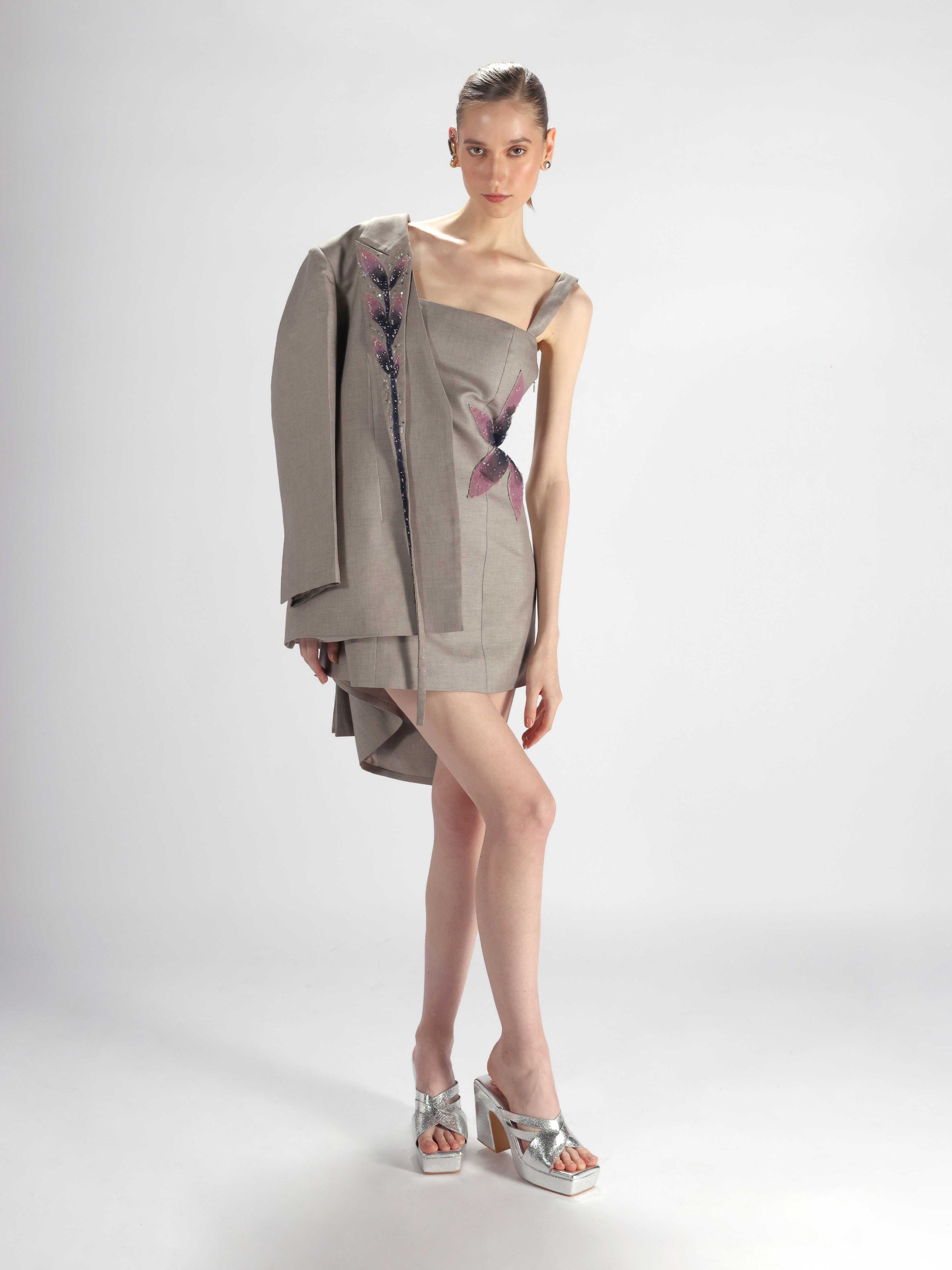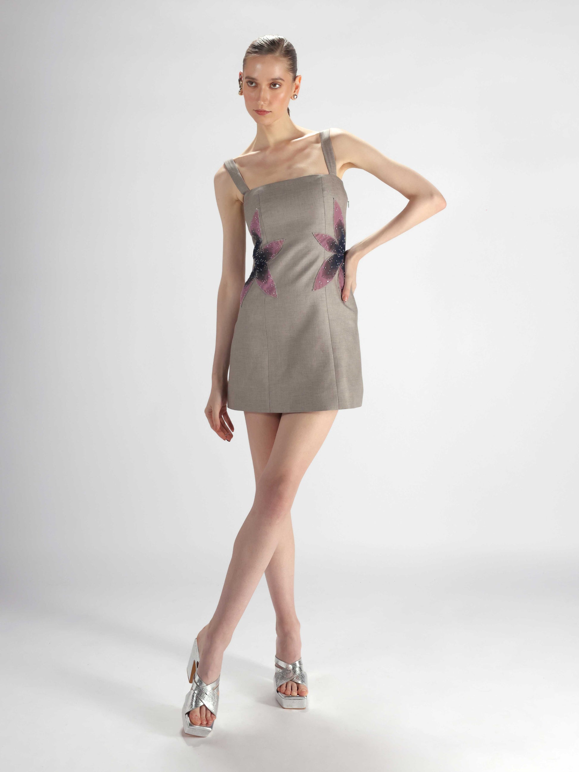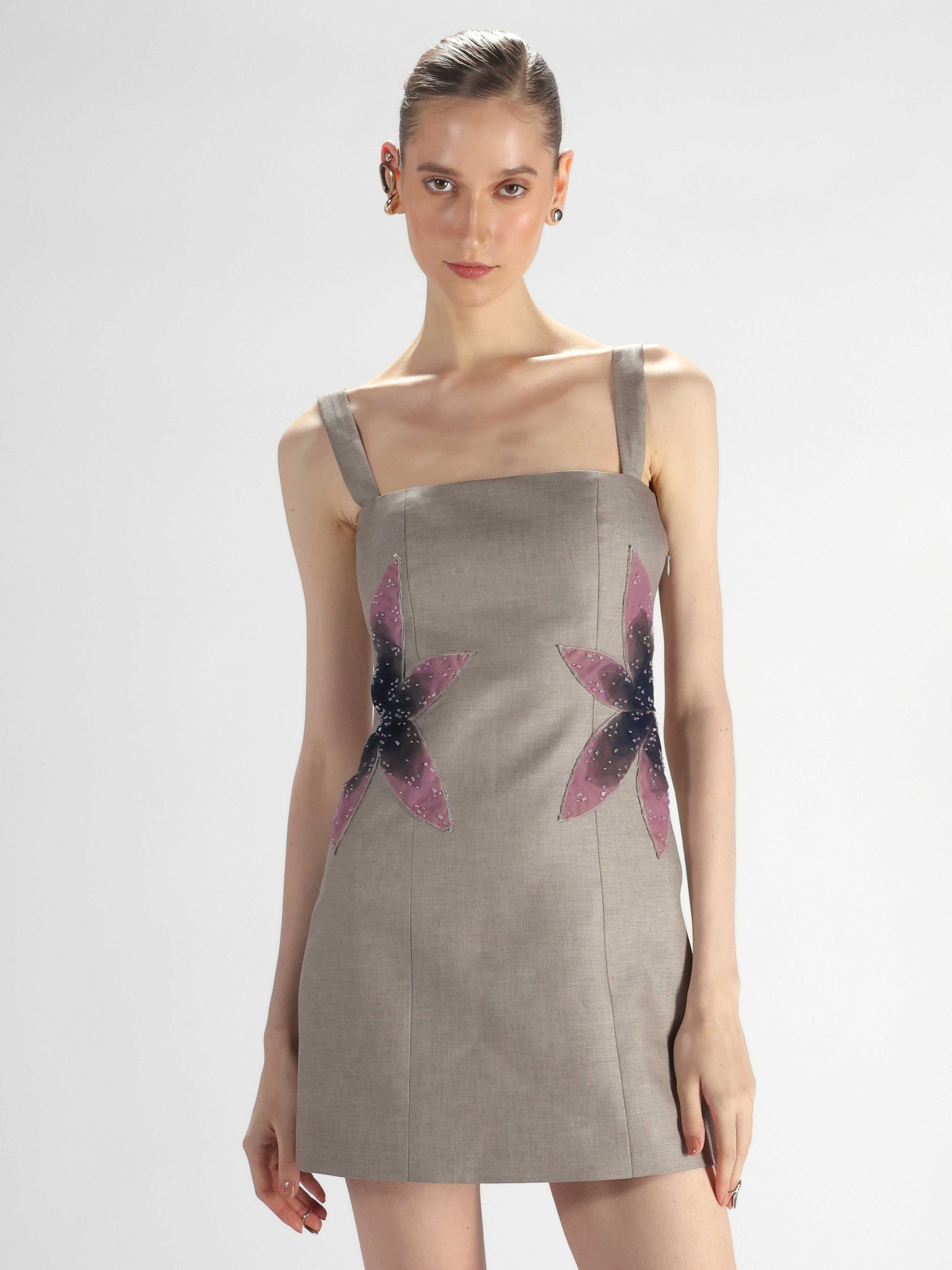 A short fitted dress is crafted in grey suiting fabric and features floral embroidery on the waist. The embroidery is created using layered net, forming an ombre effect in shades of grey, pink, and blue. Designed with a square neckline, slim straps, and a concealed side zip fastening for a clean finish.