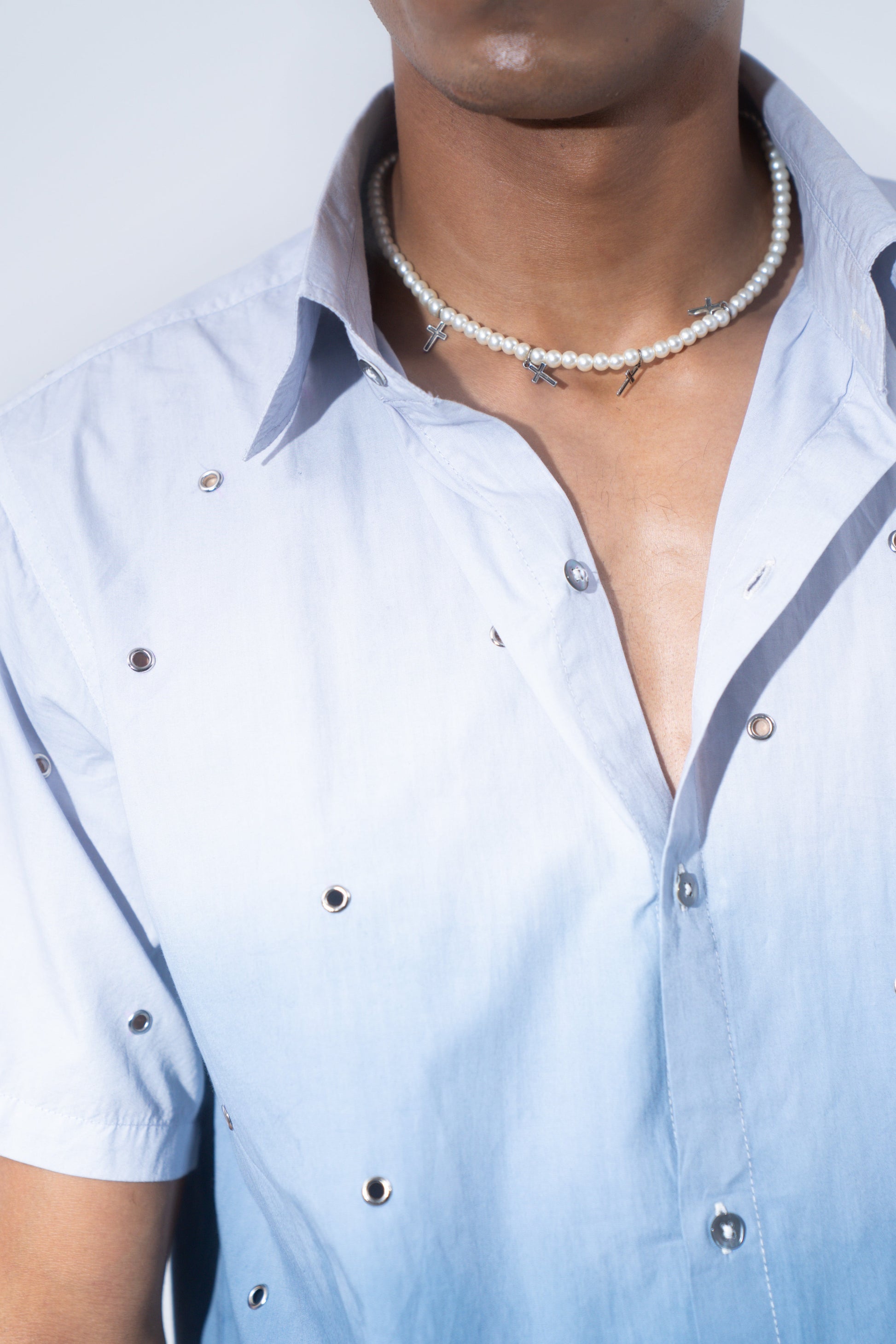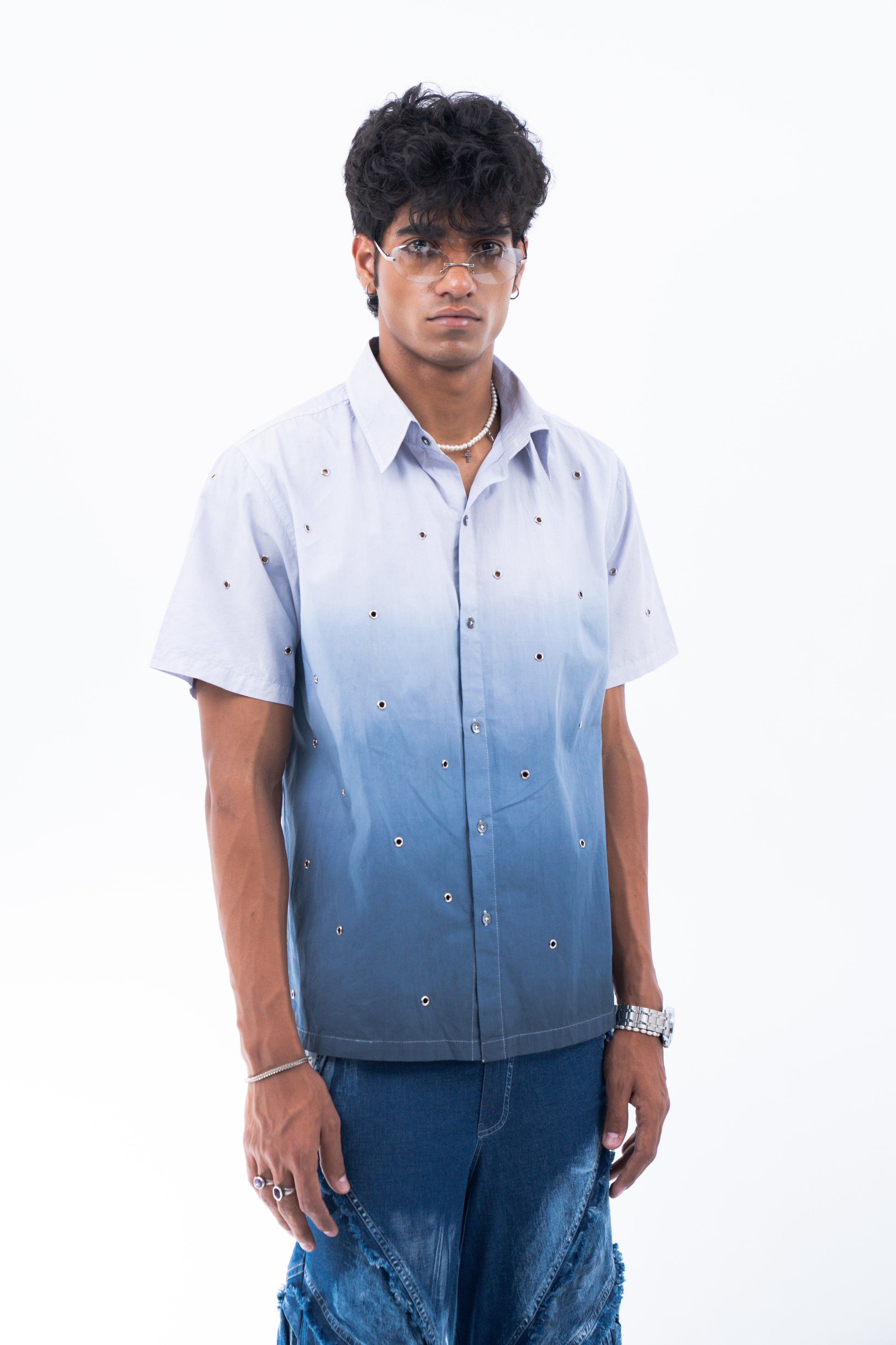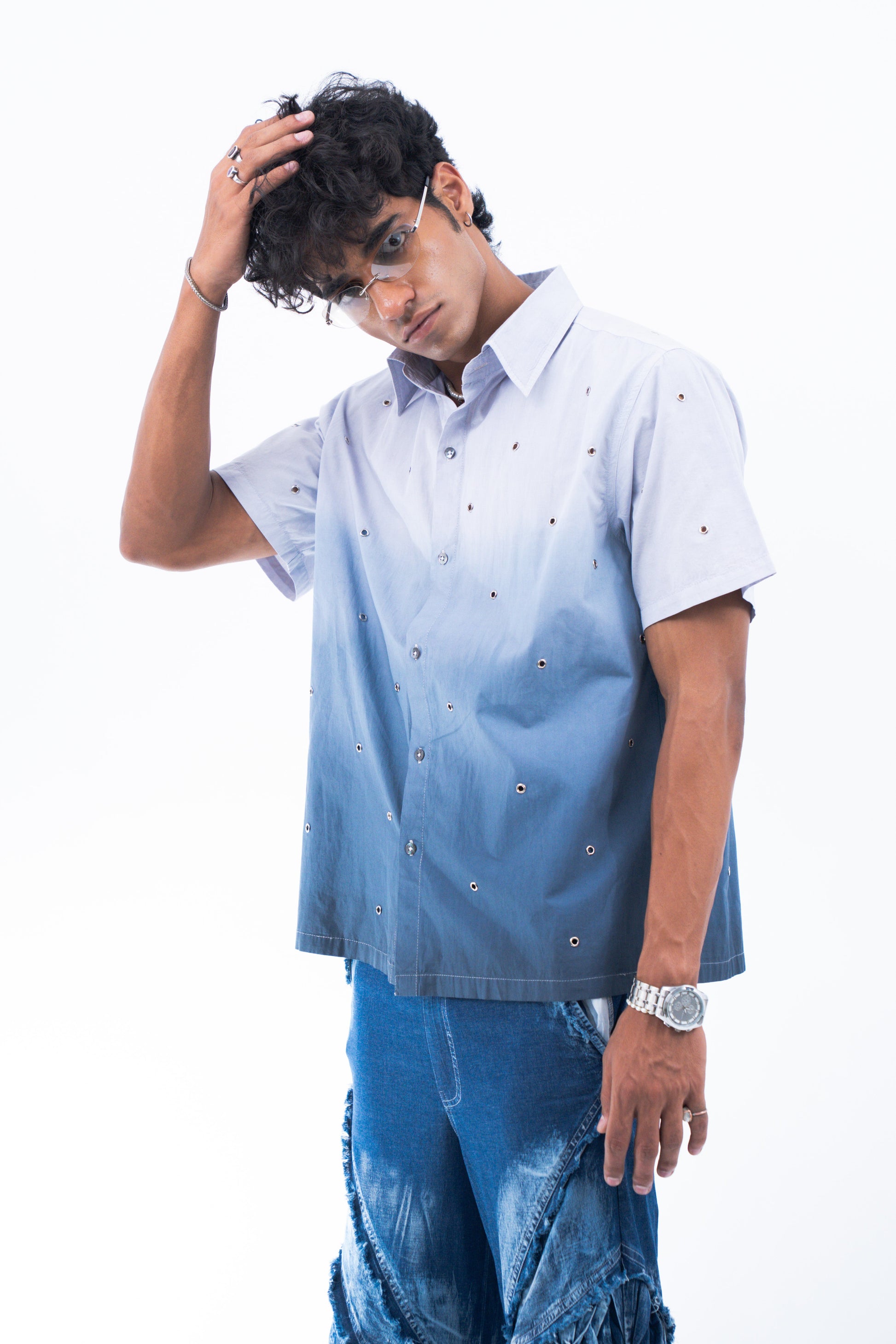 Made in a light and breathable cotton poplin fabric, this half-sleeve shirt features a carefully crafted creeping ombre in shades of blue emerging from the hem and fading along the way. All over eyelet details in silver colour add to the design while making the shirt airy and breezy. With black mother of pearl buttons as closure, this shirt is perfect for your summer endeavours.