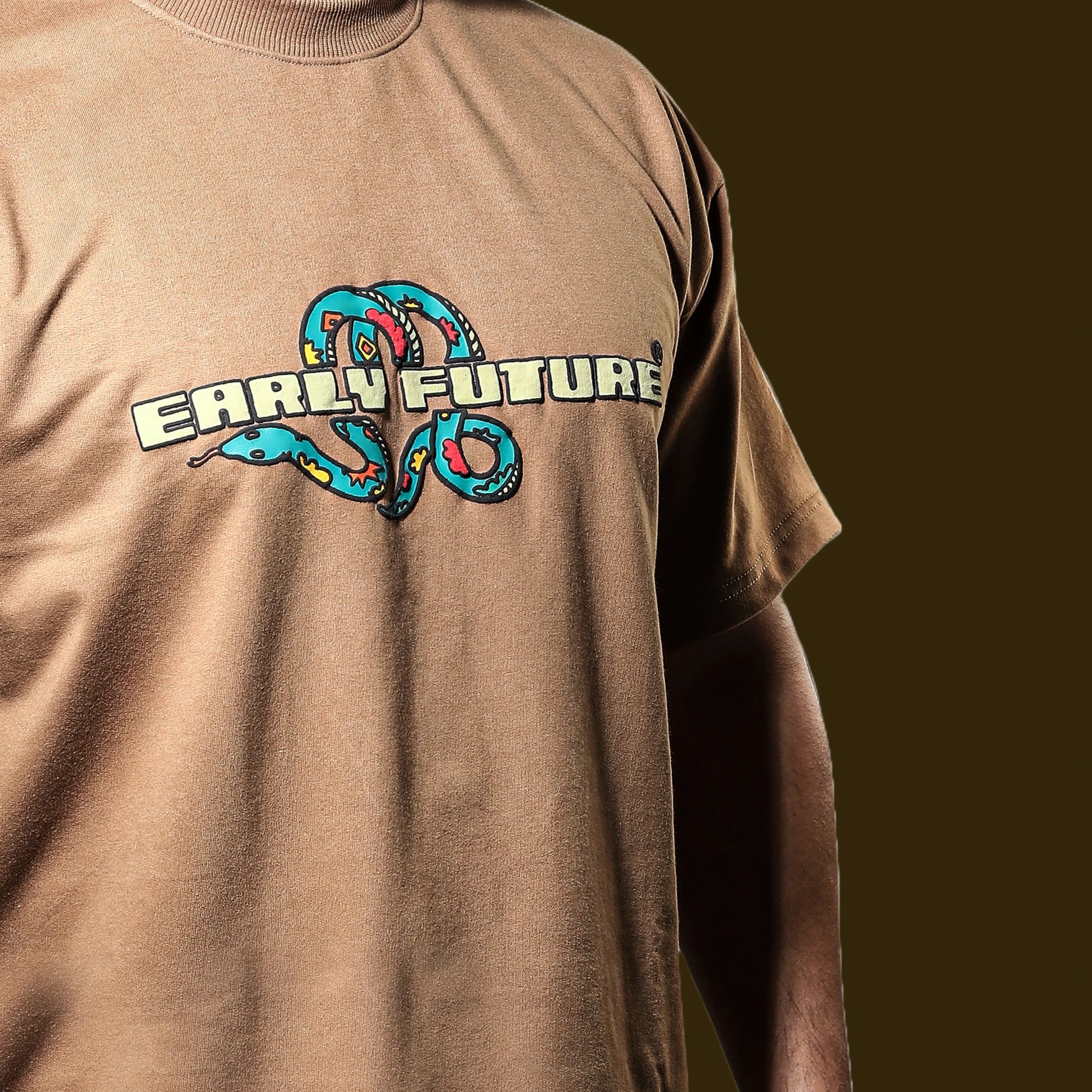 The front of the tee keeps it clean but powerful with a centered graphic that instantly commands attention. A vibrant snake weaves through bold, distorted typography that reads “EARLY FUTURE.” The serpent detailed in a high-contrast mix of teal, red, orange, yellow and black wraps itself tightly around the text, symbolizing both control and chaos. The minimal yet intense placement gives the shirt a balanced aesthetic: calm in the front, wild in the back.