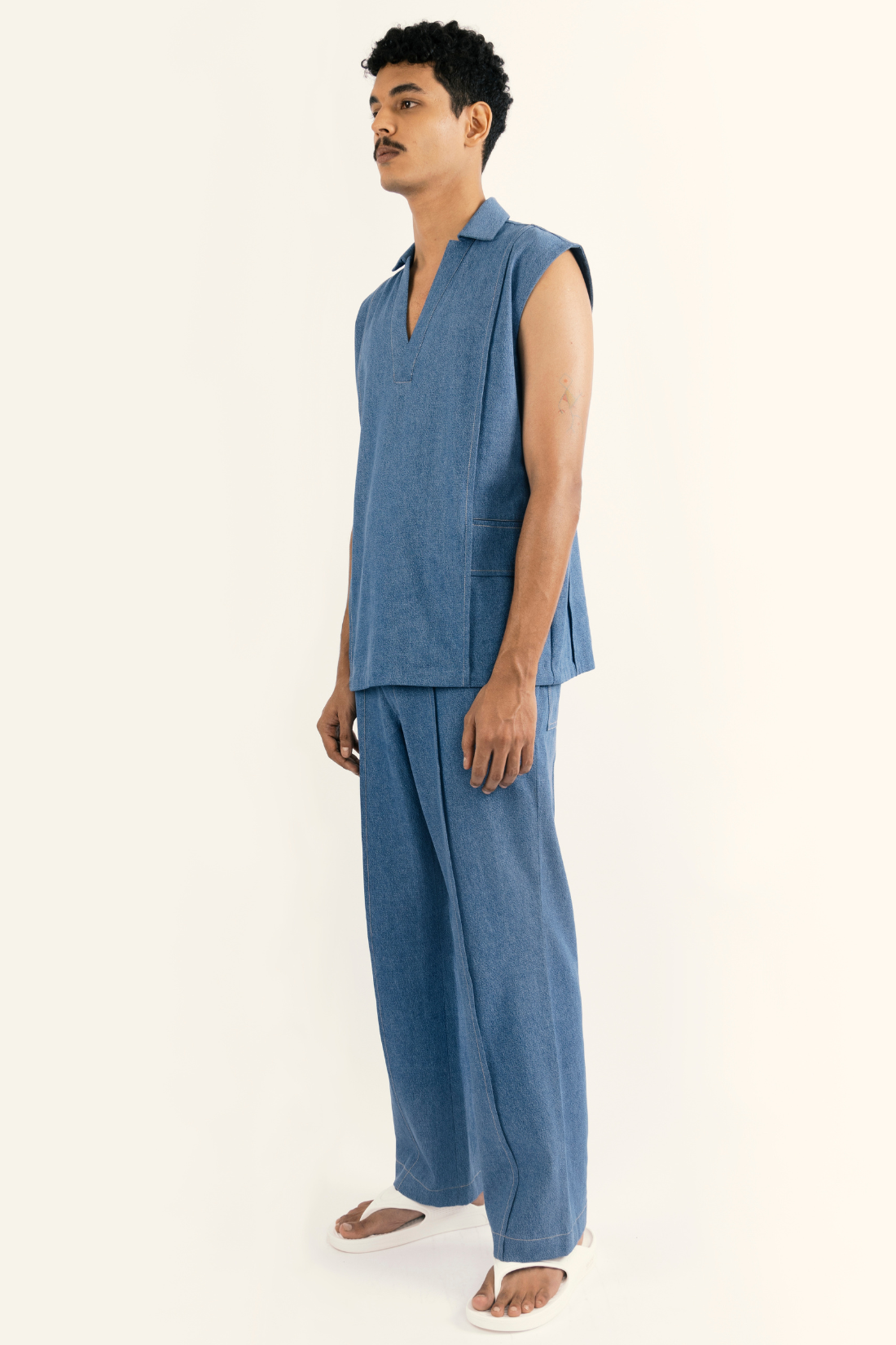 generous collar - broad placket - front and back side pleats - two front pockets - contrast top stitch detail - regular fit