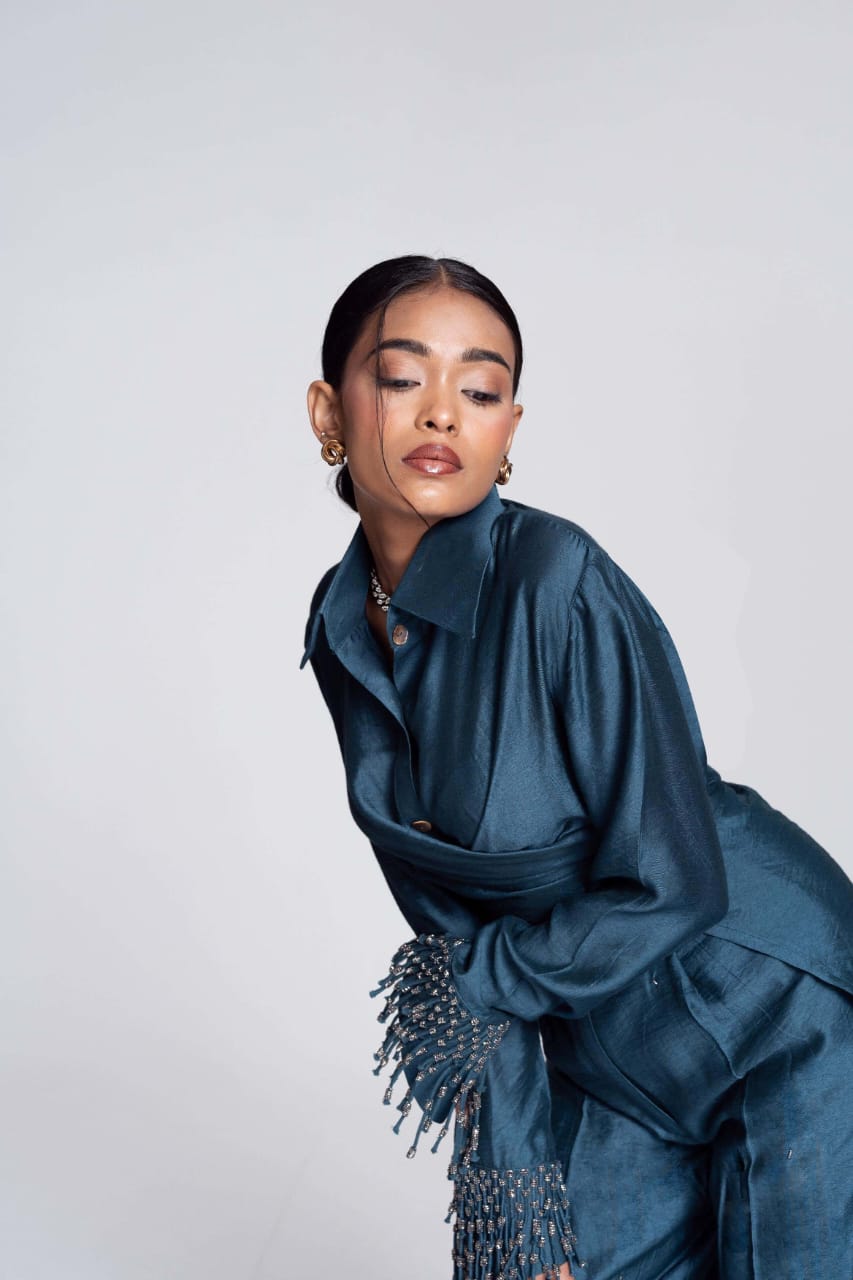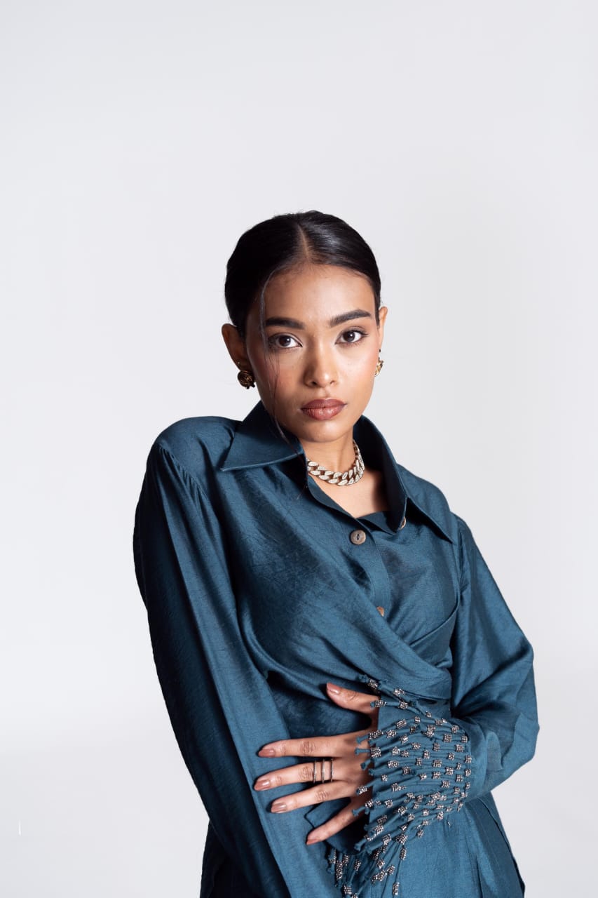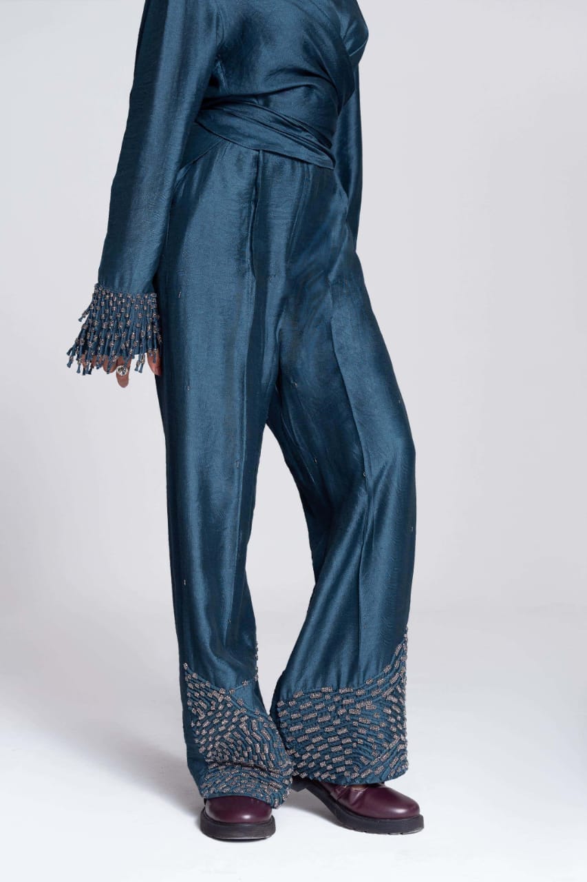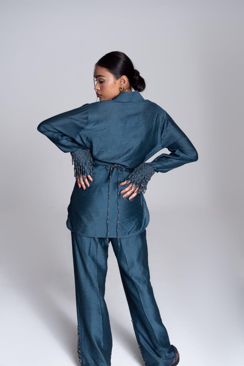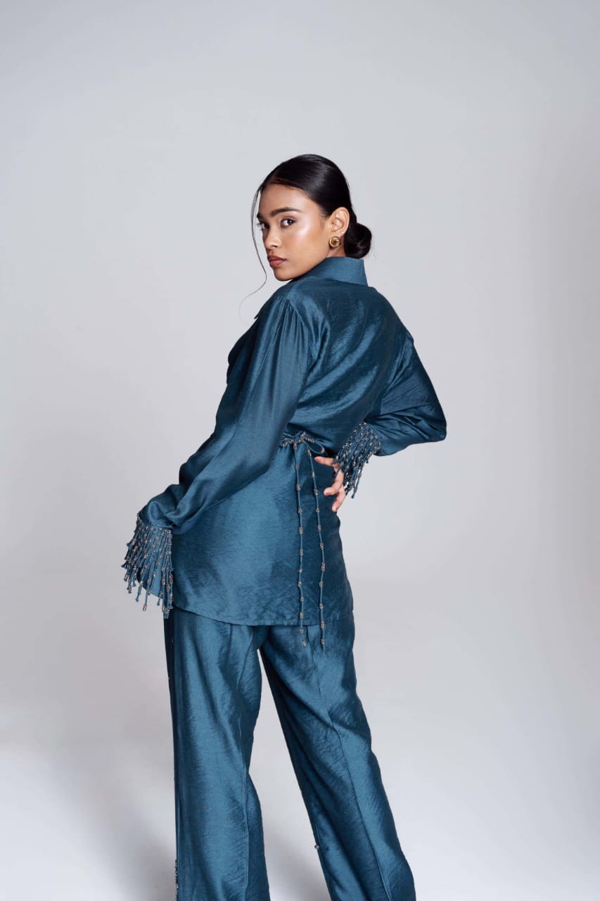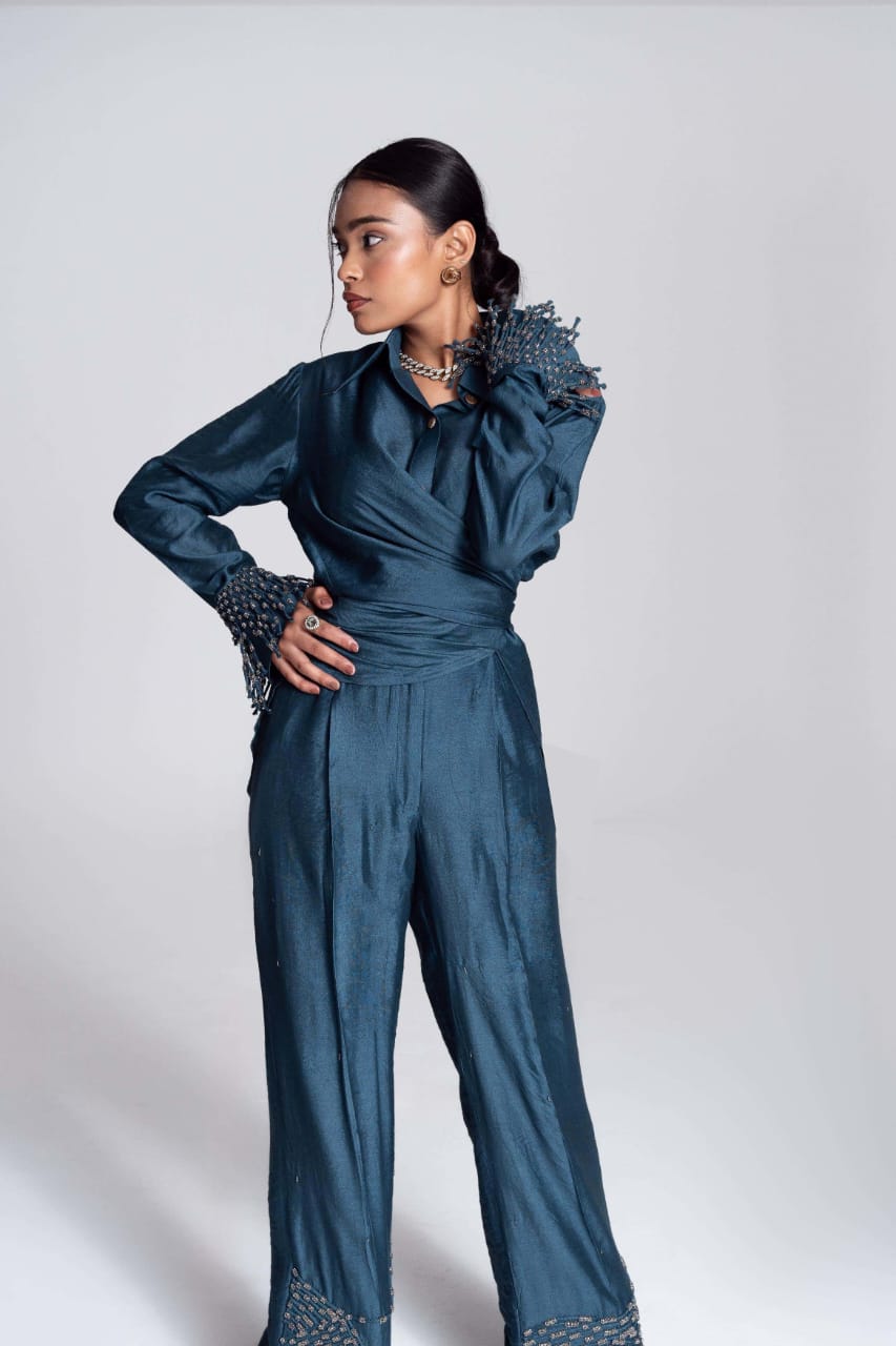 The Convertible Wrap Shirt Set is skillfully designed, it features a wrap-around style complemented by a seamless placket. Whether worn loosely as a relaxed button-down or wrapped tightly for a more defined silhouette, this shirt empowers you to exude confidence effortlessly in every scenario. It is paired with a pair of straight leg hand embroidered trousers and as the name suggests it takes inspiration from the celestial and captures its essence with its polished colour.