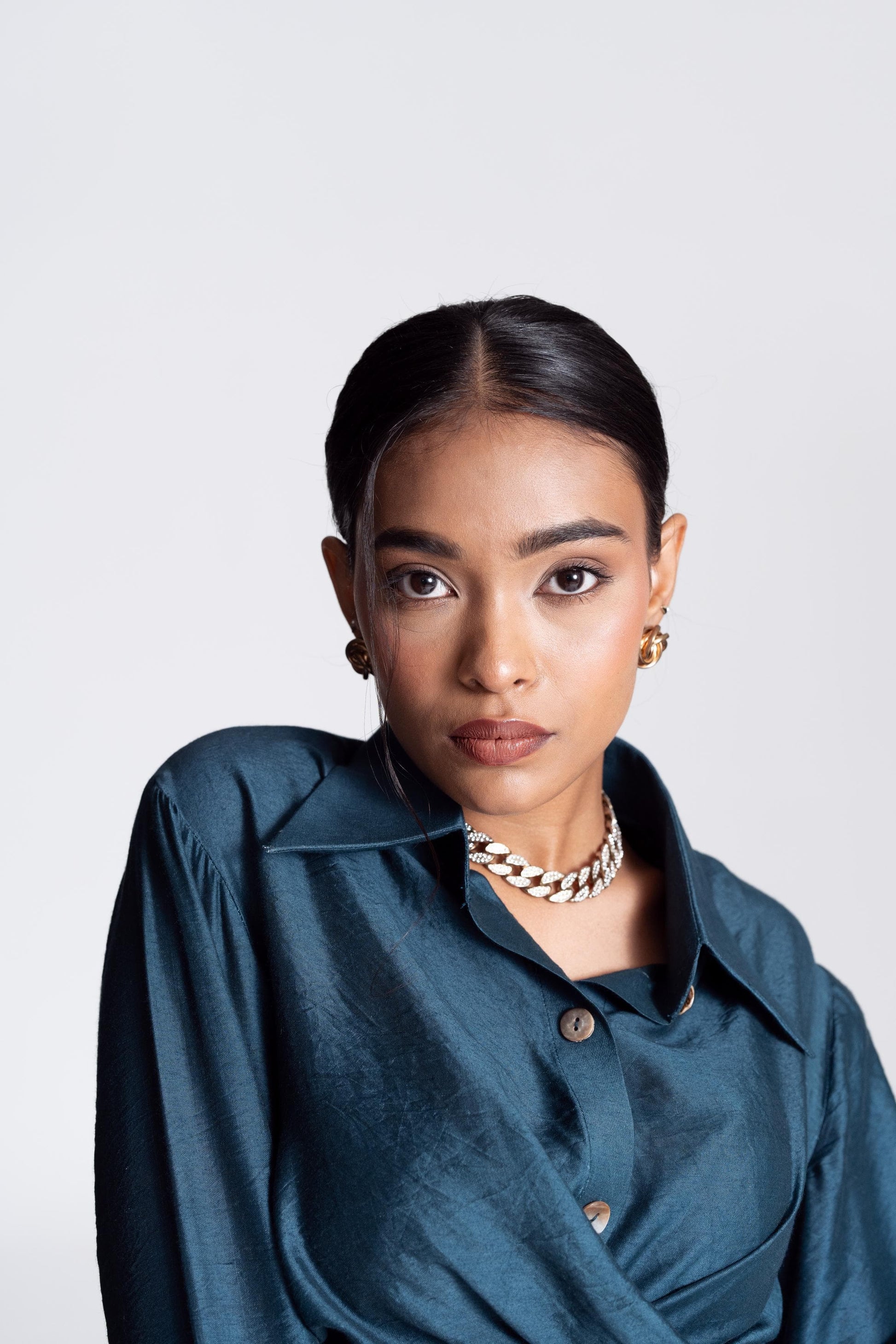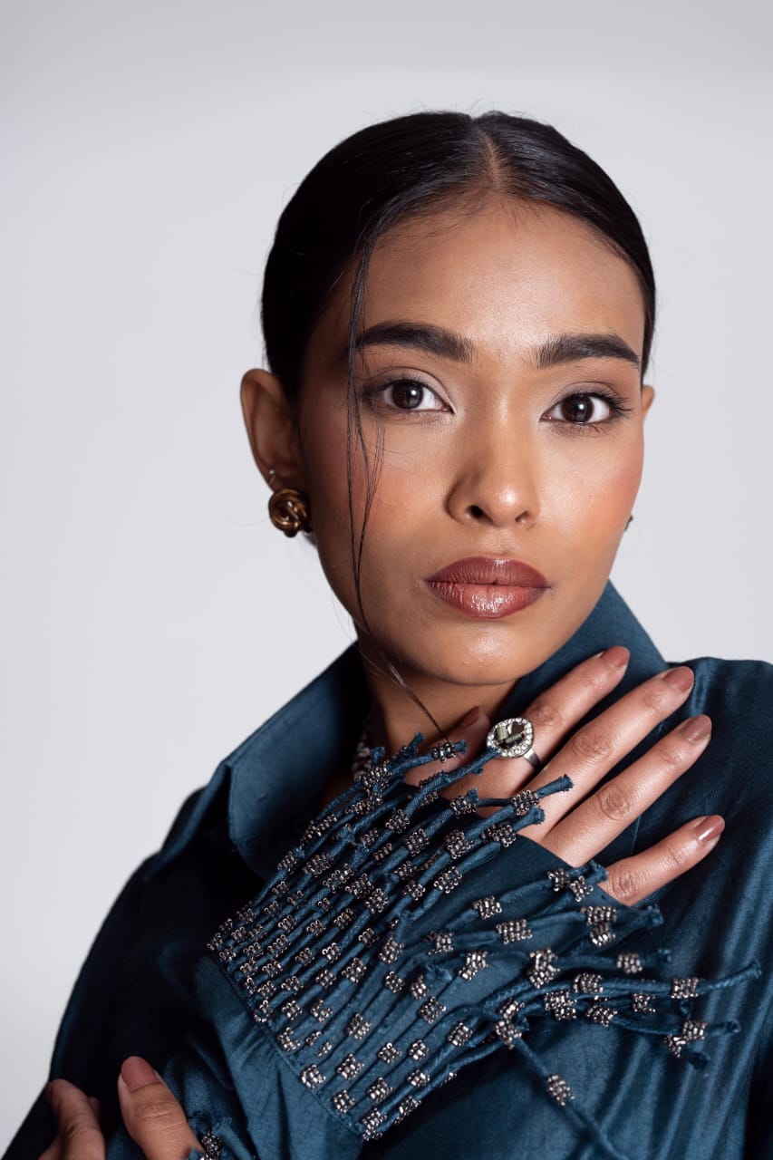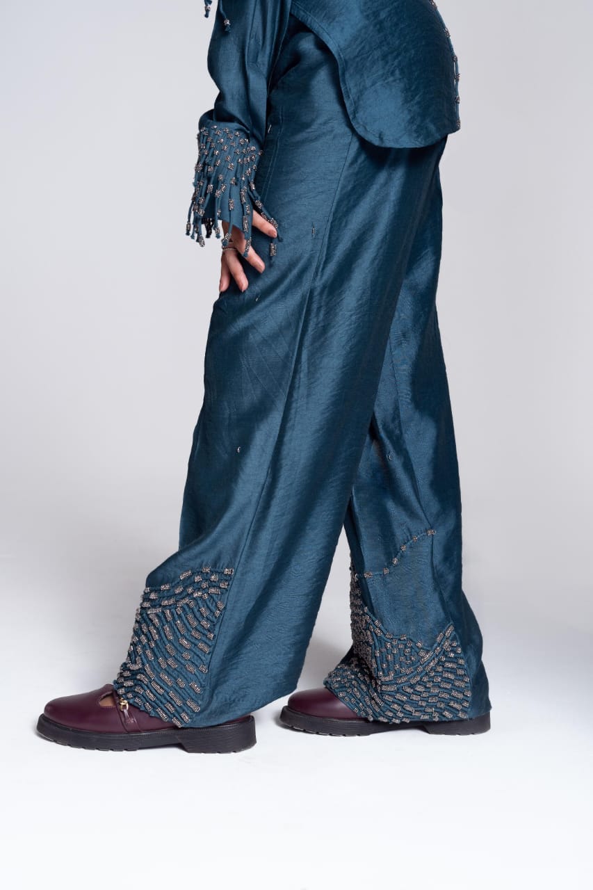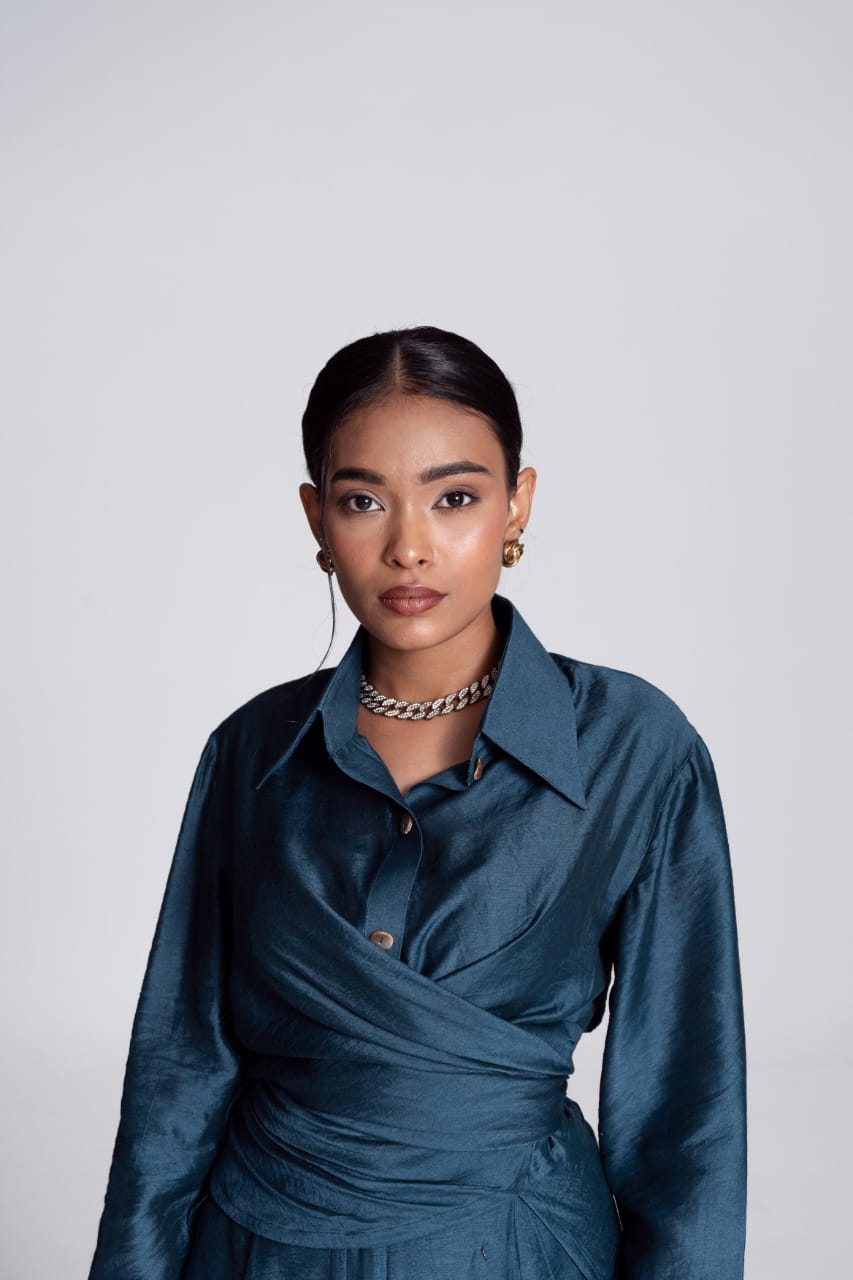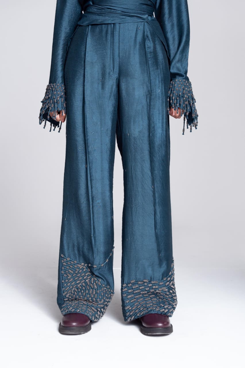 The Convertible Wrap Shirt Set is skillfully designed, it features a wrap-around style complemented by a seamless placket. Whether worn loosely as a relaxed button-down or wrapped tightly for a more defined silhouette, this shirt empowers you to exude confidence effortlessly in every scenario. It is paired with a pair of straight leg hand embroidered trousers and as the name suggests it takes inspiration from the celestial and captures its essence with its polished colour.
