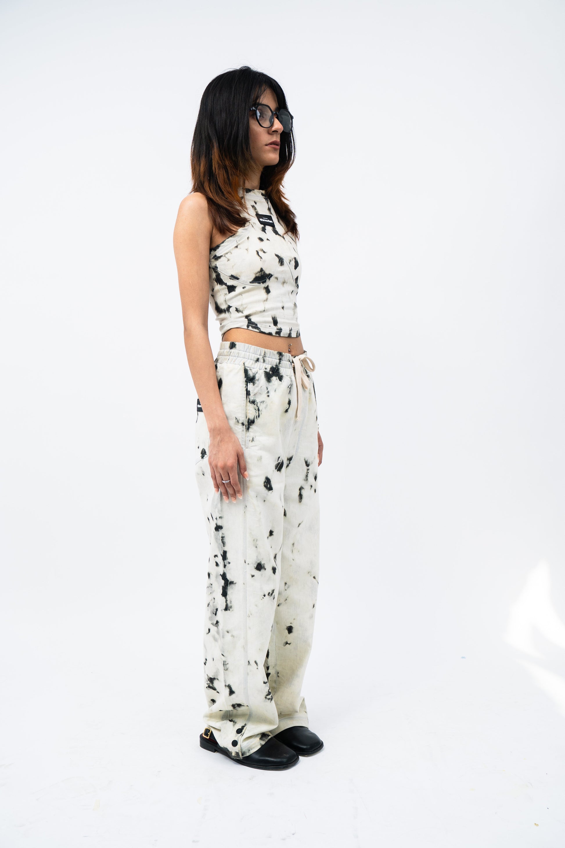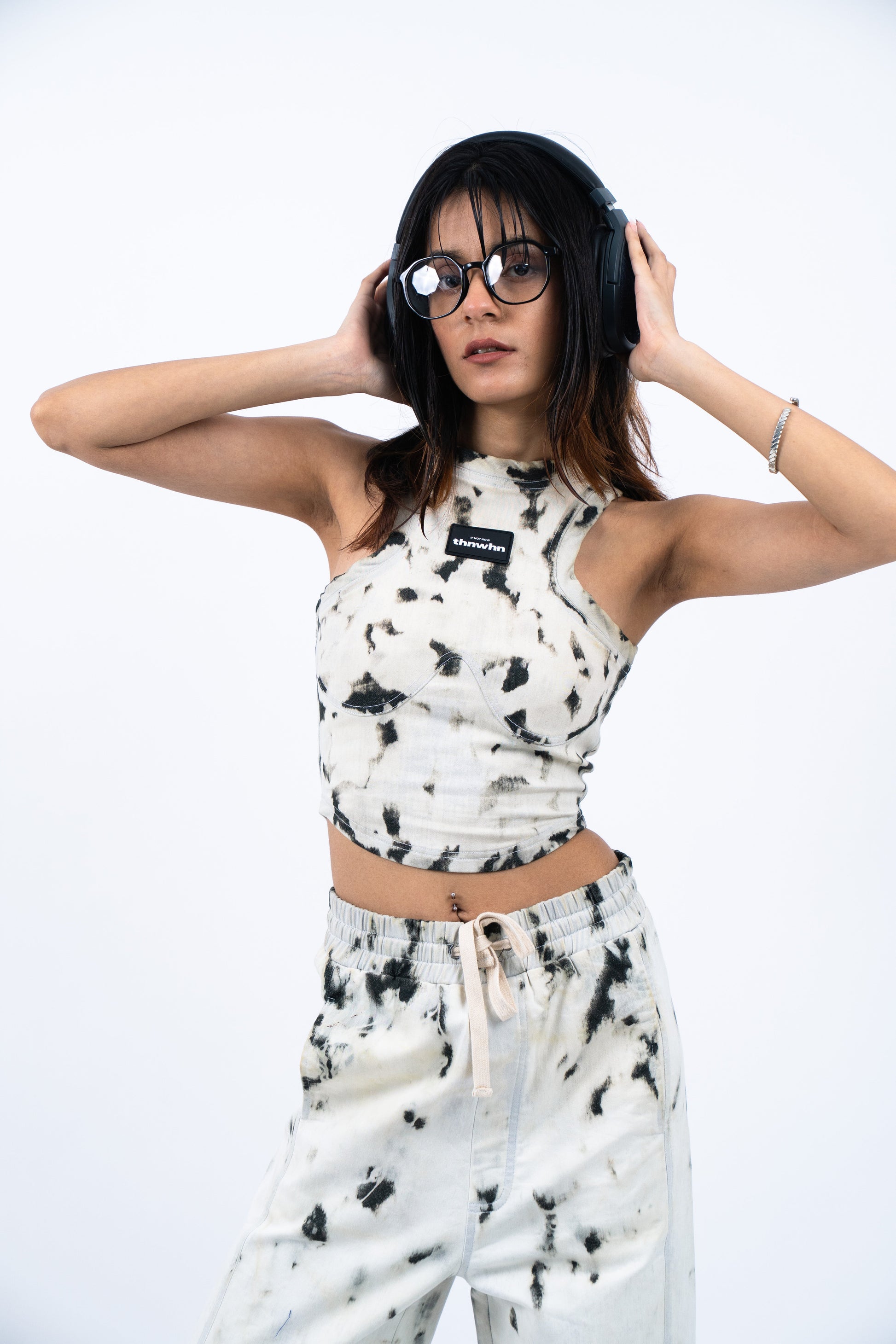 Fitted crop top featuring a unique halter neckline and corset panelling along chest. It is made in a super comfortable cotton terry lycra fabric dyed in a black and white colour through acid wash technique perfect for summer. Signature branding on chest with metallic zipper fastening at the back.