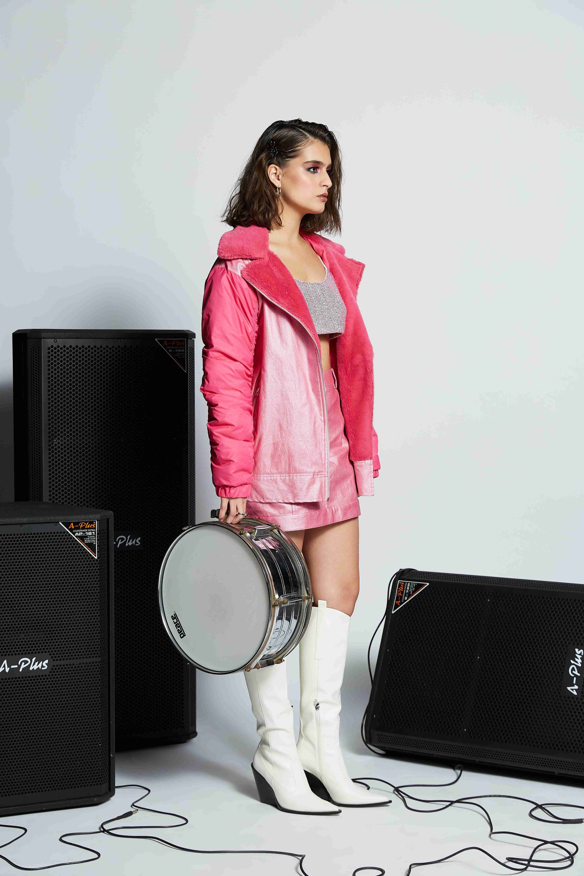 Oversized biker jacket juxtaposed with soft padded bomber sleeves. Featuring faux lining with double breasted fastening on the front with zip.