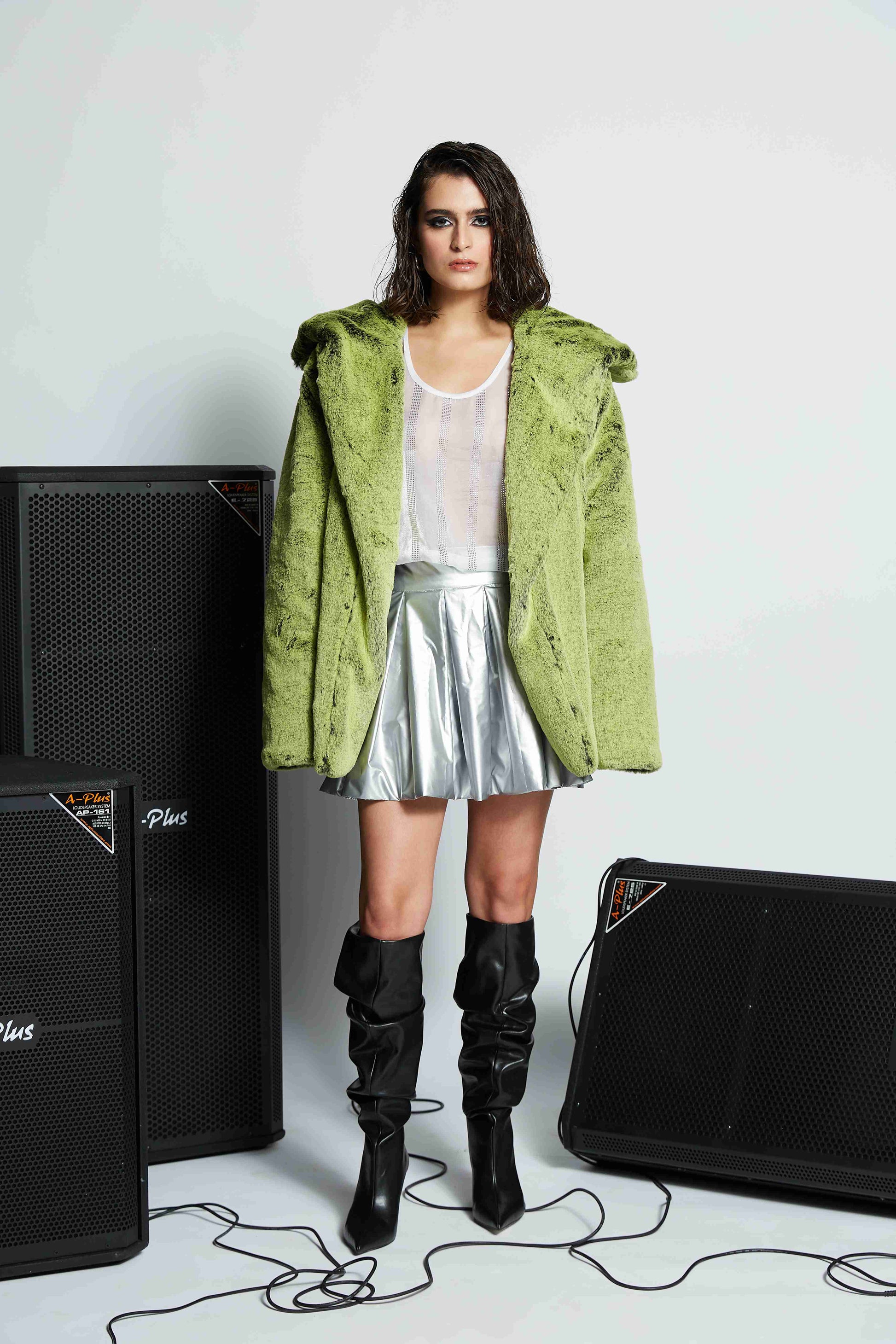 Oversized Two-Tone faux jacket with long lapel collar and sleeves. With contrasting lining with light padded interiors with wavy lines design.