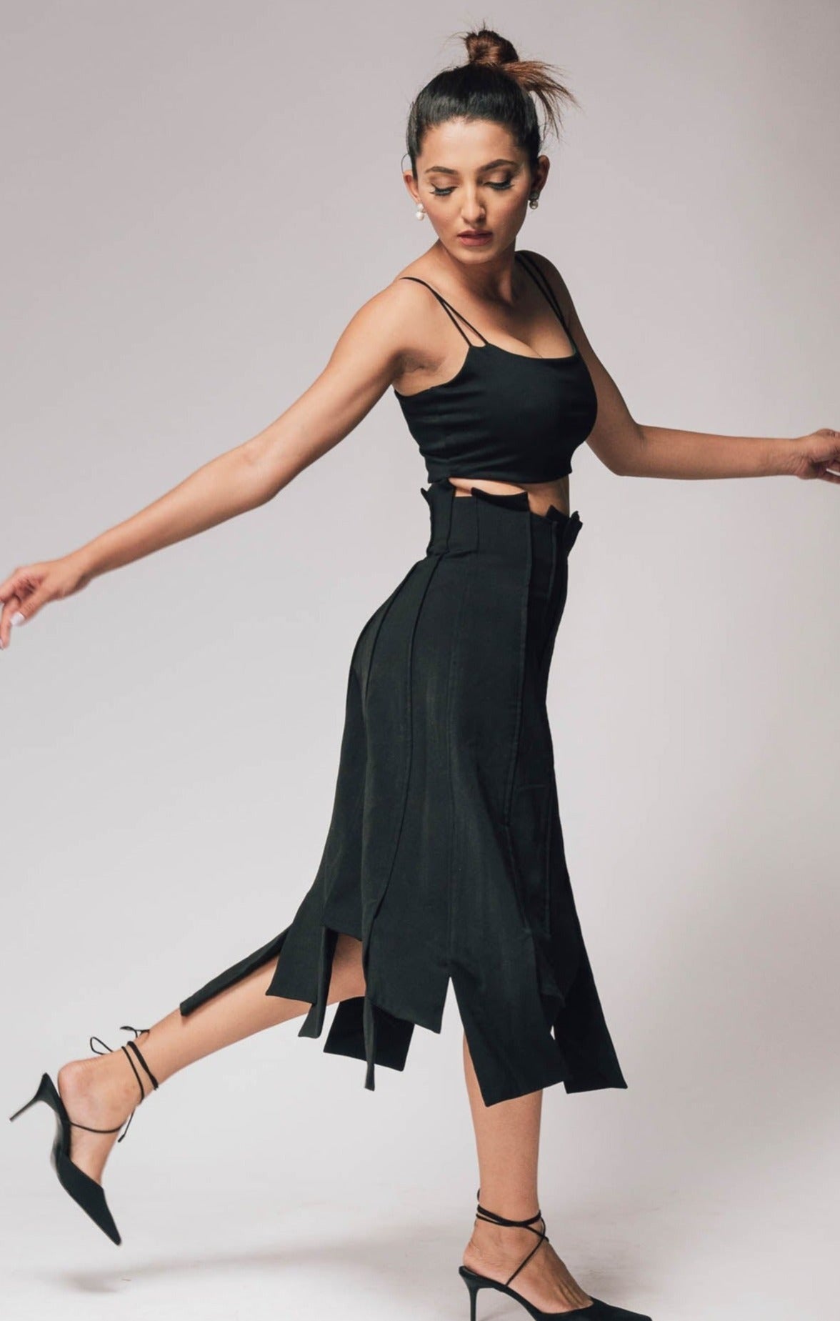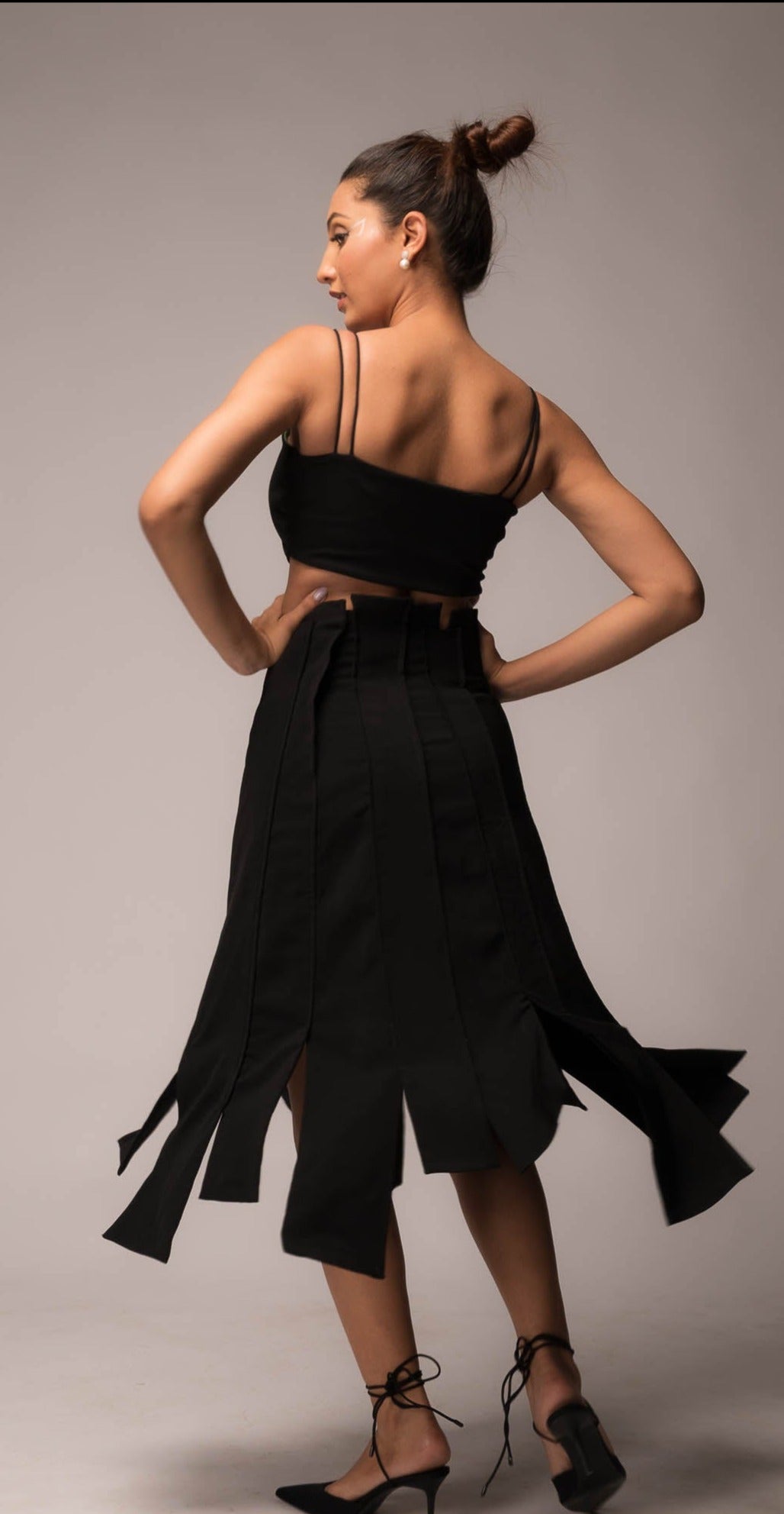 A fresh take on a classic black midi skirt featuring individually tailored panels. Wear it with a tee/ shirt/ blazer/ or bralette to dinners/ events/ cafes/ get-togethers/ concerts. You can wear it EVERYWHERE