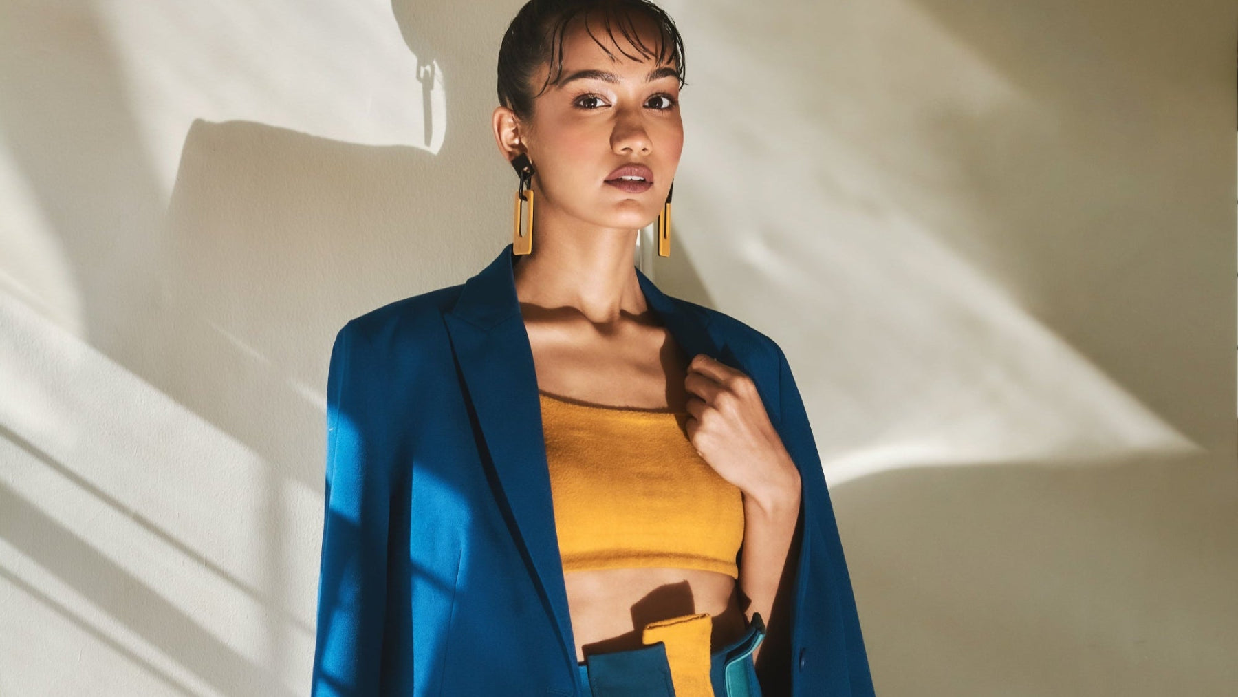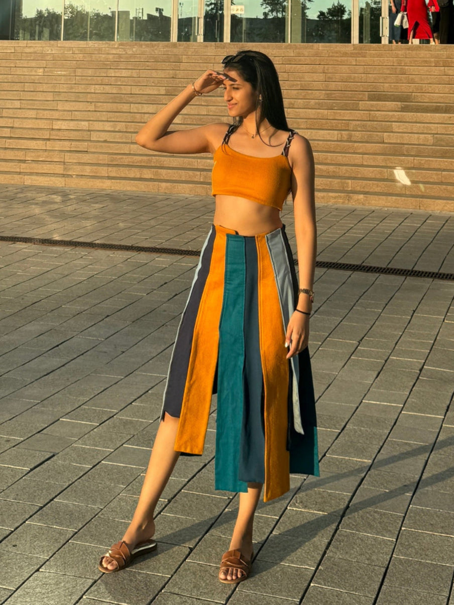 Perfect for vacations, this co-ord is a must-add statement. The hanging panels, individually finished in premium fabrics make you stand out. It comes with our mustard bralette with an interesting hand-worked strap detail.