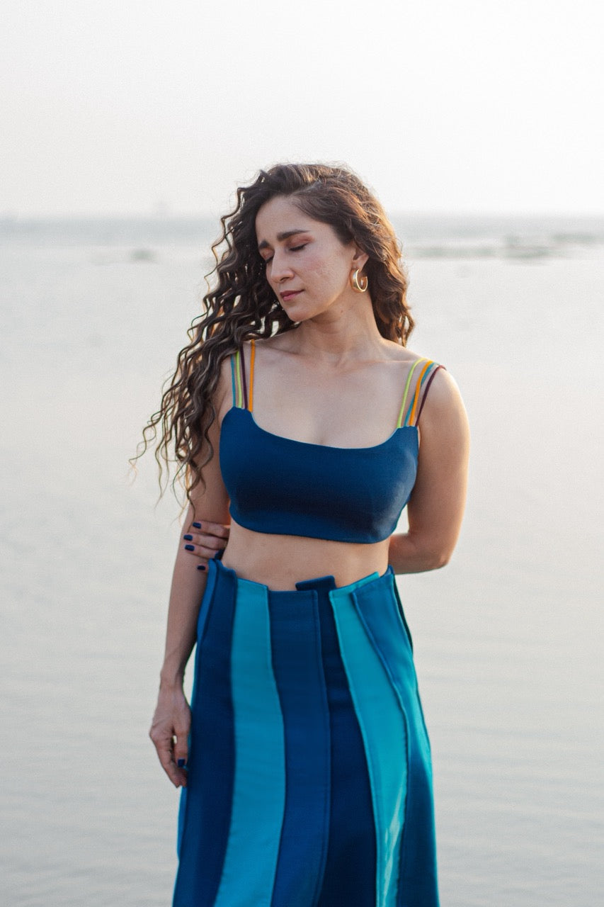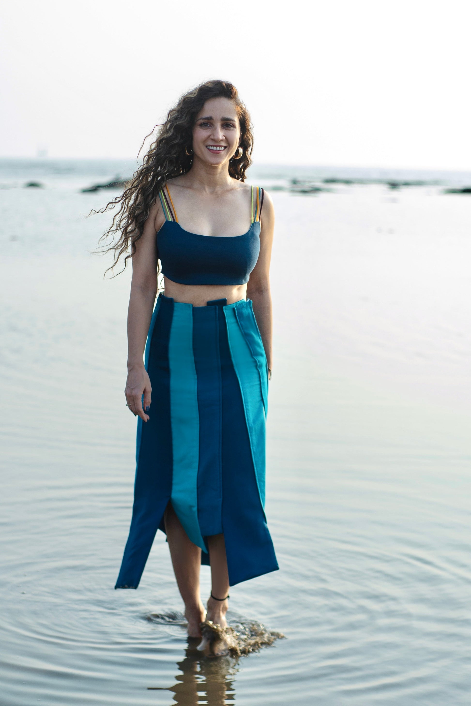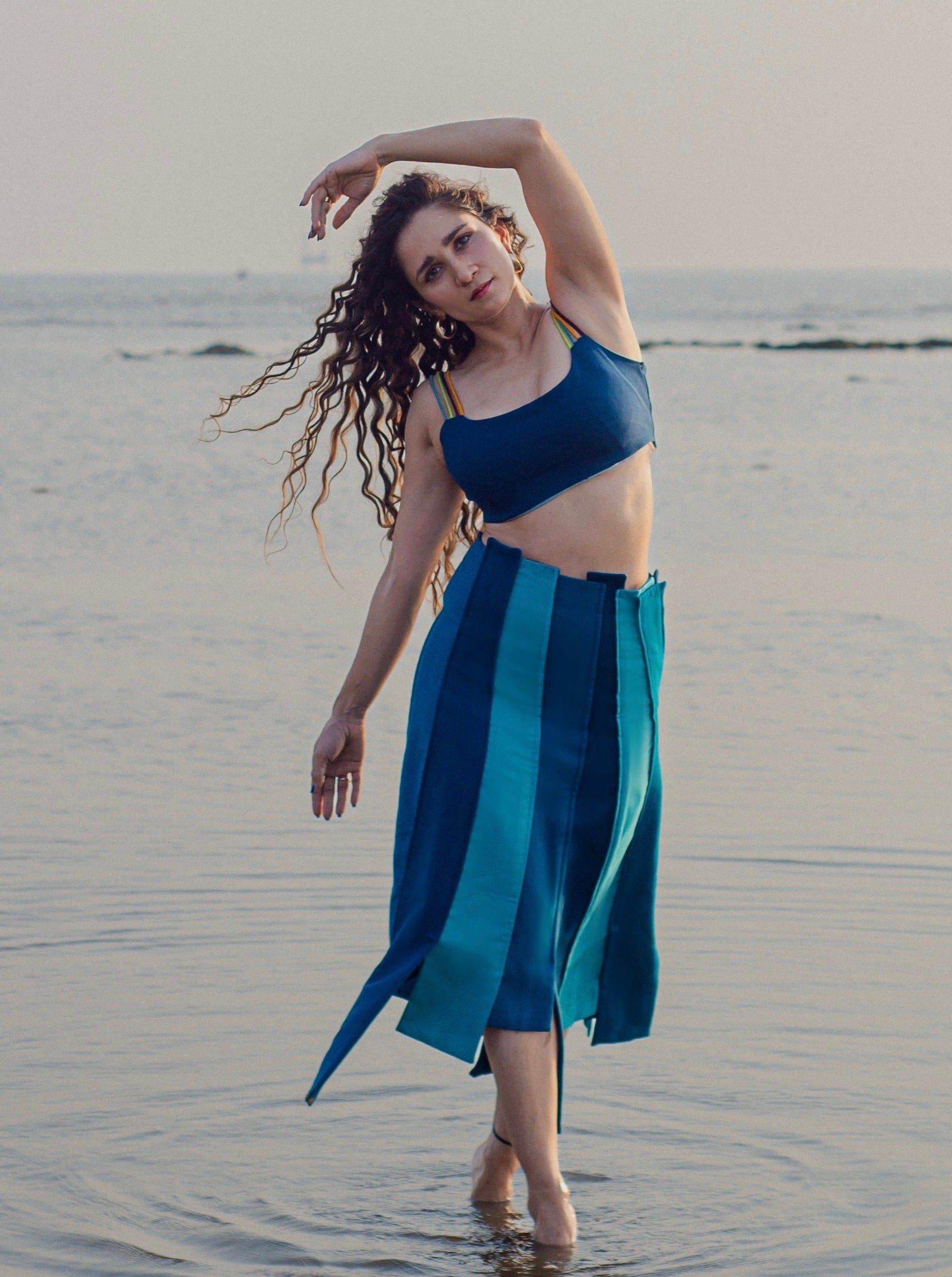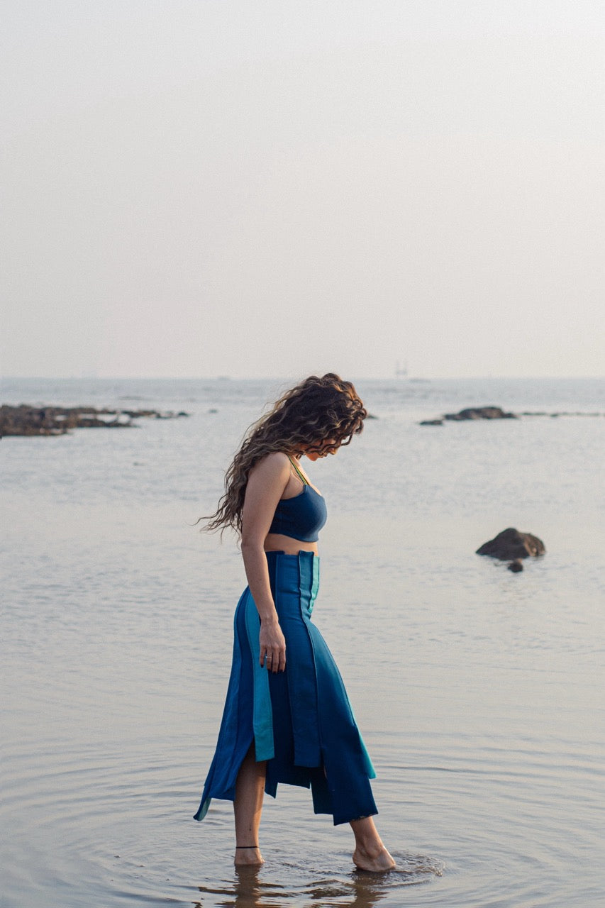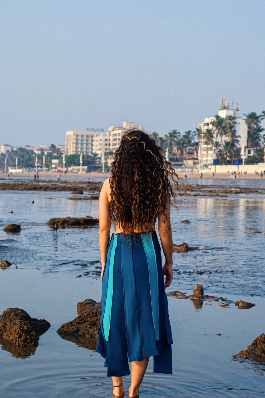 Inspired by the blues of the seas, here we depict ever-flowing water.Each panel is individually and thoughtfully stitched to create a flared silhouette with a high low hem giving a structured fall.