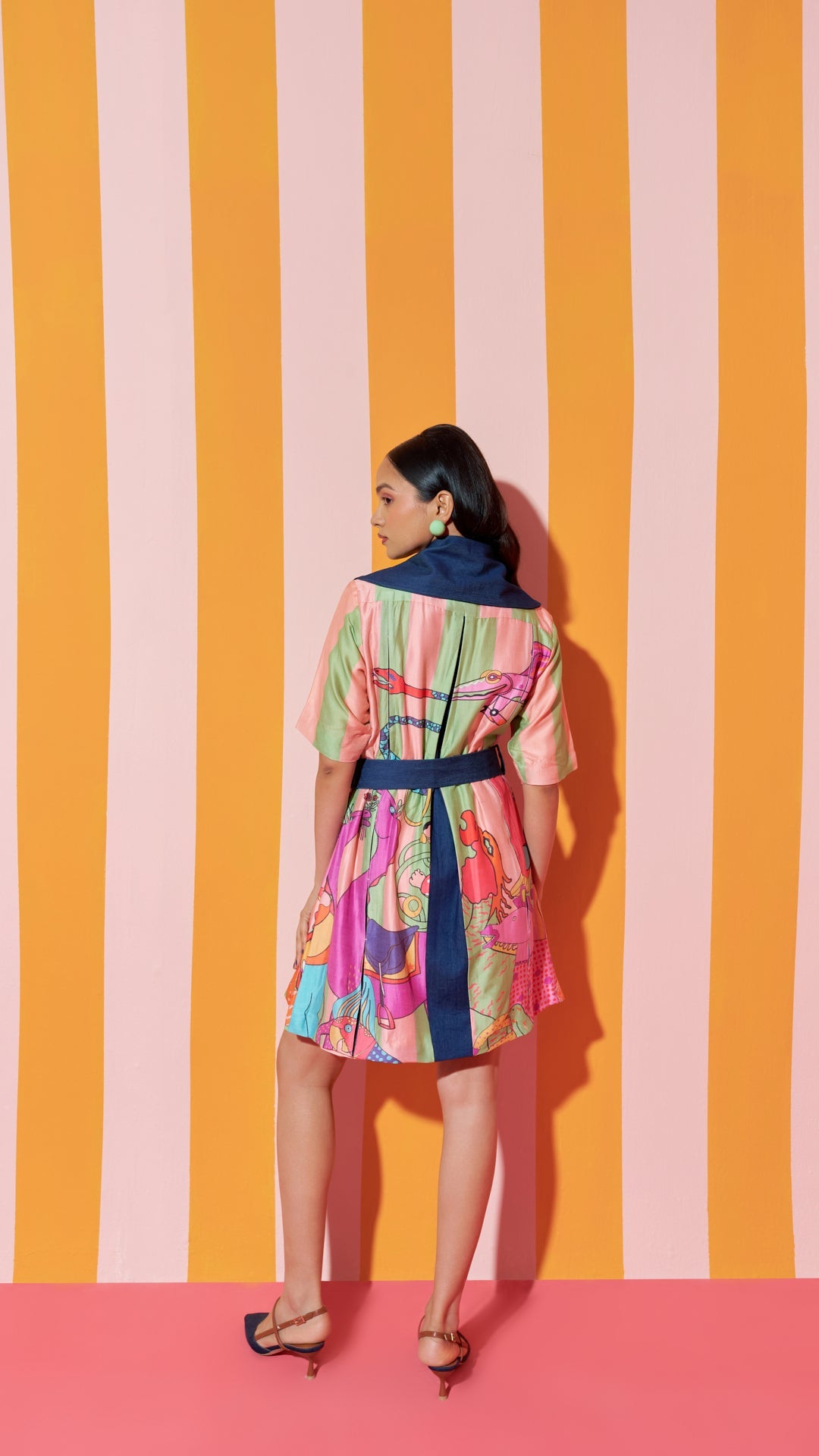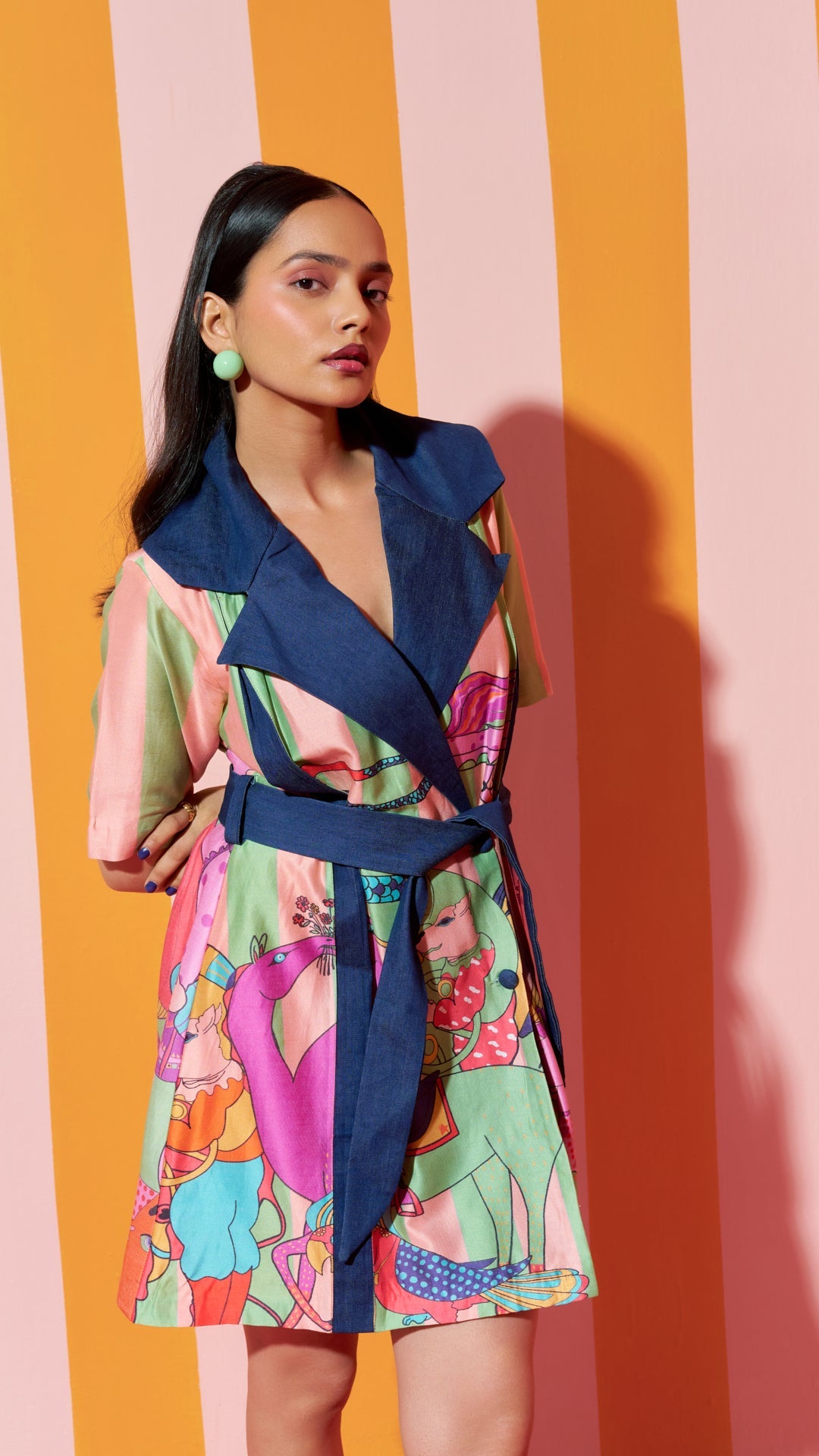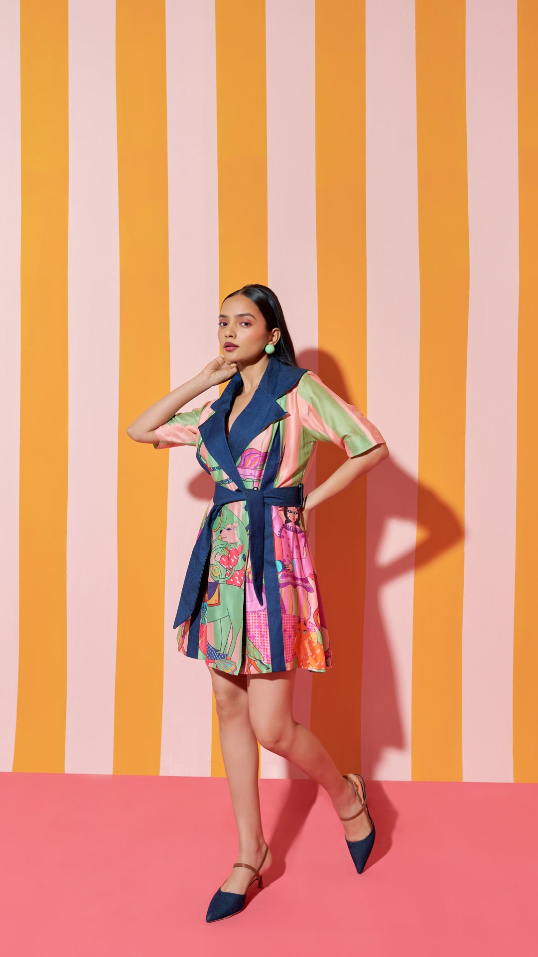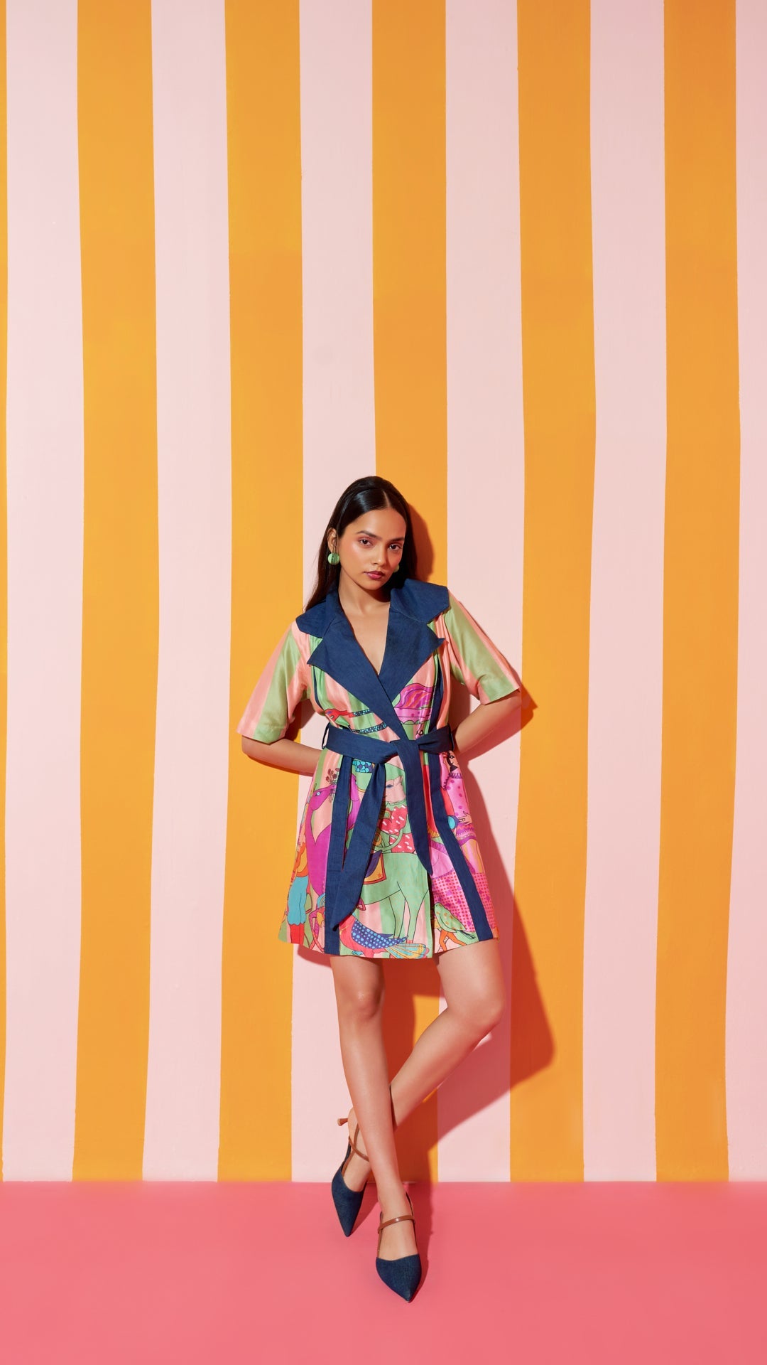 A relaxed fit blazer dress with a belt detailing at the waist and notched collar lapel. Denim pleating detail on the front and back.