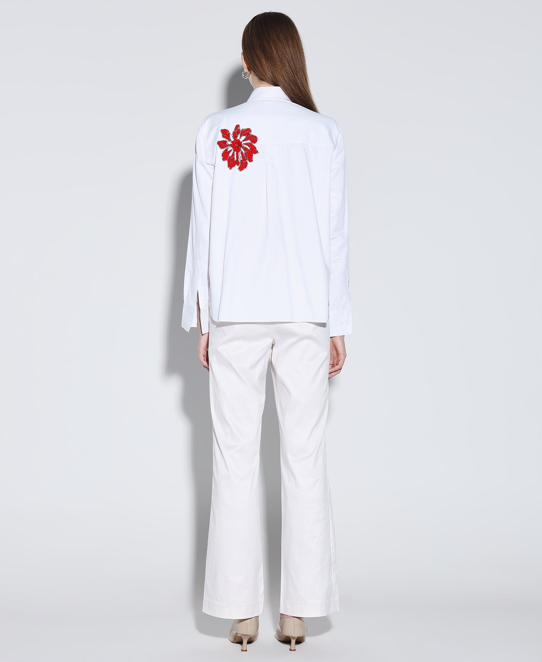 Classic white shirt tailored from a fine quality cotton satin fabric. Featuring an embellished wild floral abstract motif in a contrasting red color. Fit is relaxed.