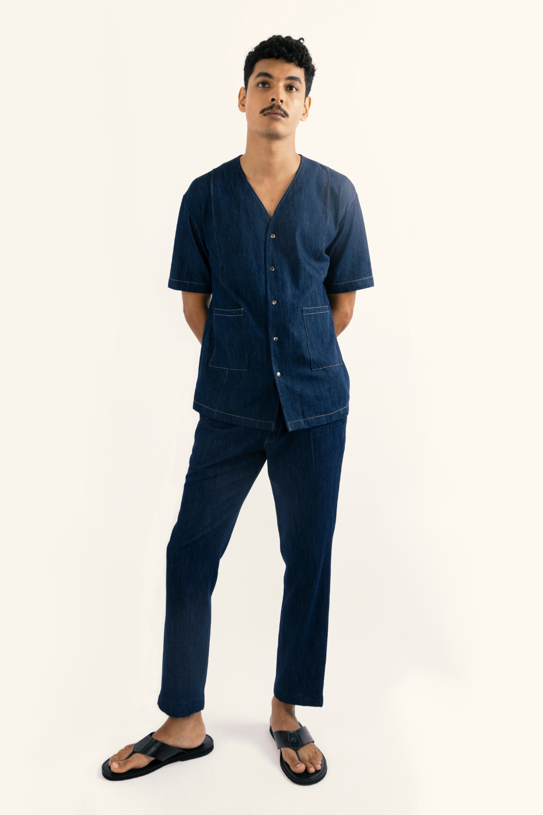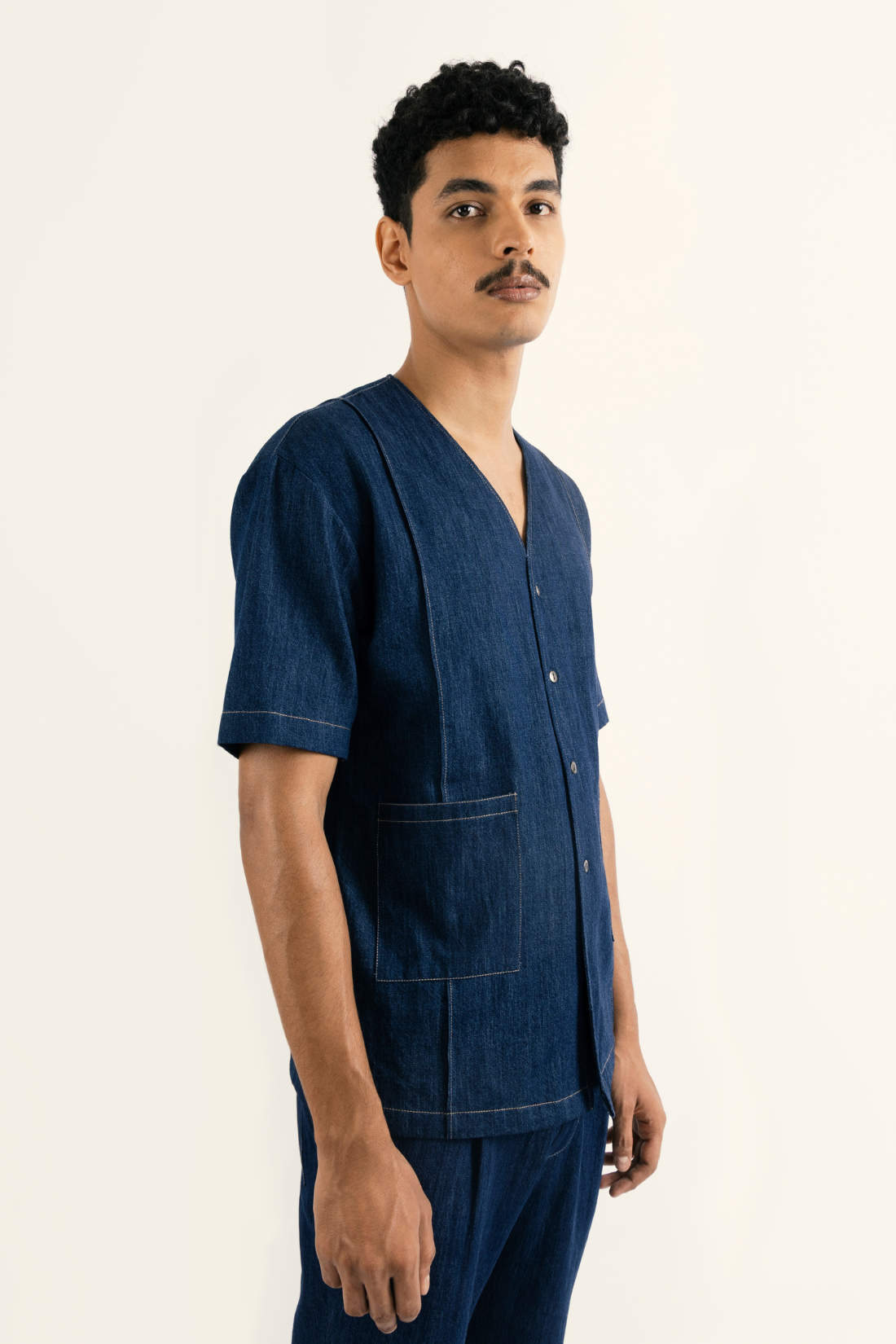 v neck - front patch pockets - front and back pintucks - half sleeves - contrast top stitch detail - front button down closure - regular fit