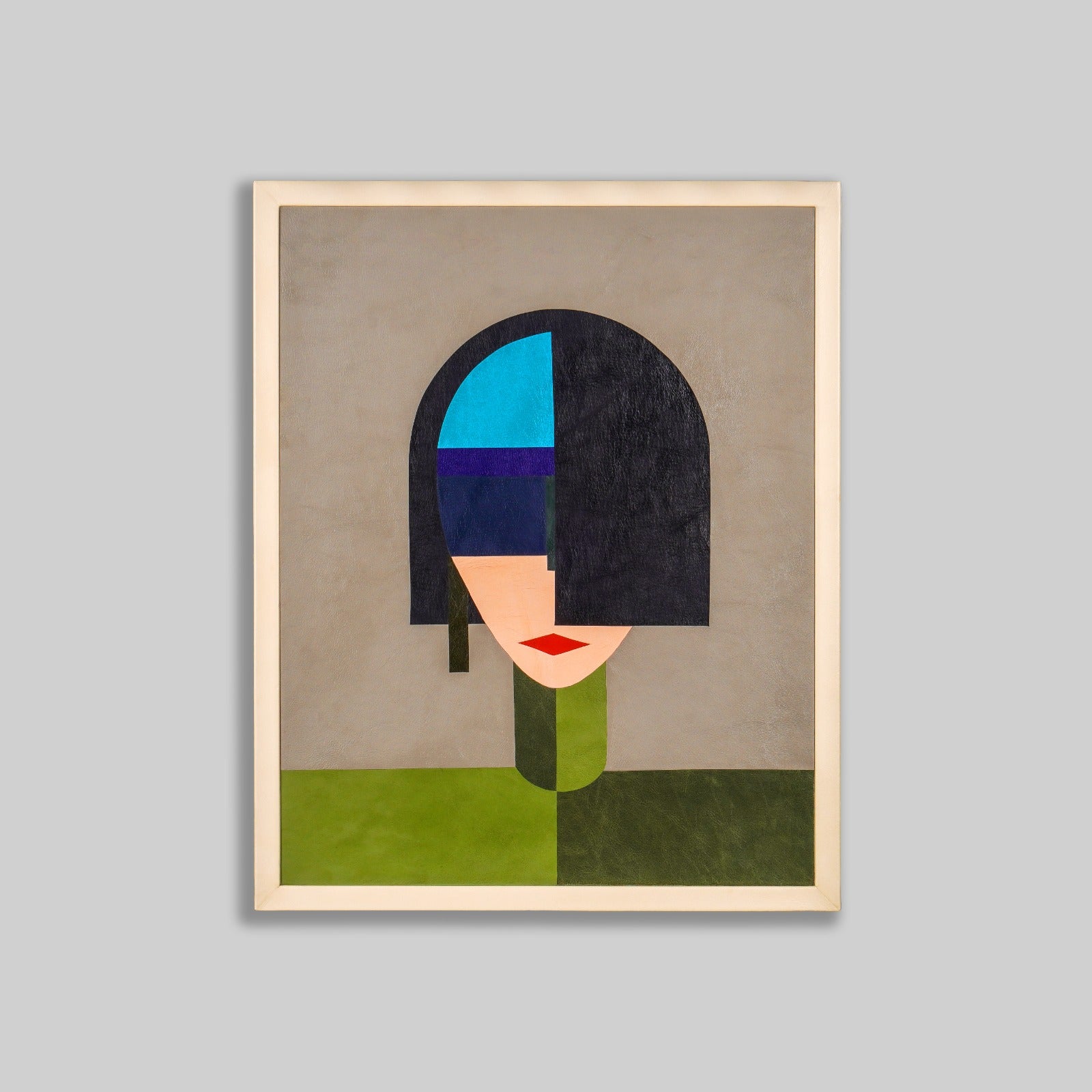This captivating leather wall art presents a bold and abstract portrait of a woman, showcasing a unique blend of geometric shapes and vivid colors. The skillfully used form and color conveys the complexities of human emotion and thought, creating a striking and thought-provoking piece. This modern artwork is a statement piece that will add a touch of intrigue and sophistication as a home decor choice for any space.