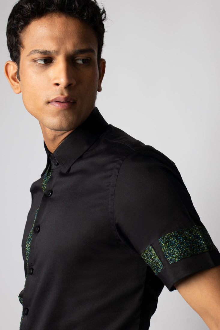 Our pause shirt features Shay's signature thread embroidery work along. Done with Resham threads in green monochrome, the richness it adds is striking. It is one of our bestsellers and can be worn over dinners, get togethers & vacations. Pair it with black/ beige/ sap green bottoms.