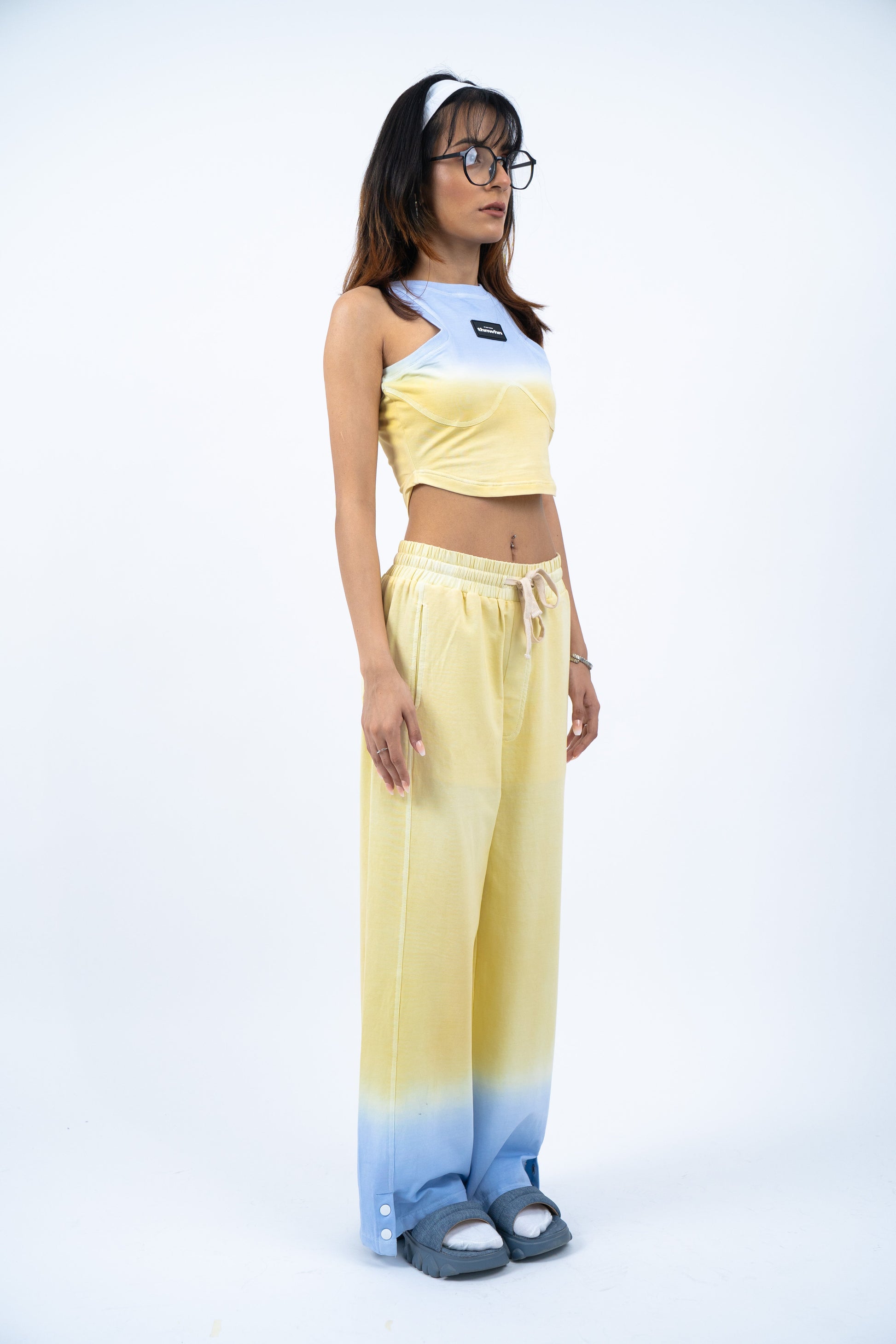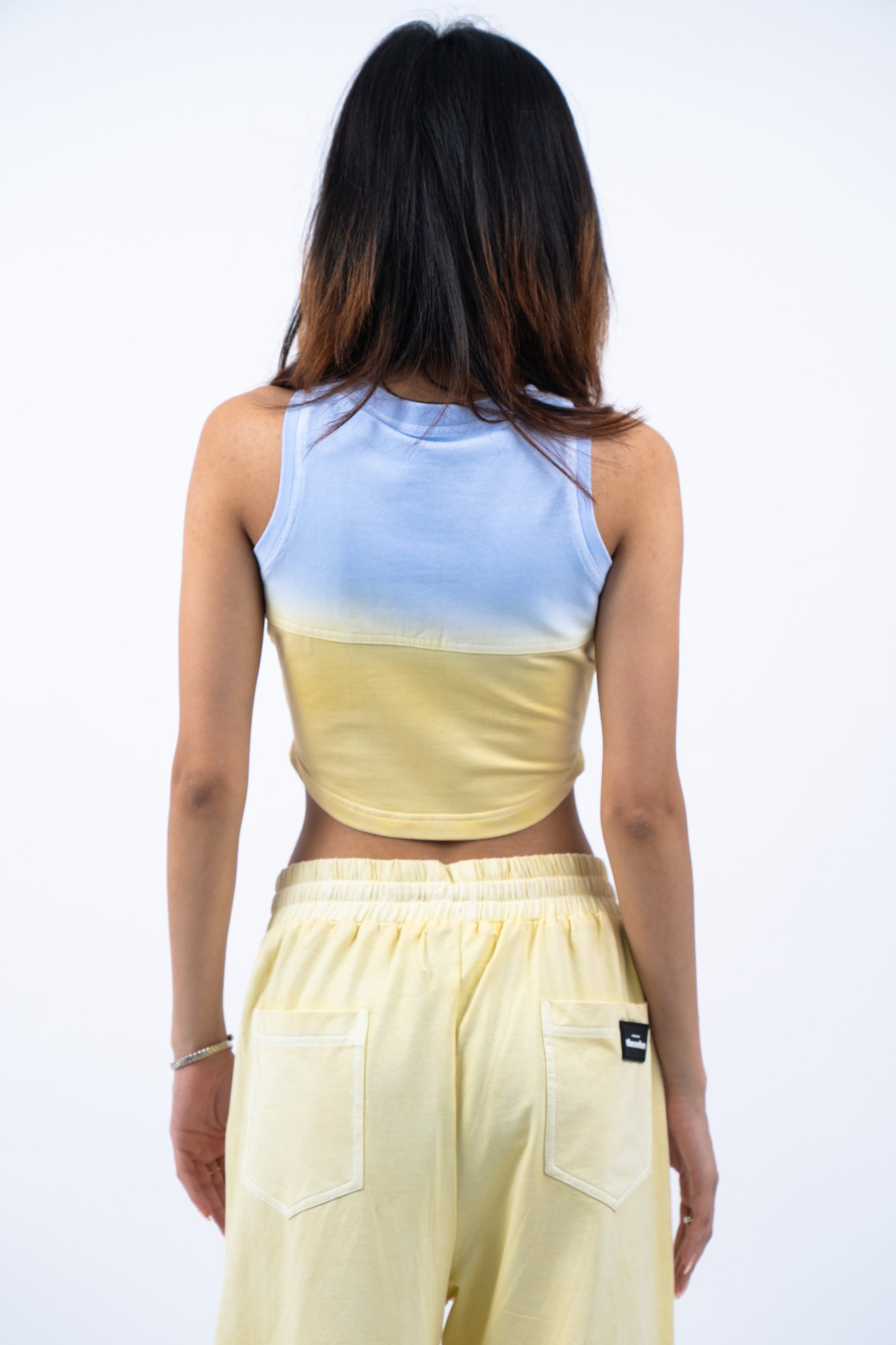 Fitted crop top featuring a unique halter neckline and corset panelling along chest. It is made in a super comfortable cotton terry lycra fabric dyed in a blue and yellow colour through ombre technique in a palette perfect for summer. Signature branding on chest.