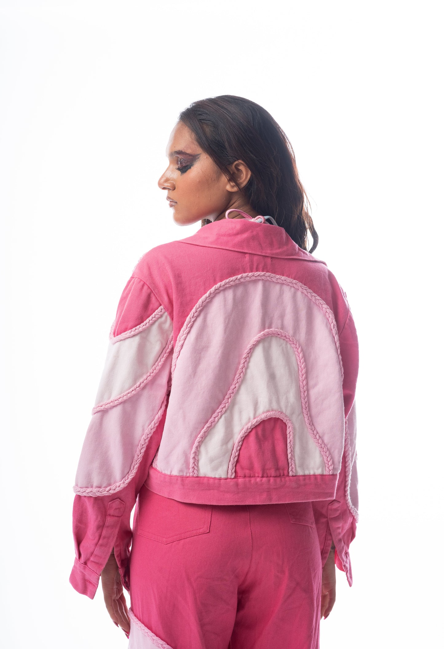 Description – Upgrade your wardrobe with our Pink Cloud Jacket! Made with unique 3-shade denim patchwork, this denim jacket features intricate braided recycled cotton yarn details. Elevate your style with this one-of-a-kind jacket.
