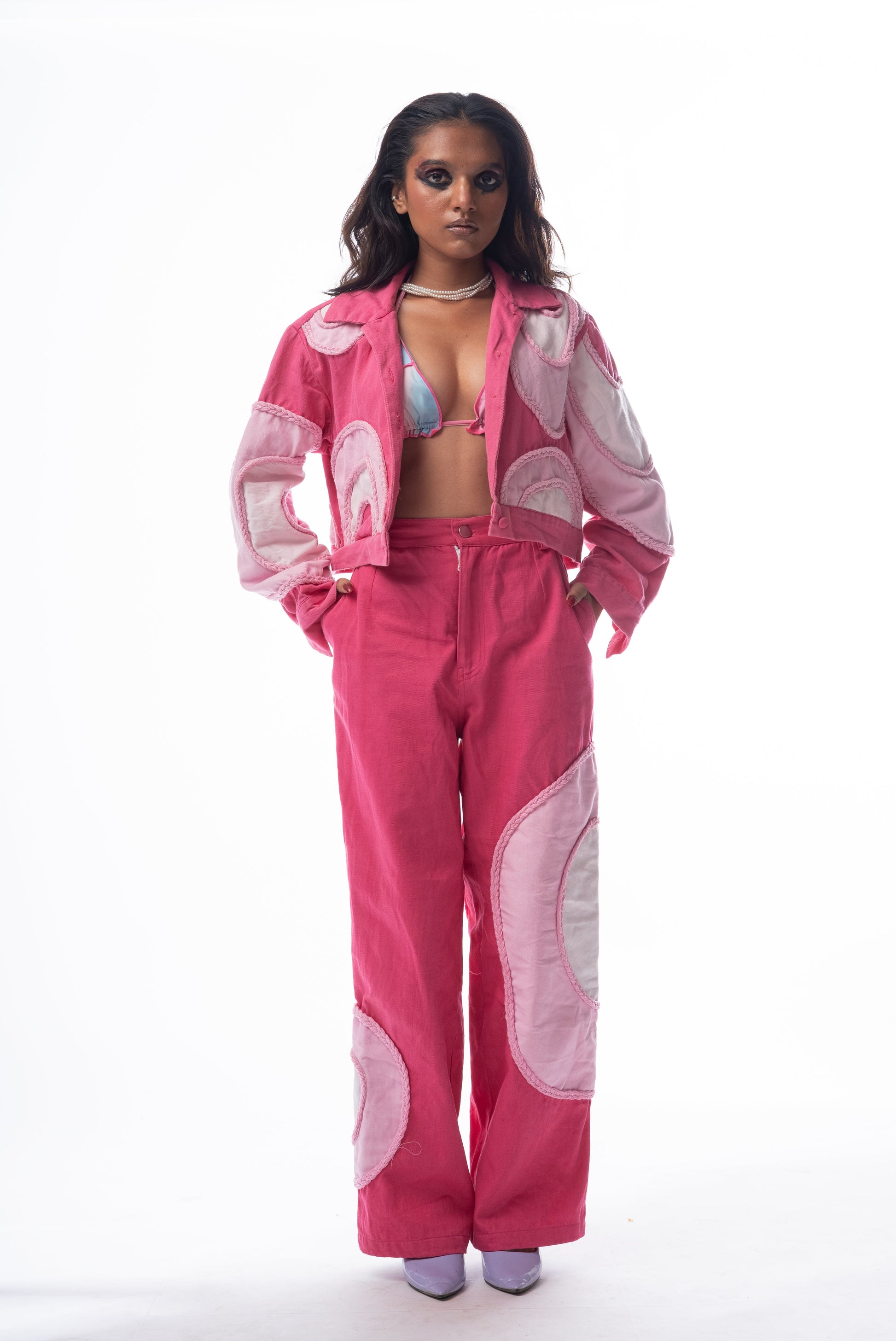 Description – Upgrade your wardrobe with our Pink Cloud Set! Made with unique 3-shade denim patchwork, this denim jacket features intricate braided recycled cotton yarn details, while the matching pants also include braiding details and 3 shades of denim. Elevate your style with this one-of-a-kind co-ord set.
