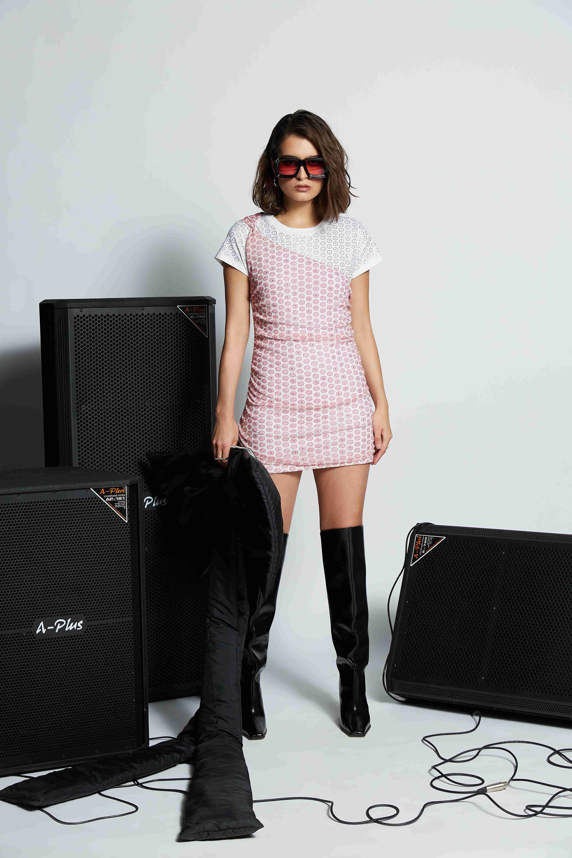 Hand embellished T-shirt dress detailed with Swarovski crystals creating a polka pattern. Juxtaposed with printed draped polka print with contrast Swarovski detailing.
