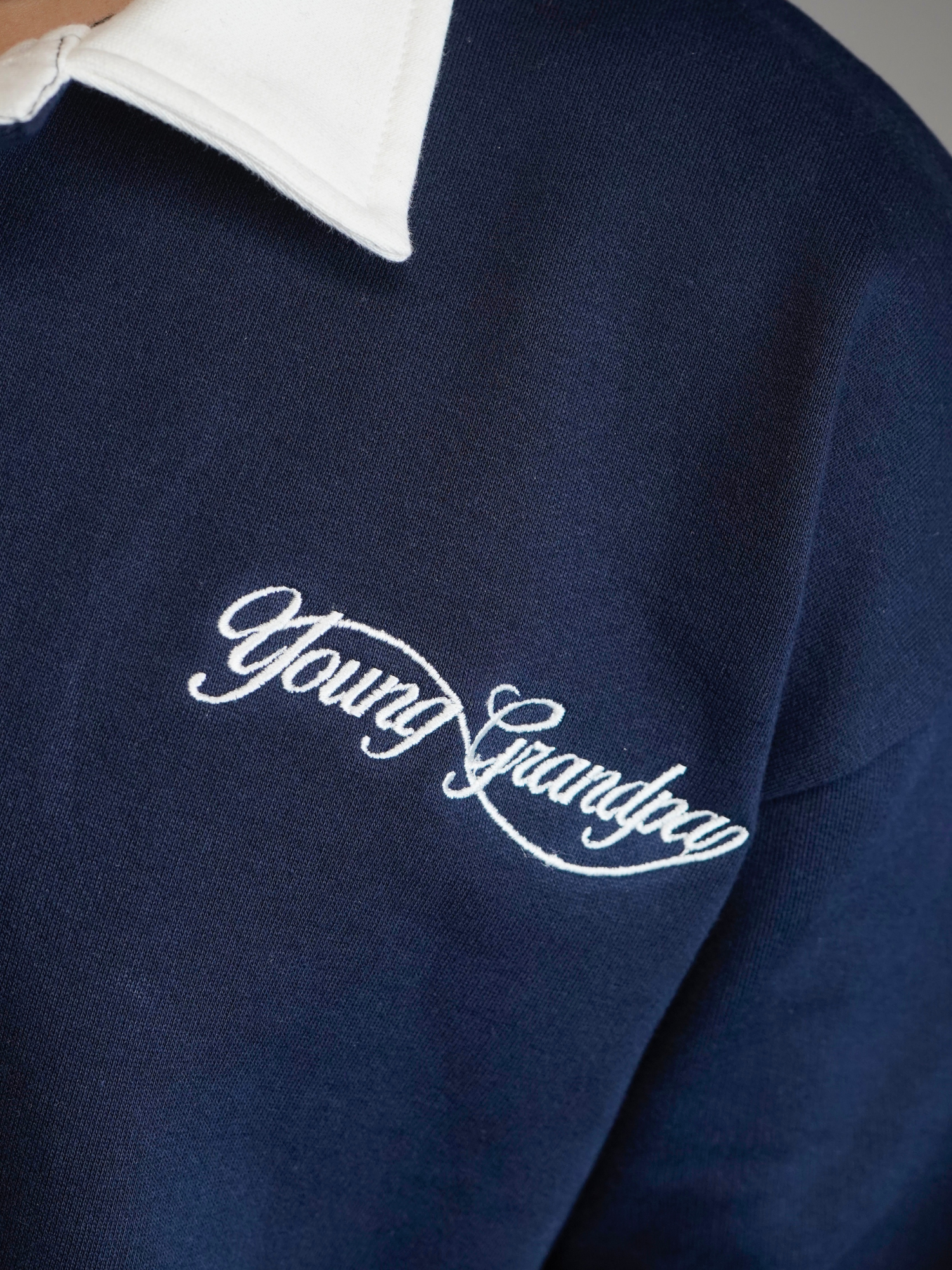 A cursive Young Grandpa logo with an elegant design, where the Y and A are seamlessly connected by flowing lines, resembling the reins of a horse, symbolising freedom and adventure.