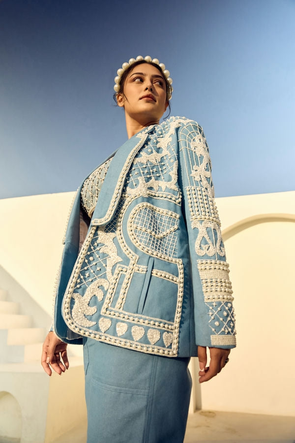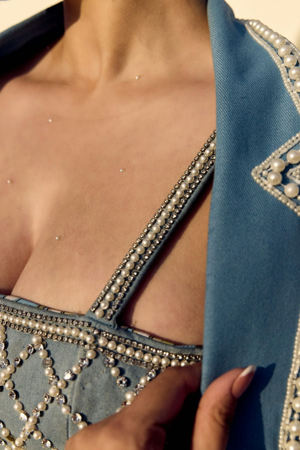 PEARL DENIM BLAZER WITH DENIM TUBE TOP AND DENIM CARGO, Special Finishings: Pearl and cutdana, Lining Material: Satin, Delivery Time: 20 Days, Primary Colour: Blue, Occasion : Party wear, Care Instructions : Dry clean only, Material : Denim, Fit: Semi fit