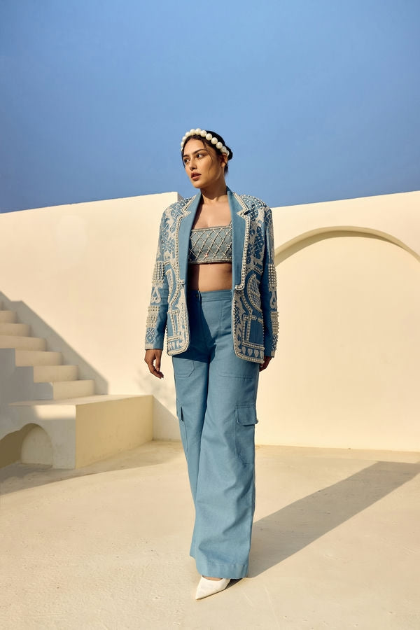 Stylish blue denim pearl blazer paired with cargo pants and a bustier. Perfect for party wear. Comes with a garment cover.