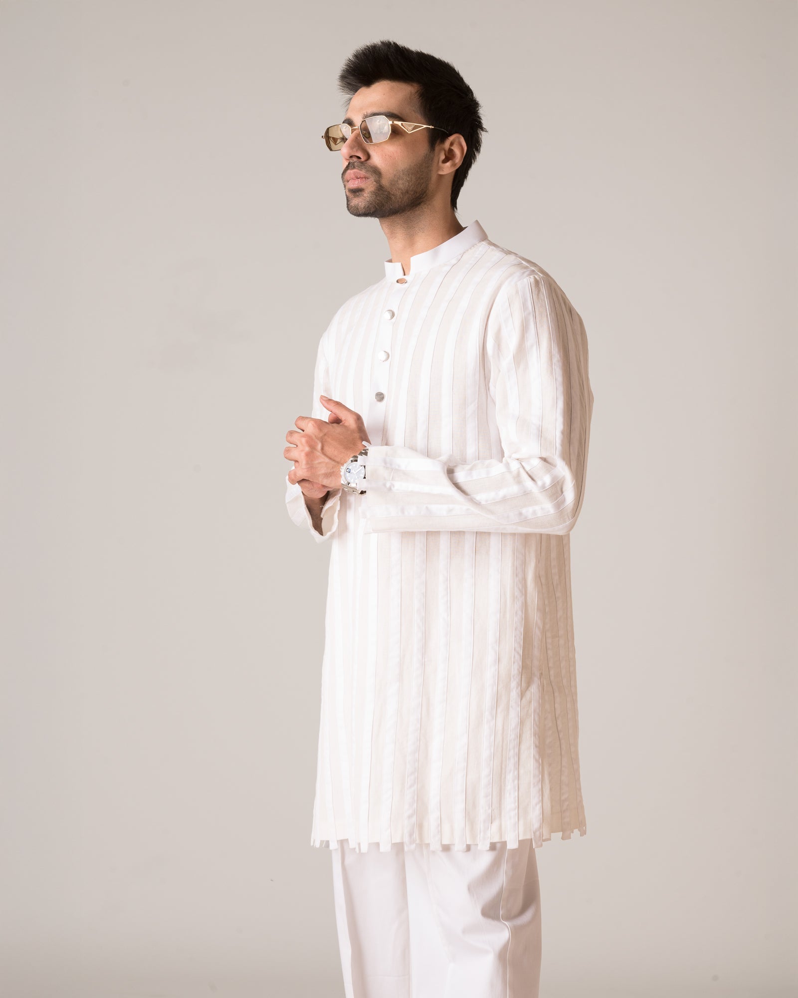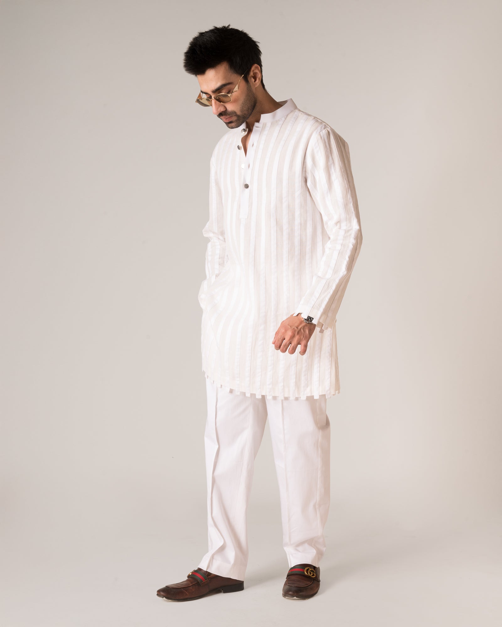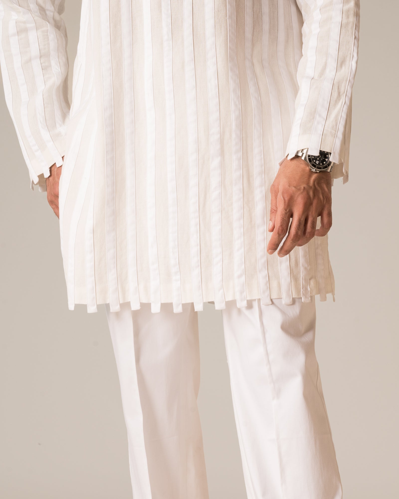 Our Stripe Kurta features white fabric strips stitched precisely on a cotton linen base. It’s simple, sleek, and a little extra where it counts. Perfect for weddings, brunches, or whenever you want to outshine the crowd without trying too hard.